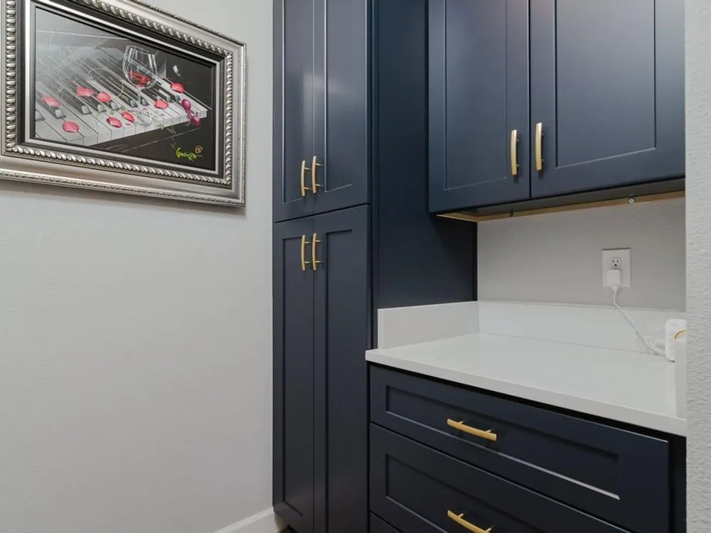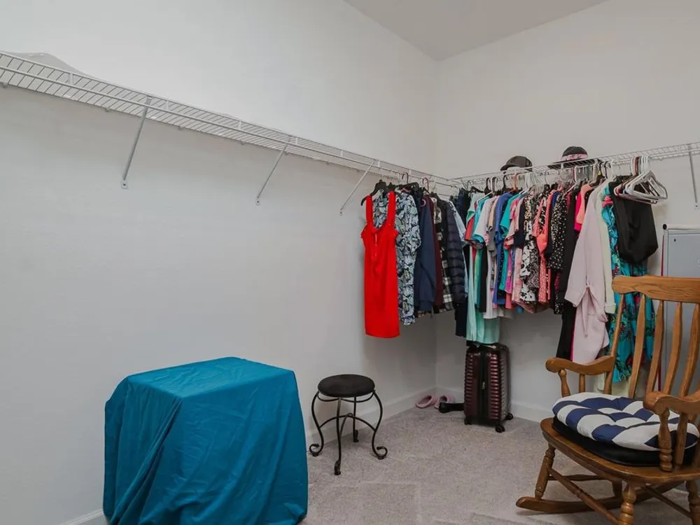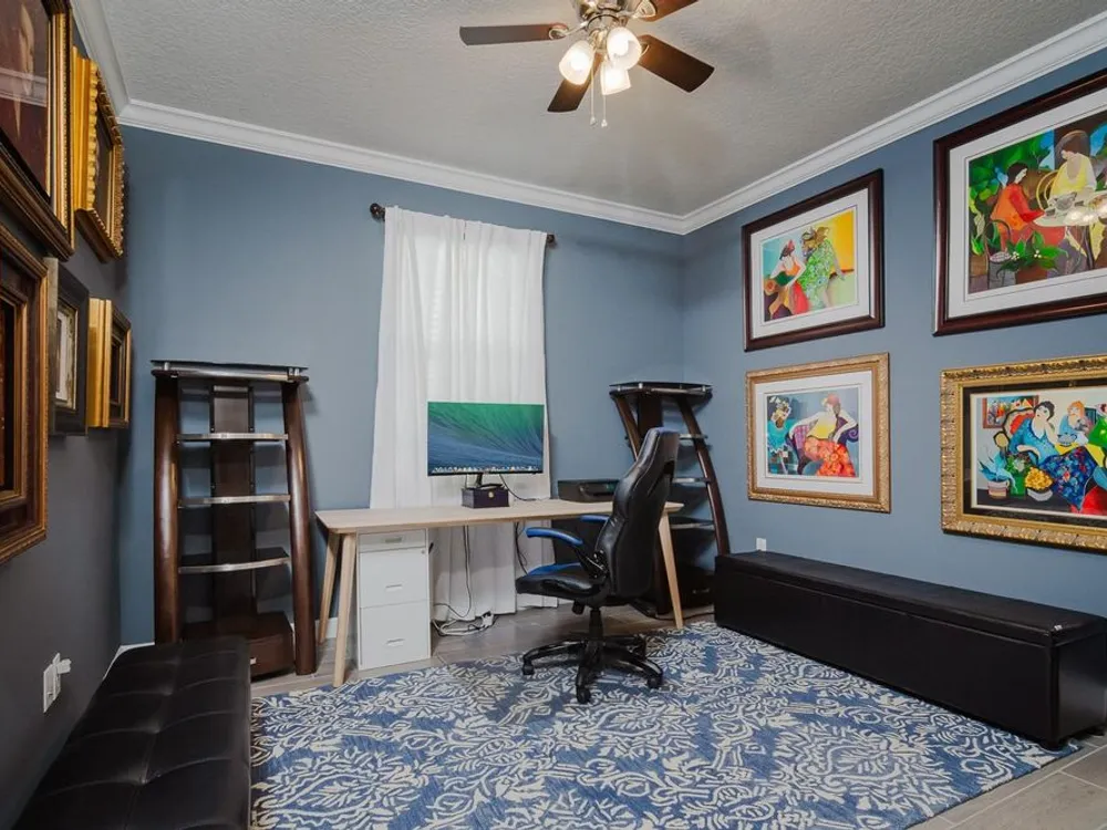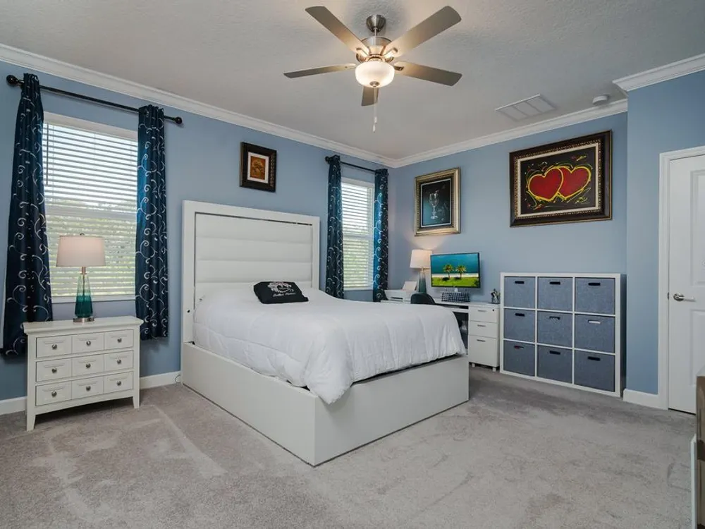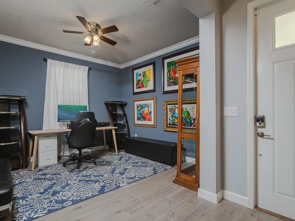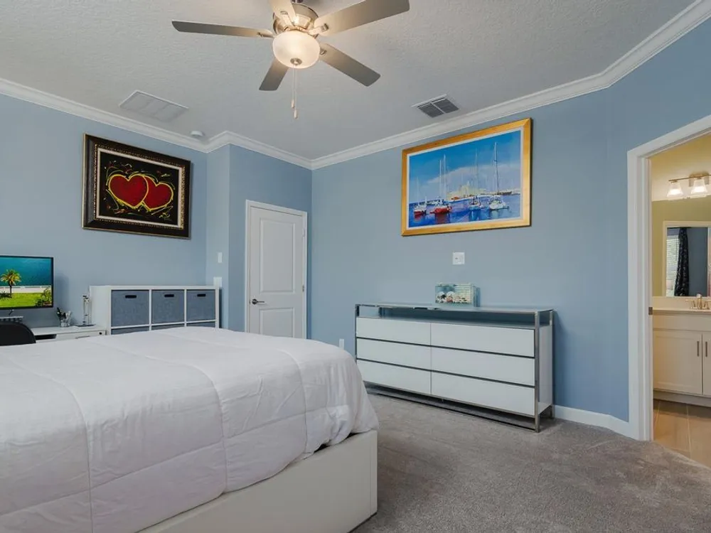 - Ceiling Fan(s), Crown Molding, Open Floorplan, Main Level Primary, Solid Surface Counters, Walk-In Closet(s)