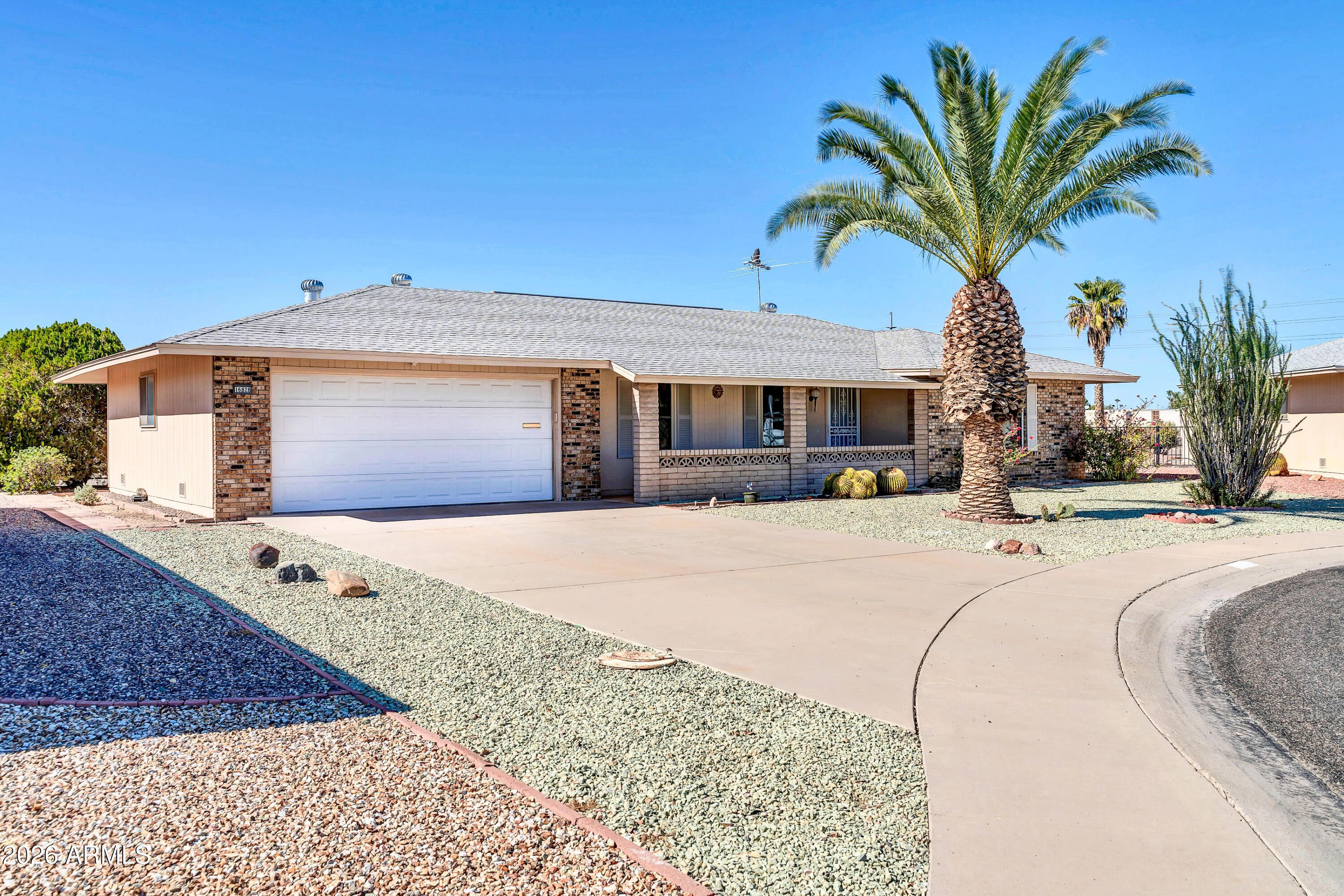 This home is priced to sell! Freshly-painted, move-in ready home in Sun City's 55+ community! Enjoy Arizona living year-round in the permitted Arizona Room, plus a covered and enclosed patio with wall-mounted A/C and an additional screened patio--ideal for relaxing desert evenings. Inside, the home features tile and laminate flooring throughout, sunlit bedrooms, and a primary suite with private bath. Major updates include central heating & cooling (2018), attic insulation (2018), PEX plumbing (2020), water heater (2020), guest bath update (2021), irrigation system (2020), and newer appliances including refrigerator (2019) and microwave (2024). Low-maintenance landscaping and a practical layout let you fully enjoy the community's amenities, from golf to social clubs.