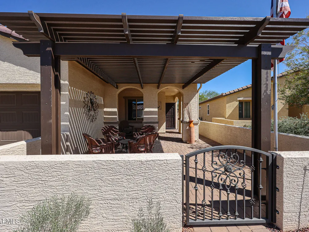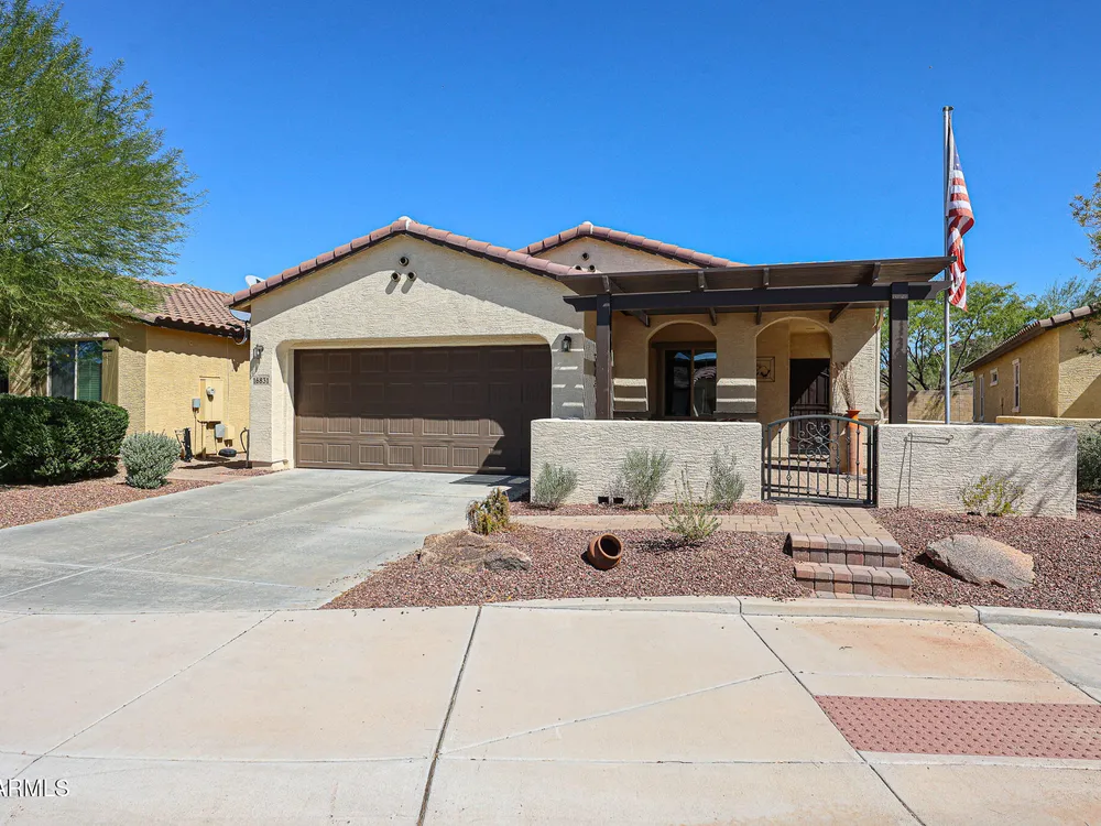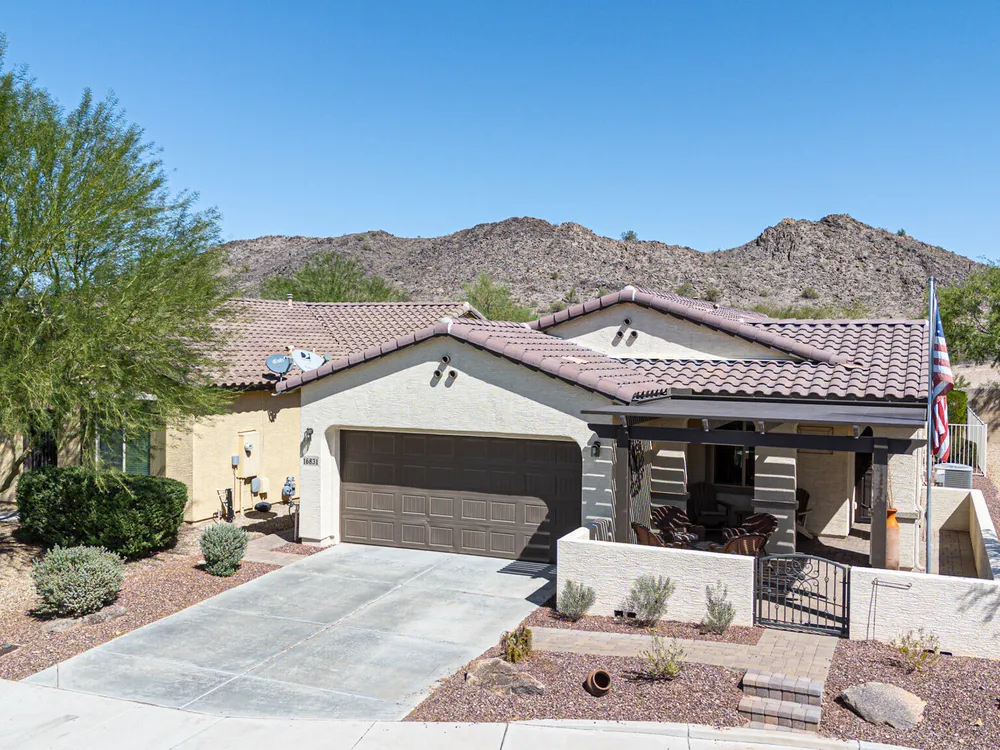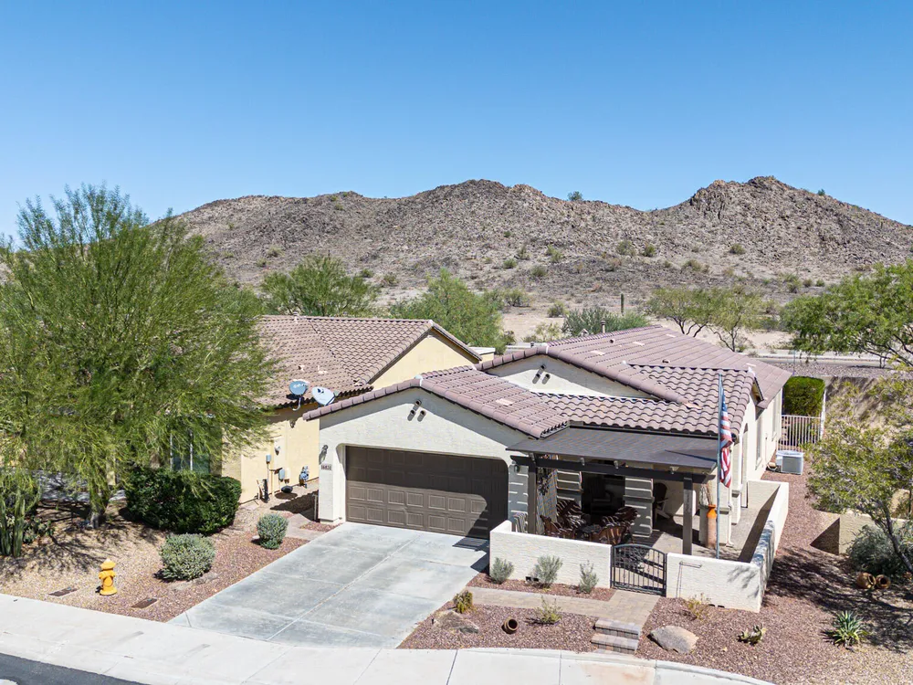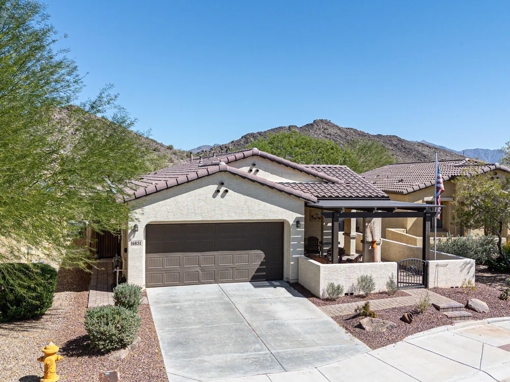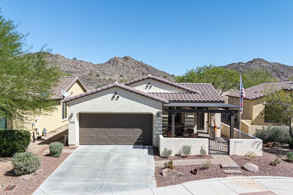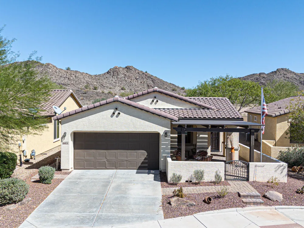 Welcome to your desert retreat with breathtaking mountain views, a fully enclosed backyard, and upgrades at every turn! This beautifully designed Libretto floor plan is perfectly situated in the lake-inspired 55+ active adult community of CantaMia, where relaxation and lifestyle come together. Step inside and discover a light, airy space featuring a neutral soft-gray color palette, white cabinetry, and granite countertops that blend modern elegance with low-maintenance living. Tile flooring throughout keeps the home cool, clean, and cohesive, while the open layout makes entertaining a breeze. The split floor plan offers privacy for guests, and the spacious den/flex room with French doors provides the perfect spot for an office, studio, or cozy reading nook. Out front, you'll love the welcoming courtyard with brick pavers, an iron gate, and a pergola for added shade - perfect for morning coffee or chatting with neighbors. The garage offers built-in cabinets and a water softener for added convenience and organization. Step into the backyard oasis, where you'll find a large covered patio, extended paver seating area, and cozy firepit, all perfectly positioned to enjoy serene mountain views. The nicely sized, fully enclosed yard creates a private retreat ideal for relaxing, entertaining, or simply soaking in the beauty of your surroundings. Living in CantaMia means every day feels like a getaway. Enjoy access to sparkling community lakes, scenic walking trails, a state-of-the-art fitness center, indoor and outdoor pools, pickleball and tennis courts, and a vibrant calendar of social events and clubs. Whether you're relaxing at home or out enjoying the community, this home offers the perfect balance of comfort, style, and connection. Don't miss your chance to experience the CantaMia lifestyle.
