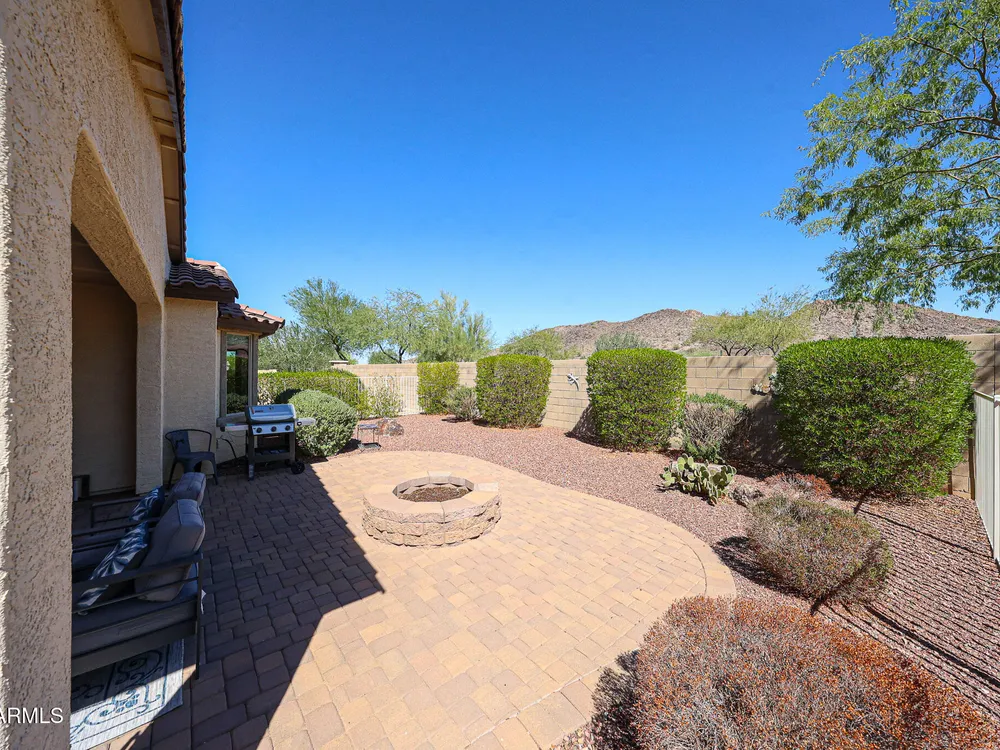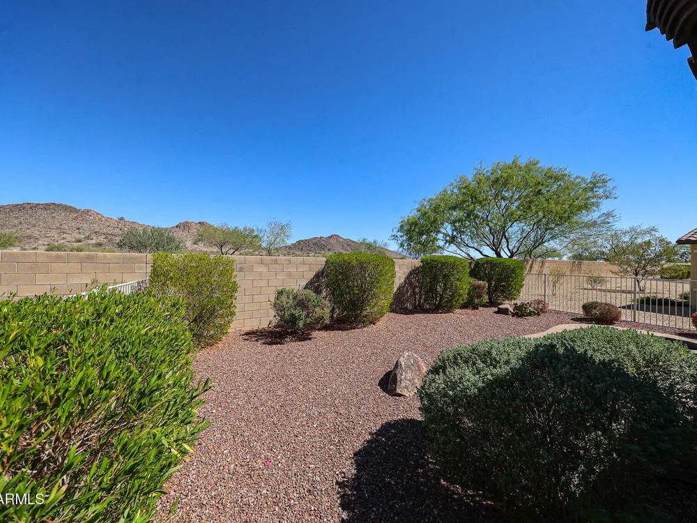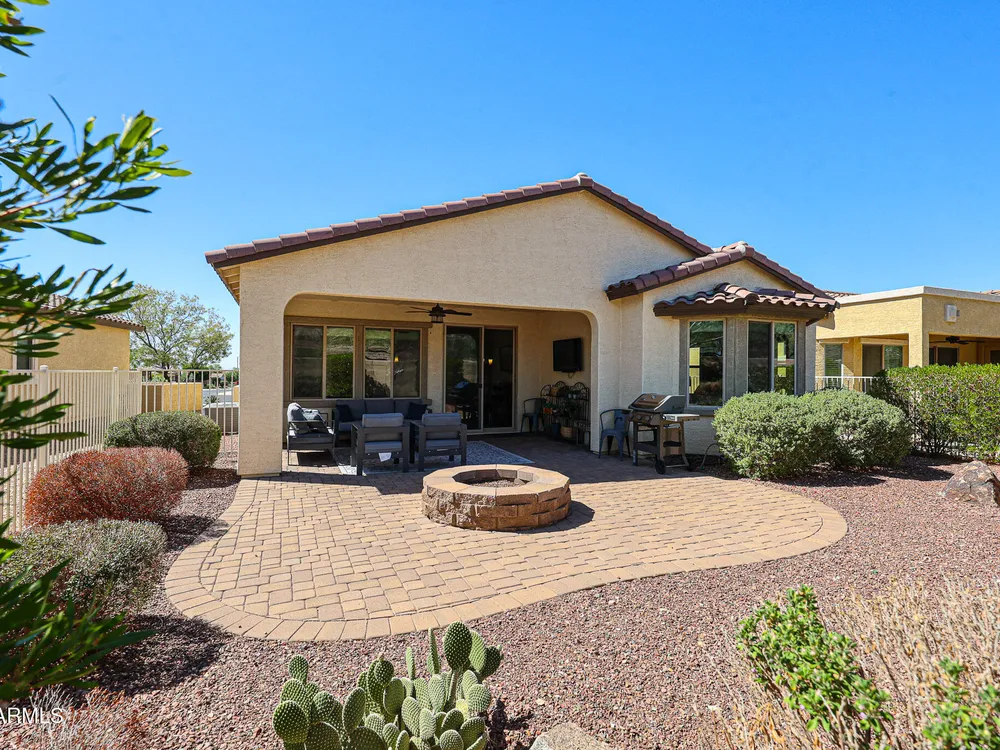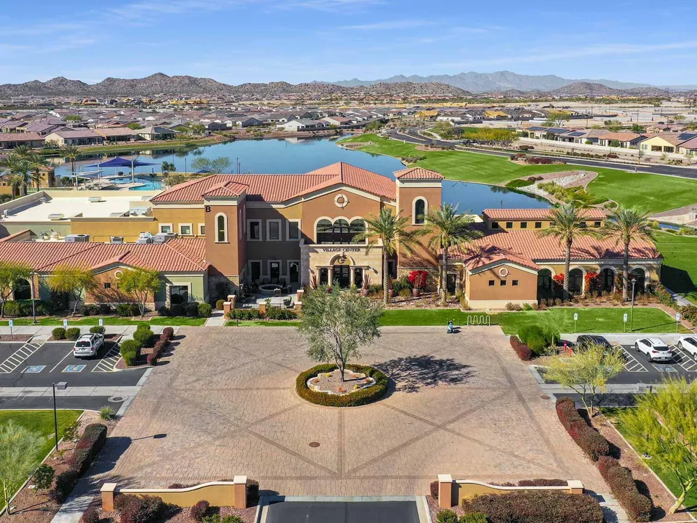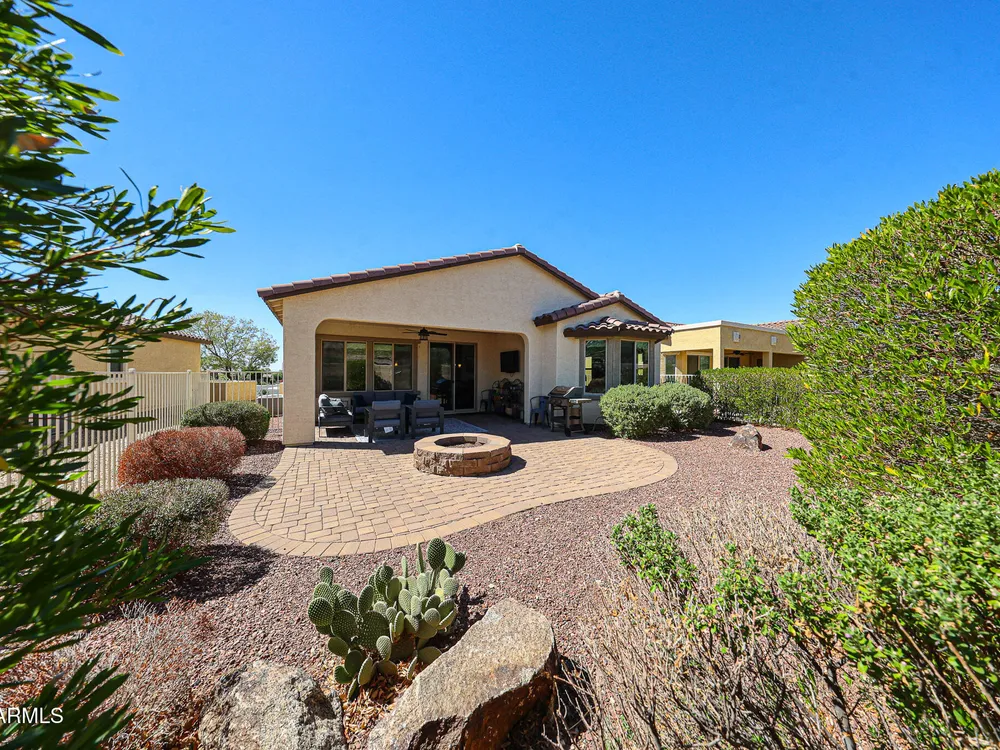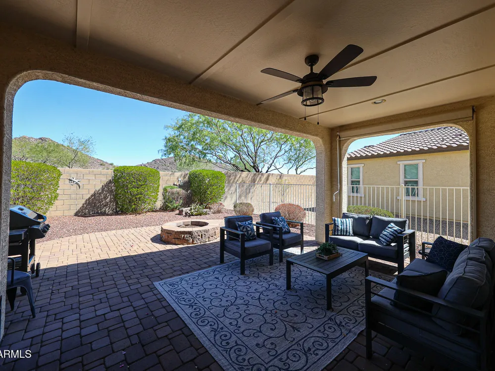 Welcome to your desert retreat with breathtaking mountain views, a fully enclosed backyard, and upgrades at every turn! This beautifully designed Libretto floor plan is perfectly situated in the lake-inspired 55+ active adult community of CantaMia, where relaxation and lifestyle come together. Step inside and discover a light, airy space featuring a neutral soft-gray color palette, white cabinetry, and granite countertops that blend modern elegance with low-maintenance living. Tile flooring throughout keeps the home cool, clean, and cohesive, while the open layout makes entertaining a breeze. The split floor plan offers privacy for guests, and the spacious den/flex room with French doors provides the perfect spot for an office, studio, or cozy reading nook. Out front, you'll love the welcoming courtyard with brick pavers, an iron gate, and a pergola for added shade - perfect for morning coffee or chatting with neighbors. The garage offers built-in cabinets and a water softener for added convenience and organization. Step into the backyard oasis, where you'll find a large covered patio, extended paver seating area, and cozy firepit, all perfectly positioned to enjoy serene mountain views. The nicely sized, fully enclosed yard creates a private retreat ideal for relaxing, entertaining, or simply soaking in the beauty of your surroundings. Living in CantaMia means every day feels like a getaway. Enjoy access to sparkling community lakes, scenic walking trails, a state-of-the-art fitness center, indoor and outdoor pools, pickleball and tennis courts, and a vibrant calendar of social events and clubs. Whether you're relaxing at home or out enjoying the community, this home offers the perfect balance of comfort, style, and connection. Don't miss your chance to experience the CantaMia lifestyle.