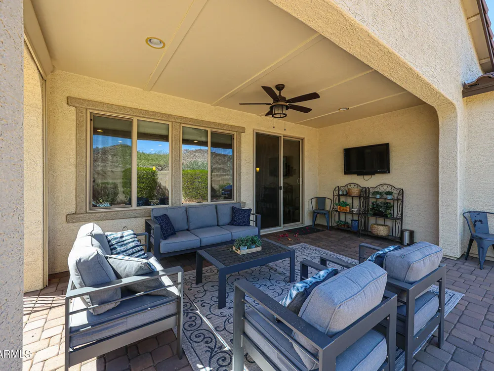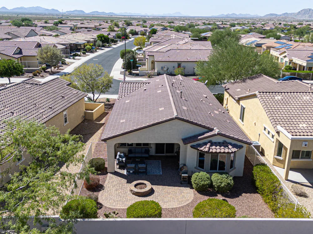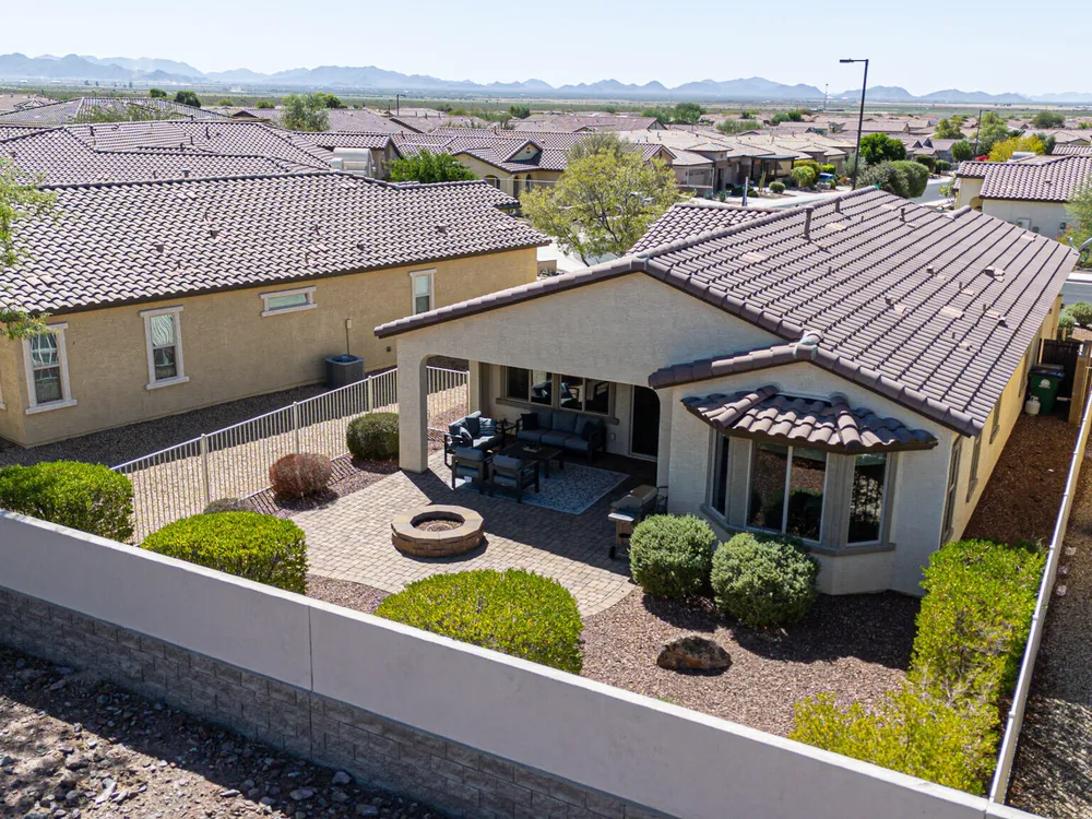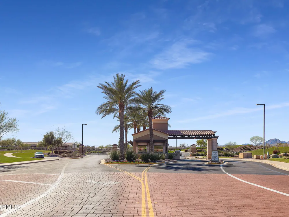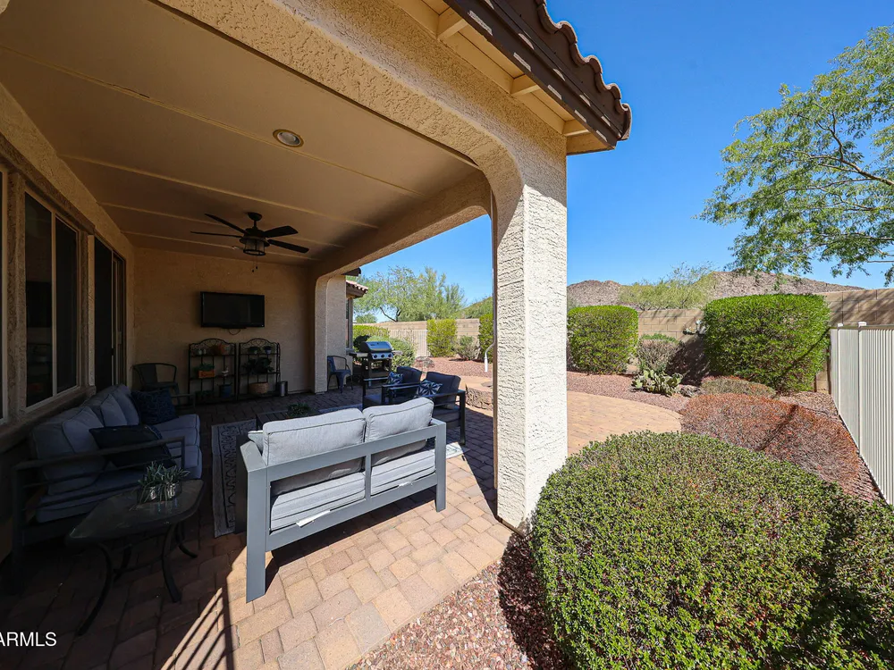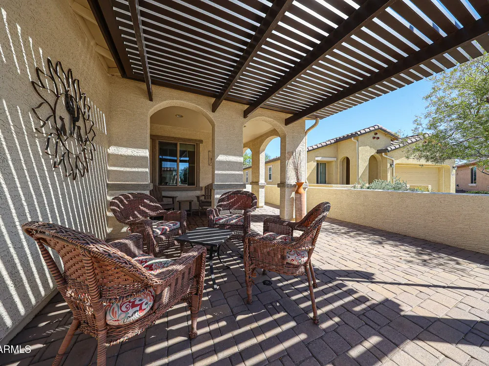 Welcome to your desert retreat with breathtaking mountain views, a fully enclosed backyard, and upgrades at every turn! This beautifully designed Libretto floor plan is perfectly situated in the lake-inspired 55+ active adult community of CantaMia, where relaxation and lifestyle come together. Step inside and discover a light, airy space featuring a neutral soft-gray color palette, white cabinetry, and granite countertops that blend modern elegance with low-maintenance living. Tile flooring throughout keeps the home cool, clean, and cohesive, while the open layout makes entertaining a breeze. The split floor plan offers privacy for guests, and the spacious den/flex room with French doors provides the perfect spot for an office, studio, or cozy reading nook. Out front, you'll love the welcoming courtyard with brick pavers, an iron gate, and a pergola for added shade - perfect for morning coffee or chatting with neighbors. The garage offers built-in cabinets and a water softener for added convenience and organization. Step into the backyard oasis, where you'll find a large covered patio, extended paver seating area, and cozy firepit, all perfectly positioned to enjoy serene mountain views. The nicely sized, fully enclosed yard creates a private retreat ideal for relaxing, entertaining, or simply soaking in the beauty of your surroundings. Living in CantaMia means every day feels like a getaway. Enjoy access to sparkling community lakes, scenic walking trails, a state-of-the-art fitness center, indoor and outdoor pools, pickleball and tennis courts, and a vibrant calendar of social events and clubs. Whether you're relaxing at home or out enjoying the community, this home offers the perfect balance of comfort, style, and connection. Don't miss your chance to experience the CantaMia lifestyle.