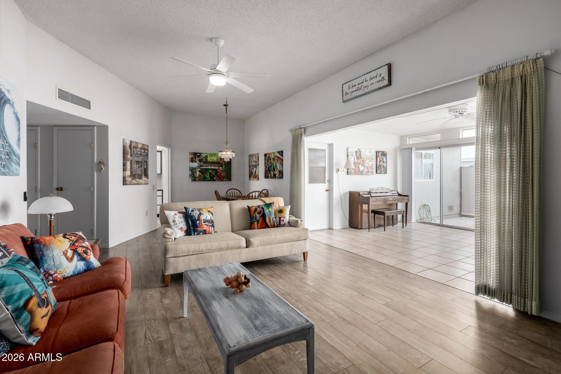 Move-in ready condo looking for a new owner! Enter to see open common areas showcasing tile and laminate flooring, neutral paint, and abundant natural light. The eat-in kitchen is equipped with built-in appliances, ample counters, and a pantry for added storage. The Arizona room includes sliding glass doors that lead to the backyard, creating a seamless indoor-outdoor flow! Cozy main bedroom provides a makeup vanity, a walk-in closet, and its own private bathroom. Additional highlights include a garage laundry area with plenty of cabinetry for organization. In the backyard, enjoy a flagstone patio for relaxing or entertaining. 55+ community amenities include a clubhouse, pool, tennis, golf, and more. This is the perfect retirement home for you! **Furniture included outside of Escrow**