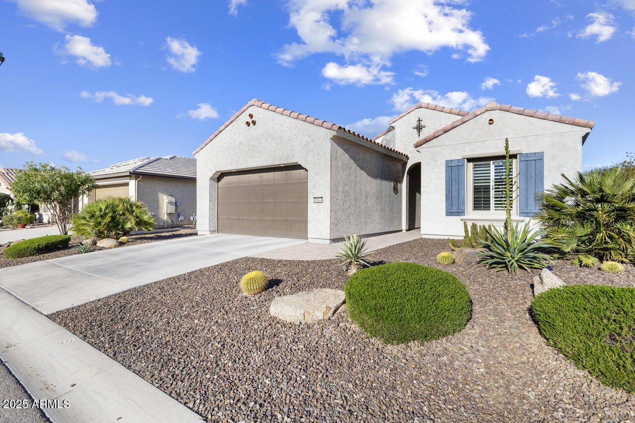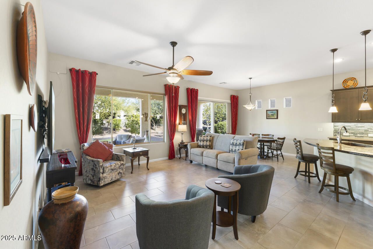 Perfect home for the ''Snowbirds'' desiring an easy maintenance home, newer and an alternative to Villa living. Backyard overlooks a mature landscaped common area, spacious covered patio with pavers, faux grass and citrus trees!! Easy access to outdoor living from dining/great room. The open floor plan creates great spaces to entertain and features a kitchen island allowing the host/hostess to always be a part of the fun!! All appliances are included and provides plenty of cabinets and counter space. Owners' suite has great views of the backyard, vanity with under cabinet lighting and dual sinks, walk-in closet. Home offers 1 additional bedroom and a den that can easily be used as a bedroom with guest bath conveniently located close to both rooms. Laundry room with washer and dryer included. You will spend most of your "AZ living" enjoying while relaxing and entertaining on your covered patio and views of the comon areas (which is the HOA's responsibilities) Sorry, the patio furniture will not be available. The home also provides a 2-car attached garage. PebbleCreek is an award winning Adult community offering amenities like no other!! 3 - 18 hole golf courses, tournament style Pickleball courts, tennis, 3 swimming pools, restaurants/bars, bocce ball, over 200 clubs!!