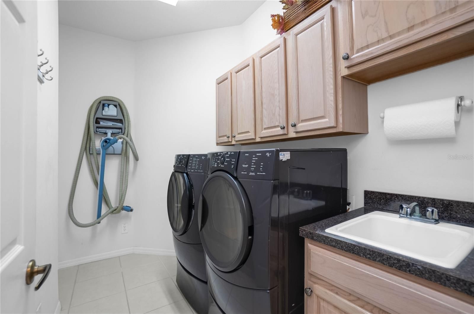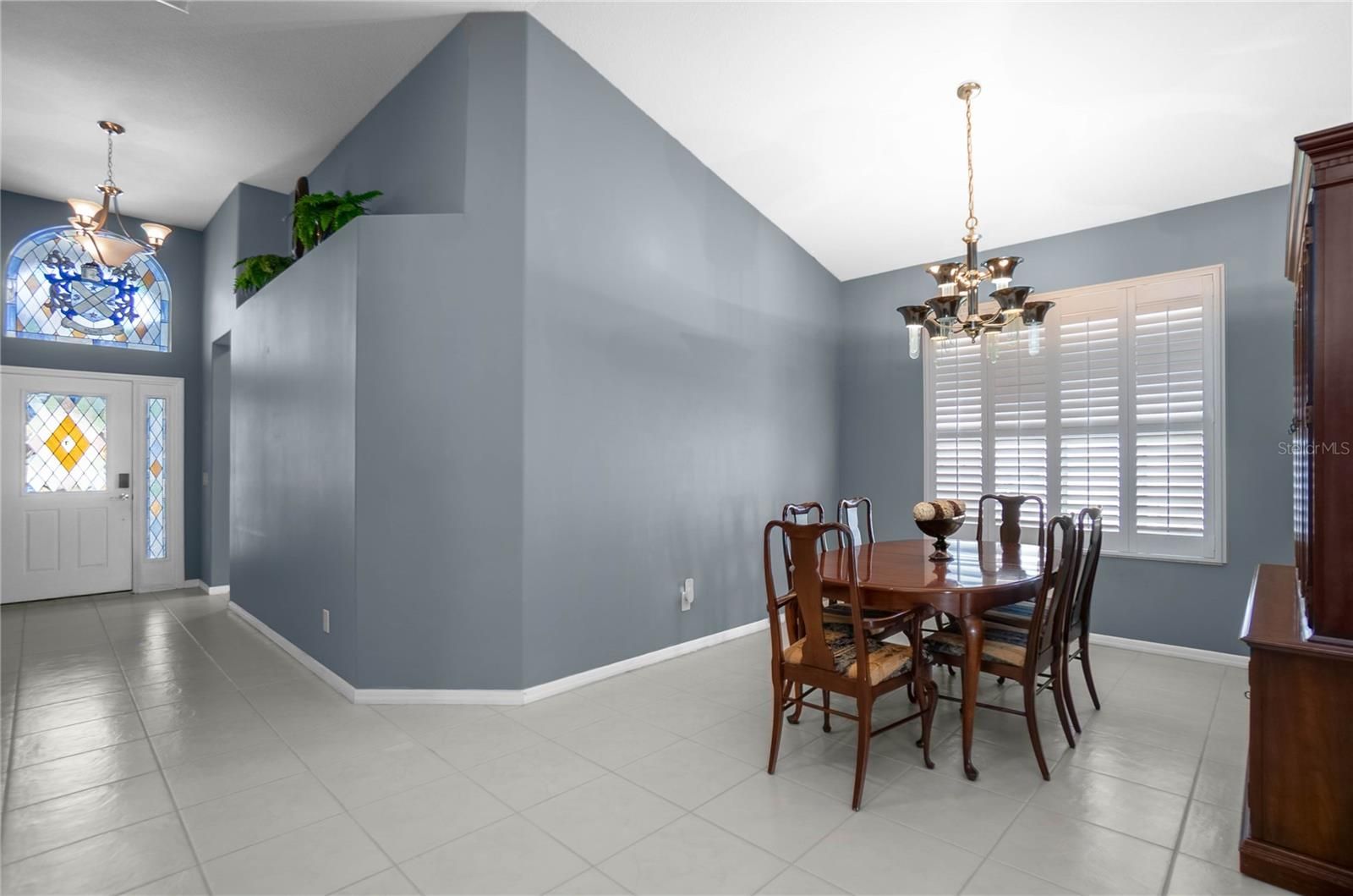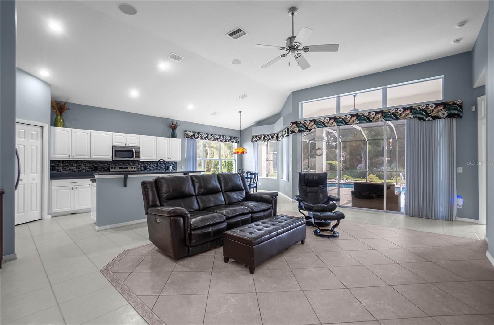 - Cathedral Ceiling(s), Central Vacuum, Eat-in Kitchen, High Ceilings, Kitchen/Family Room Combo, Open Floorplan, Main Level Primary, Solid Surface Counters, Solid-Wood Cabinets, Window Treatments