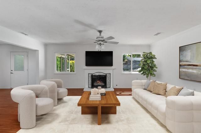 Welcome to one of the most spacious single-story homes in the desirable Seven Oaks community. With 2,208 sq ft, this well-maintained residence offers four bedrooms plus a sunroom and two bathrooms—providing flexibility for everyday living, guests, or hobbies. The home is filled with natural light and features ceiling fans in every room. The primary suite includes a dual-sided fireplace, spa-style bathroom, and large walk-in closet. The kitchen is equipped with stainless steel appliances, and a separate indoor laundry room adds everyday convenience. Additional highlights include owned solar for energy efficiency and a finished two car garage with epoxy flooring. The backyard is spacious and low-maintenance, with mountain views, a covered patio, and an air-conditioned sunroom ideal for year-round enjoyment. Seven Oaks residents enjoy access to a wide range of amenities, including a pool, spa, pickleball courts, clubs, and social activities. Conveniently located near shopping, dining, Bernardo Winery, Oaks North Golf Course, and easy access to I-15. Low HOA fee and no Mello-Roos. With its generous layout, thoughtful features, and excellent value, this home is a standout opportunity in Seven Oaks.