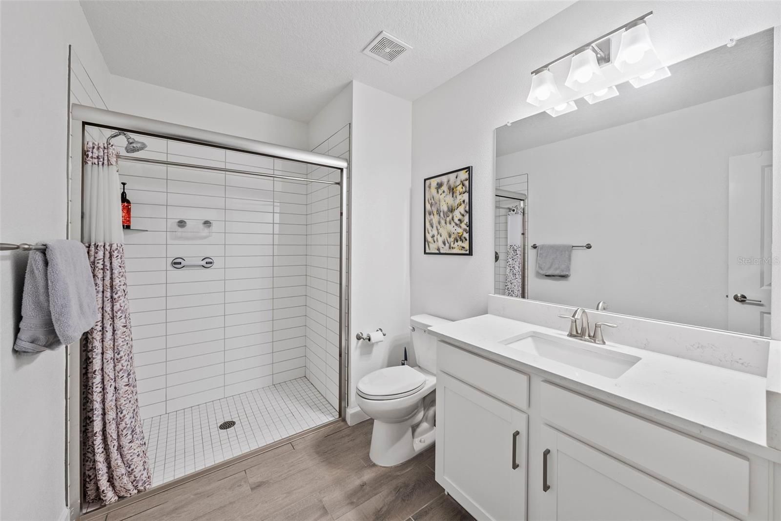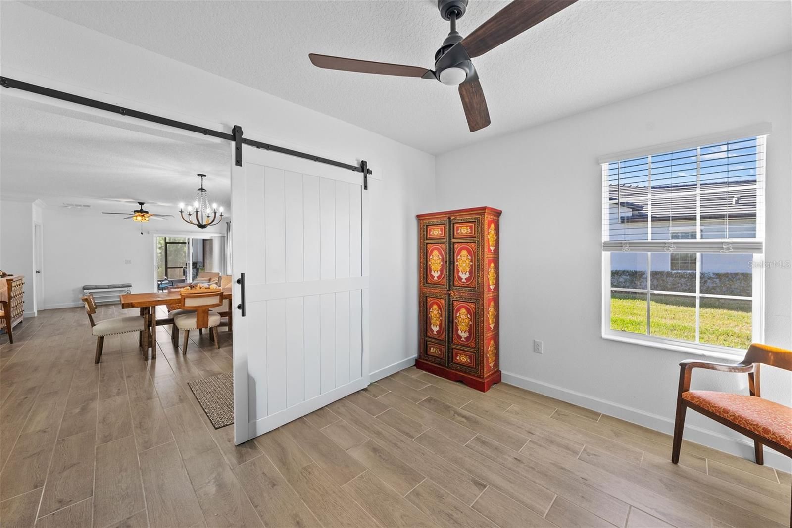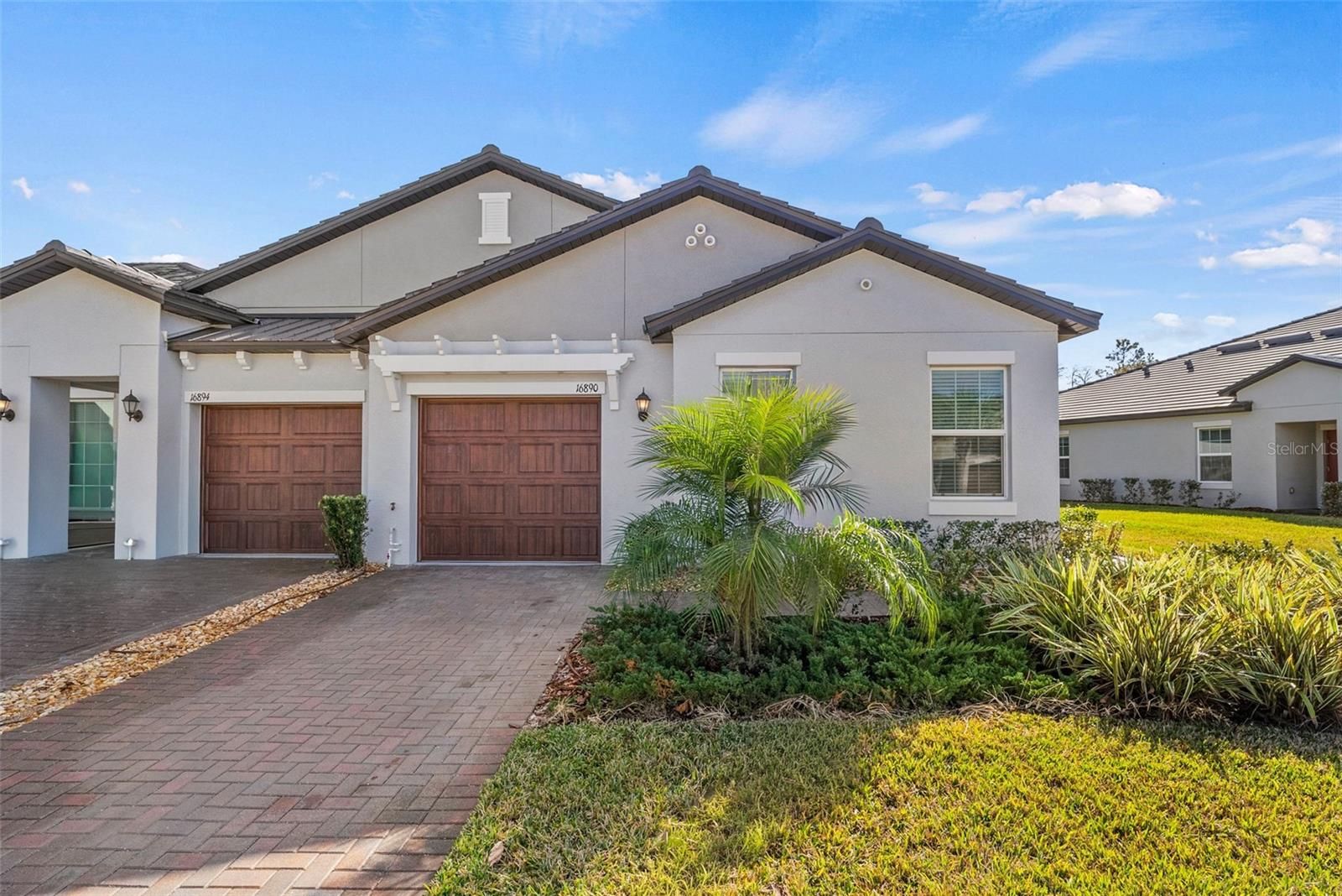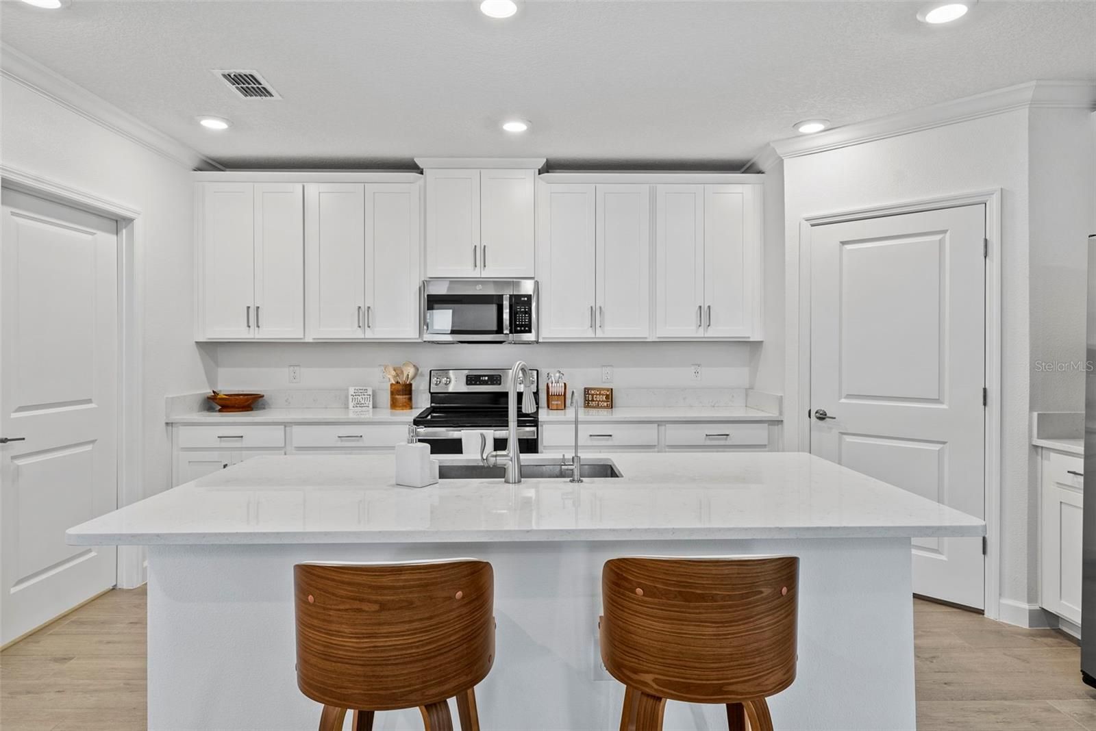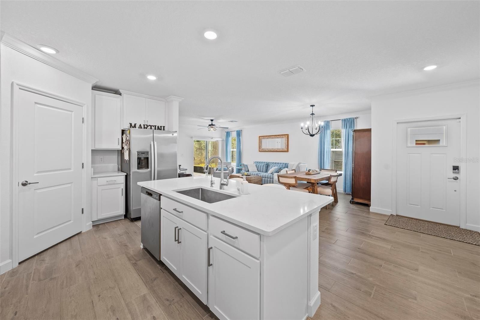 Not your typical 55+ community, The Angeline offers a refined balance of peaceful, private living with an active clubhouse just steps from home. Amenities include a poolside bar and cafe, an elegantly designed pool, fitness center, pickleball and bocce courts, shuffleboard, billiards, and a thoughtfully curated calendar of classes and social clubs. This immaculate 2-bedroom, 2-bath end unit is the only one of its kind currently on the market and offers a truly move-in-ready opportunity. The interior has been intentionally left neutral, with no added paint or backsplash, creating a clean, blank canvas for personal customization. A well-appointed flex room with a barn door provides privacy and versatility for a home office, den, or guest retreat. Notable features include a whole-home water filtration system, reverse osmosis at the kitchen sink, a statement fandelier in the primary bedroom, updated ceiling fans throughout, and a custom wooden chandelier in the dining area.