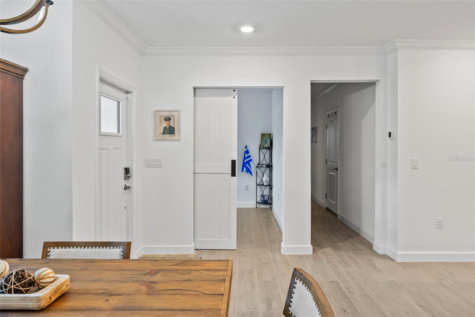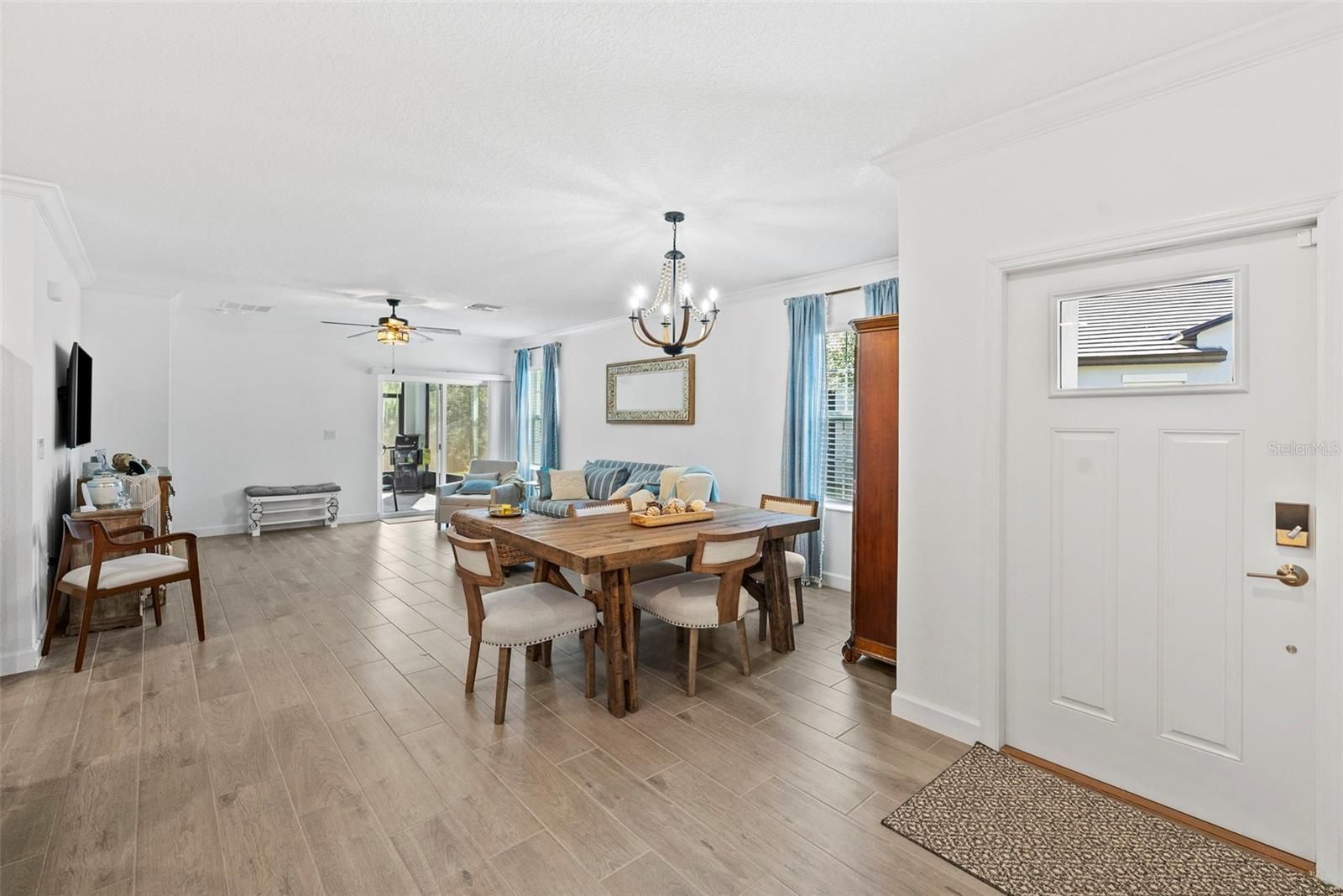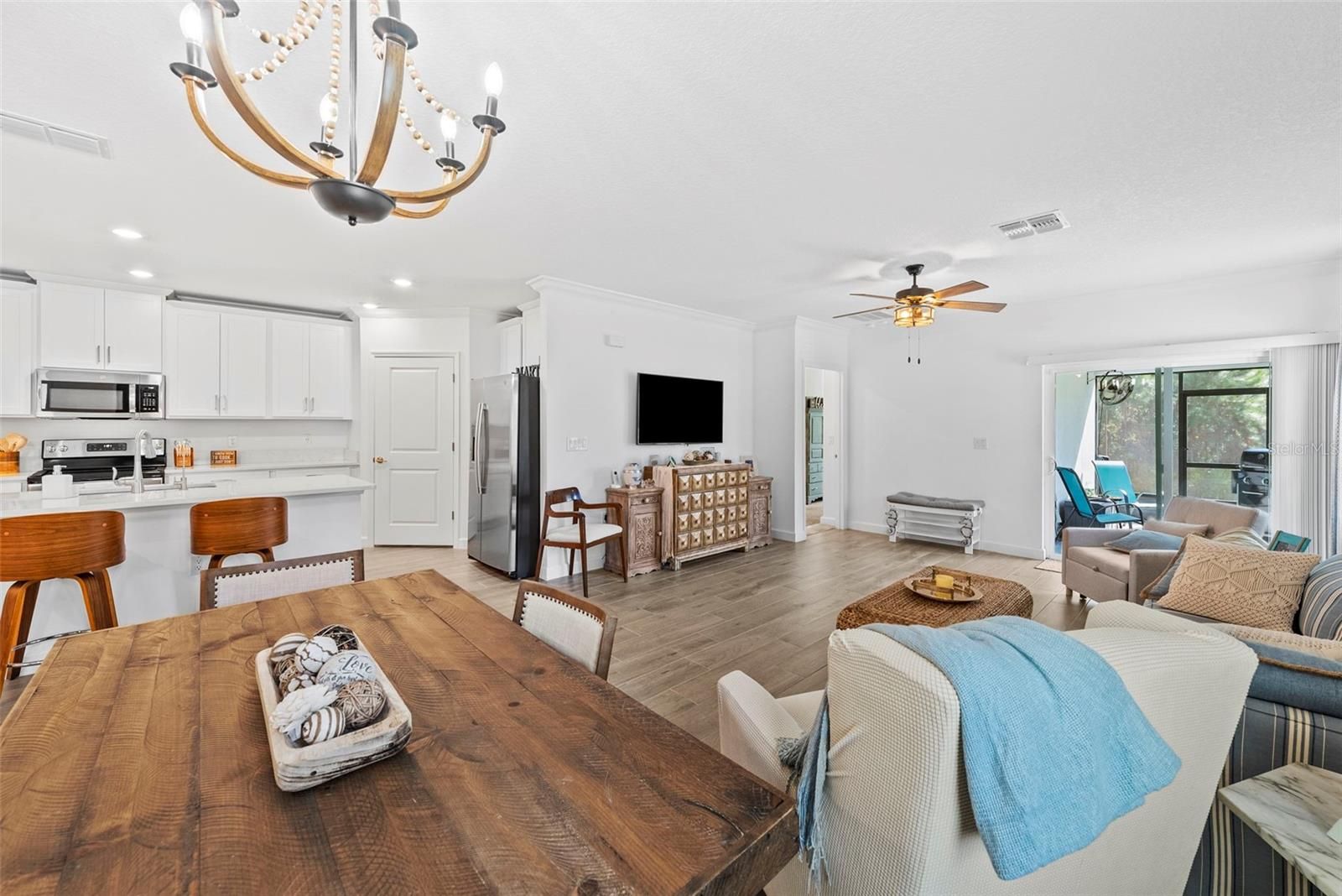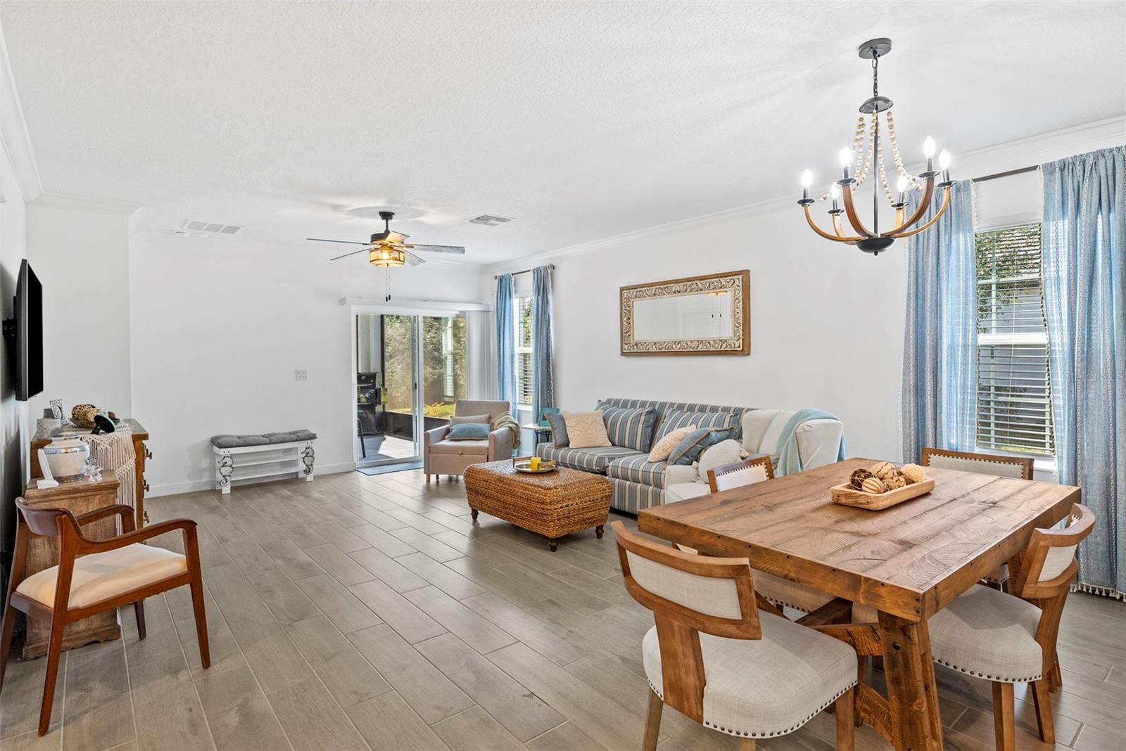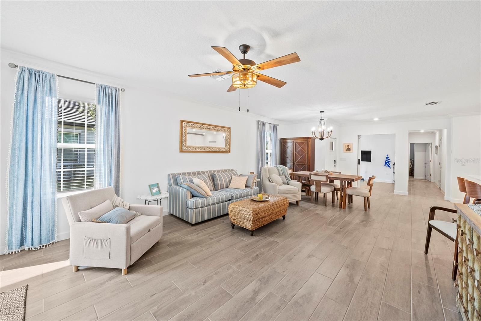 - Ceiling Fan(s), Crown Molding, Living/Dining Room, Open Floorplan, In-Wall Pest Control, Main Level Primary, Walk-In Closet(s)