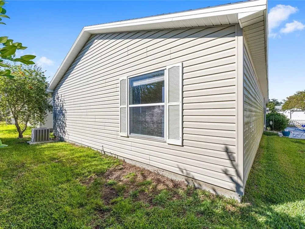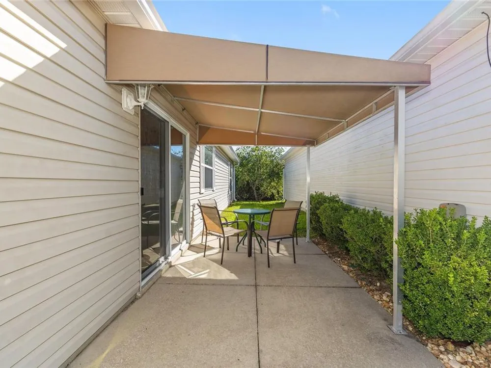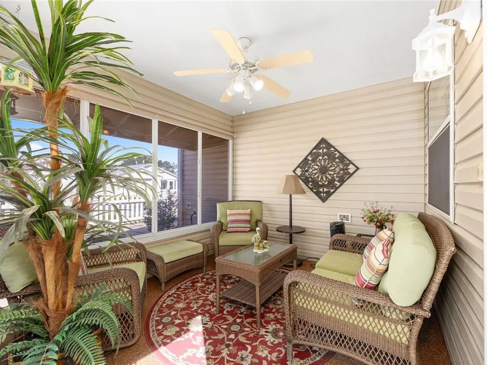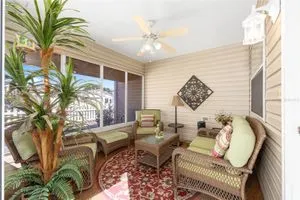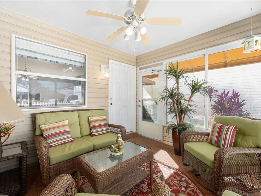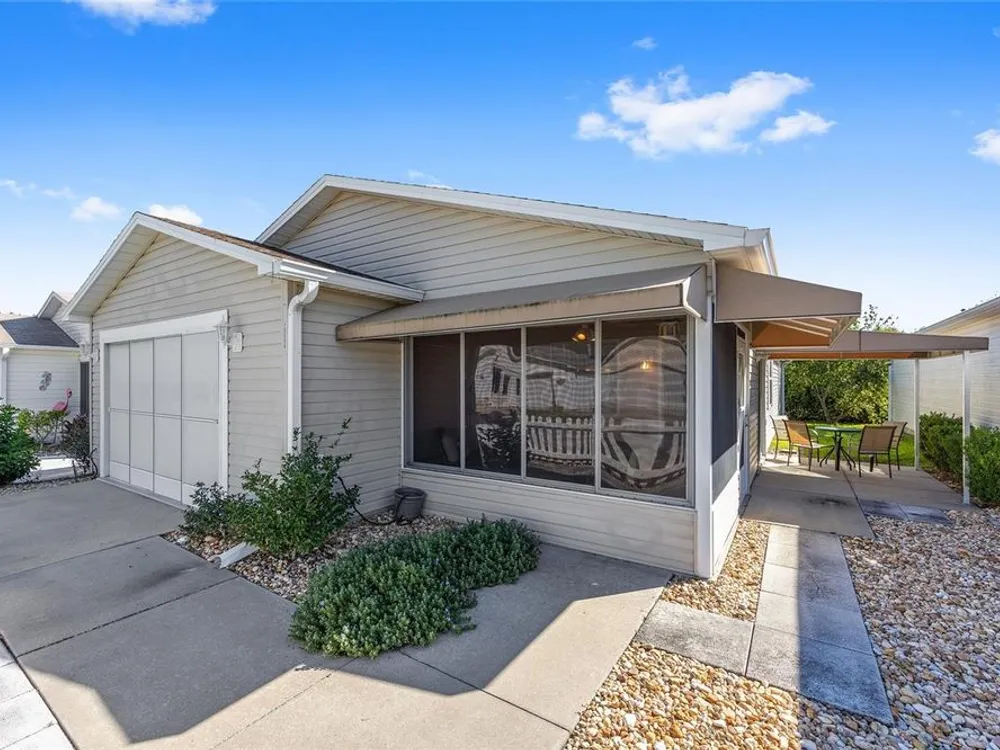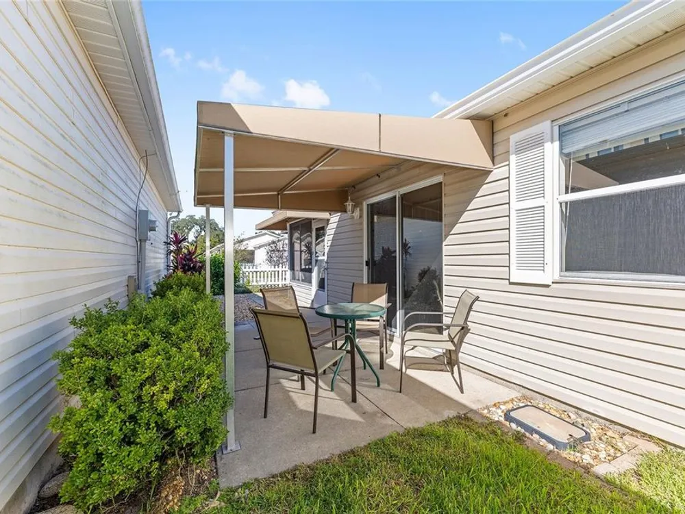 Welcome to this Beautiful TURNKEY Colony Villa in the Villa of Sunnyside in The Village of Woodbury. Close to Shopping and Recreation! BOND PAID! The Exterior Greats you with Awnings over front and side Patio Areas with Privacy in the Rear and Lovely Rock Mulch Garden Beds! The Front Lanai/Florida Room is Enclosed with Acrylic Windows and Privacy Shades! All the Wonderful Furnishings Stay! The Open Concept is Very Comforting! Dining, Living Room and Kitchen are Open for Great Entertaining! A Sliding Door in Dining Area Offers Easy Access to the Covered Side Patio! The Kitchen has Quartz Countertops, Reverse Osmosis with tap at Sink, Stainless Steel Sink with Gooseneck Faucet and Sprayer, Breakfast Bar and Kitchen Table! In the hall to the bedrooms and the Guest Bath, you will find a Linen Closet, Thermostat and Humidistat to Control Humidity! The Tiled Guest Bathroom has a Tub/Shower Combo and Single Vanity! The Guest Bedroom with Built in Closet has a Window to the back yard! A Primary Suite you will Love! Very Spacious, with Walk – In Closet and En-Suite Bathroom! The Primary Bath has a Good-Sized Counter with Single Vanity and Shower Enclosure with Curtain. The Garage Has Epoxied Floors, Gas HVAC (2014), Gas Tankless Water Heater(2011), Water Softener, Washer and Electric Dryer with Many added Wire Shelves and Cabinets. The Garage fits a Car and Golf Cart and Comes with a Screen on the Garage for Privacy! ROOF 2020. SOLAR 2024. Watch the Great Video with Drone Footage Attached