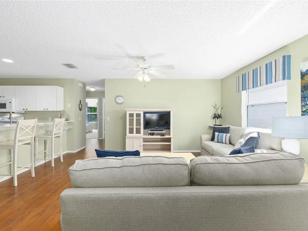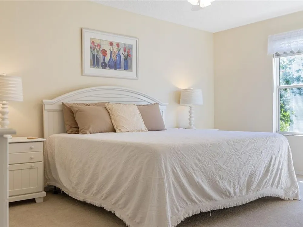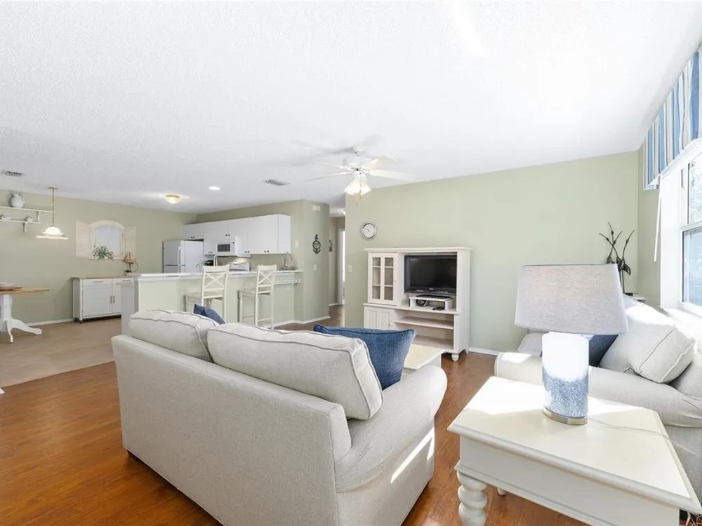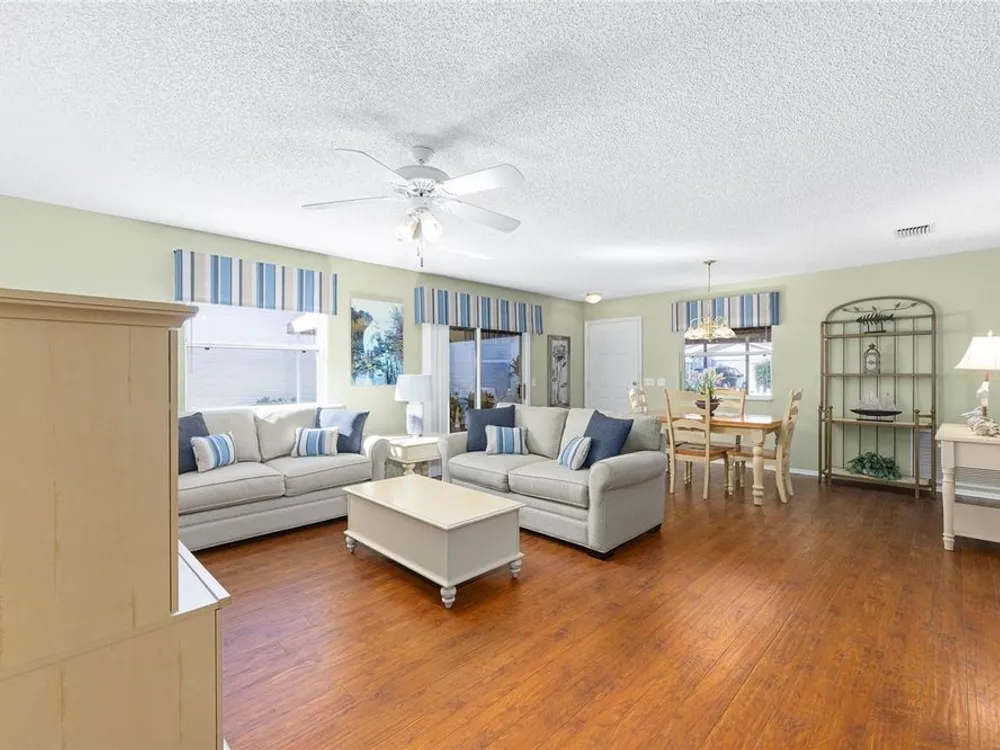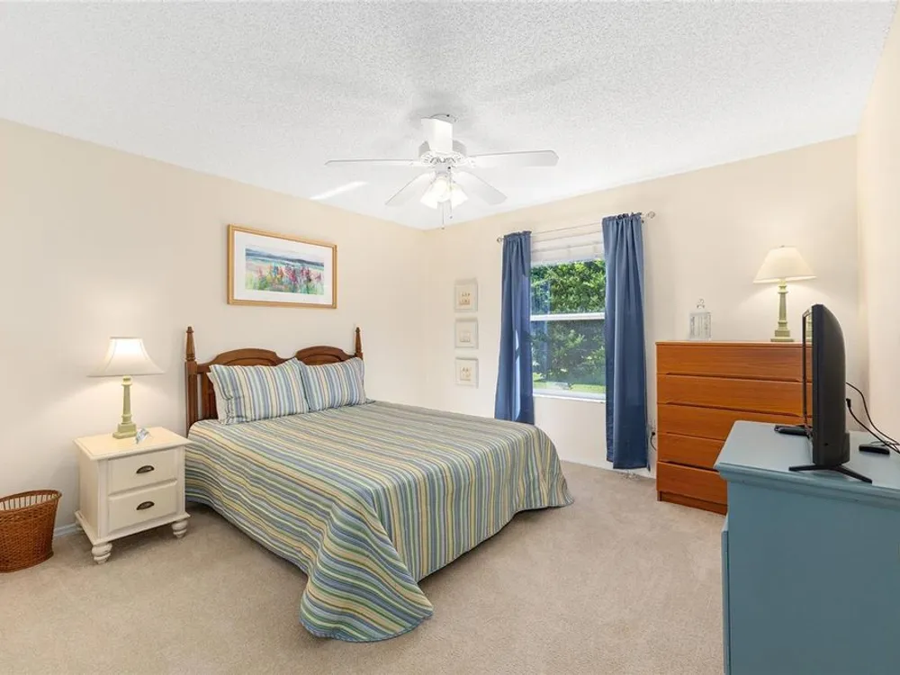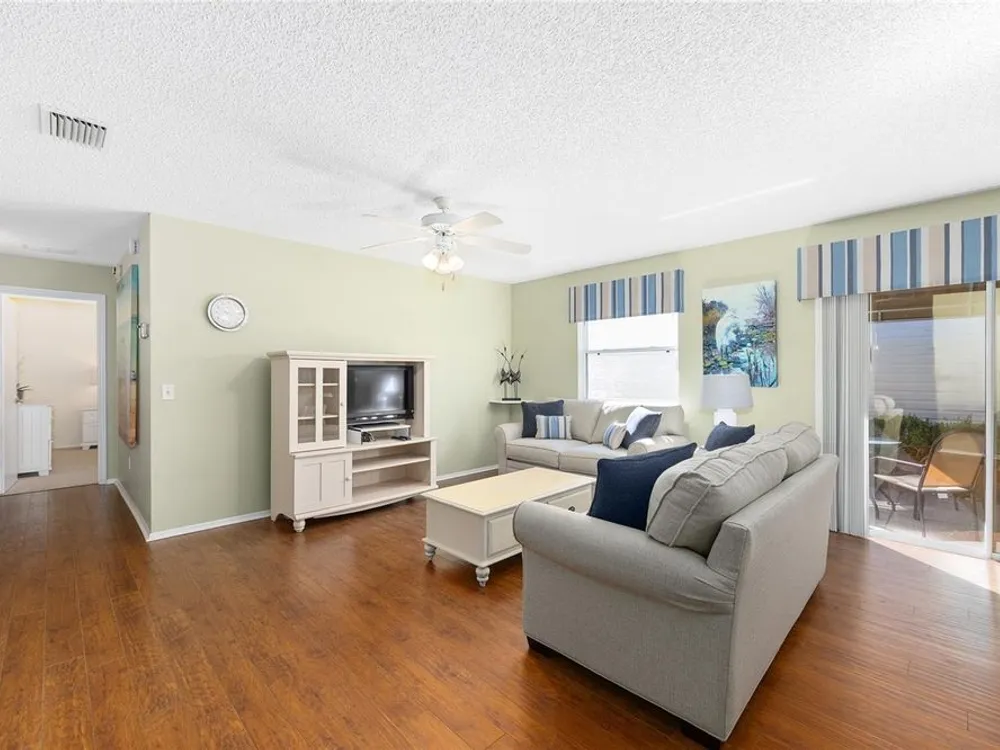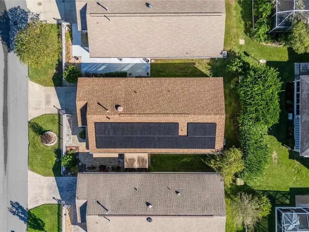 Welcome to this Beautiful TURNKEY Colony Villa in the Villa of Sunnyside in The Village of Woodbury. Close to Shopping and Recreation! BOND PAID! The Exterior Greats you with Awnings over front and side Patio Areas with Privacy in the Rear and Lovely Rock Mulch Garden Beds! The Front Lanai/Florida Room is Enclosed with Acrylic Windows and Privacy Shades! All the Wonderful Furnishings Stay! The Open Concept is Very Comforting! Dining, Living Room and Kitchen are Open for Great Entertaining! A Sliding Door in Dining Area Offers Easy Access to the Covered Side Patio! The Kitchen has Quartz Countertops, Reverse Osmosis with tap at Sink, Stainless Steel Sink with Gooseneck Faucet and Sprayer, Breakfast Bar and Kitchen Table! In the hall to the bedrooms and the Guest Bath, you will find a Linen Closet, Thermostat and Humidistat to Control Humidity! The Tiled Guest Bathroom has a Tub/Shower Combo and Single Vanity! The Guest Bedroom with Built in Closet has a Window to the back yard! A Primary Suite you will Love! Very Spacious, with Walk – In Closet and En-Suite Bathroom! The Primary Bath has a Good-Sized Counter with Single Vanity and Shower Enclosure with Curtain. The Garage Has Epoxied Floors, Gas HVAC (2014), Gas Tankless Water Heater(2011), Water Softener, Washer and Electric Dryer with Many added Wire Shelves and Cabinets. The Garage fits a Car and Golf Cart and Comes with a Screen on the Garage for Privacy! ROOF 2020. SOLAR 2024. Watch the Great Video with Drone Footage Attached