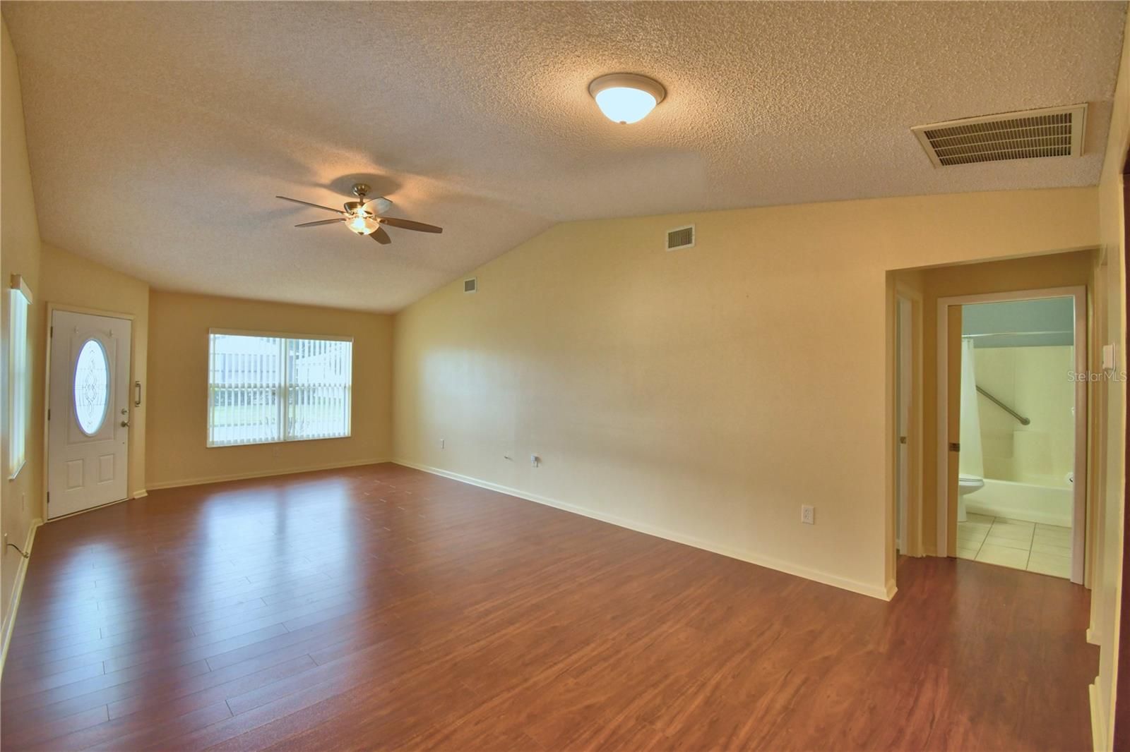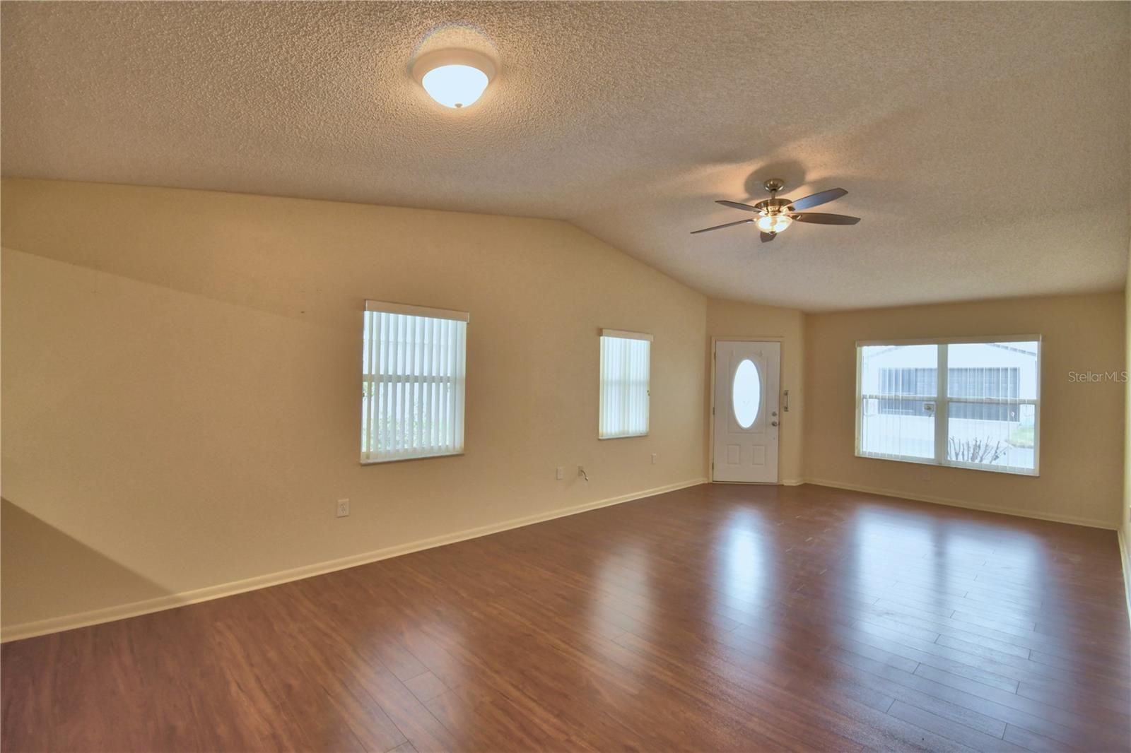 - Ceiling Fan(s), Eat-in Kitchen, Living/Dining Room, Open Floorplan, Solid-Wood Cabinets, Stone Counters, Thermostat, Vaulted Ceiling(s), Window Treatments