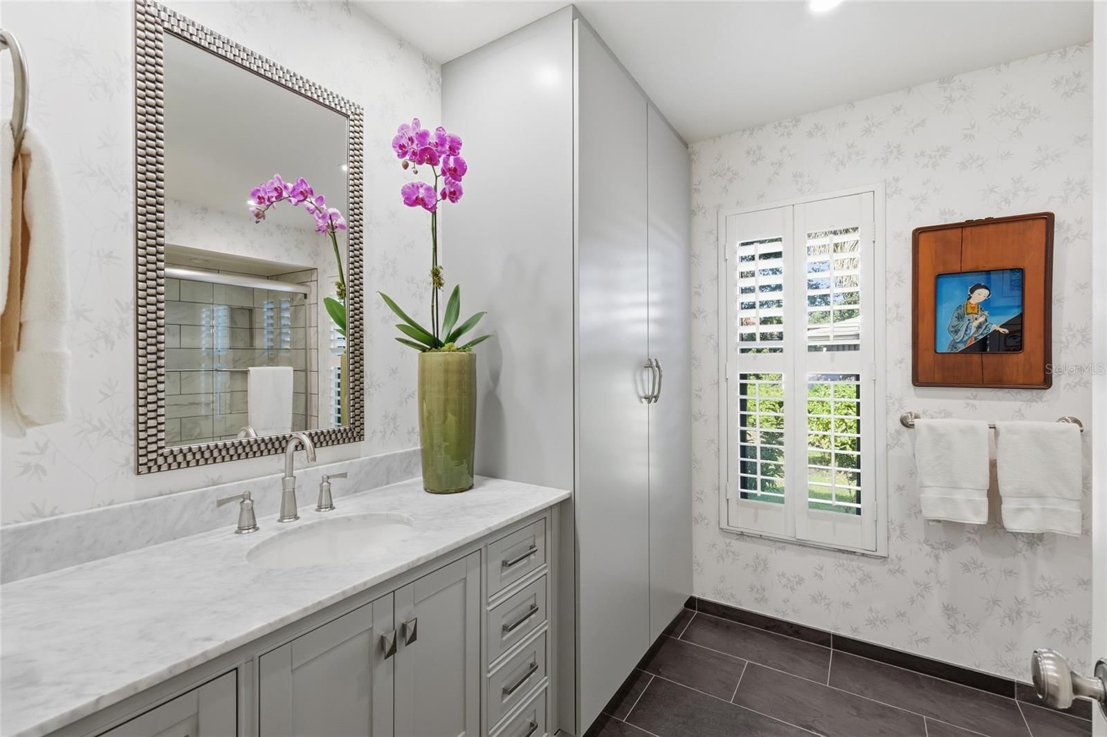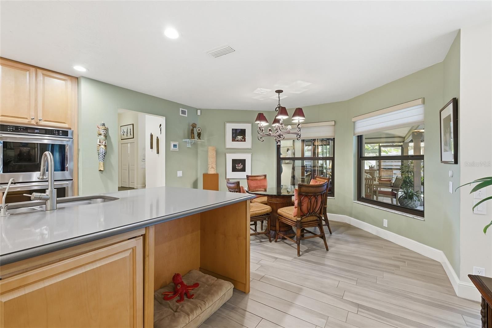 Welcome to this thoughtfully curated home nestled within the gated serenity of The Landings. Designed for both beauty and purpose, this residence features a well-planned layout that offers a harmonious blend of openness and privacy. With four bedrooms and three full baths, the accommodations are generous, highlighted by a primary suite that includes a Master Bath uniquely designed with two private toilet rooms. The expansive second bathroom has a TUB and is ideally and centrally located for family and visiting guests. The heart of the home is the updated kitchen, showcasing Caesarstone countertops, custom built-in cabinetry, and top-of-the-line appliances, including a Wolf gas cooktop, Miele dishwasher, and a EuroCave wine fridge with a capacity for over 200 bottles. The attention to detail is evident in the unique storage solutions found throughout the home, such as the secret storage cabinet in the kitchen, modernized closets with built-in systems, and a floor-to-ceiling pull-out medicine cabinet in the Primary Bath fashioned like an oversized spice rack. In this home, everything has a place, and nothing is without intent. Peace of mind and modern convenience are paramount here. The property is fortified with hurricane-impact windows installed throughout and a full-house Kohler generator. In 2025, important updates were completed including a complete pool renovation, new air-conditioner and tankless water heater. The garage is equally well-equipped, featuring a dedicated plug-in outlet for hybrid or electric vehicles and a mini-split AC system. Outside, the private grounds are serene and well-maintained; a large, fenced-in, and shaded yard surrounds a completely redone pool and spa. Additional exterior features include a turf dog run and an extended driveway that provides ample off-street parking. This residence is located in The Landings, a prestigious gated community of 702 residences bordering the Intracoastal Waterway in south Sarasota. Spanning 280 acres with a mix of stand-alone houses, townhouses, and villas, the neighborhood offers a rich array of amenities, including a USTA-recognized Racquet Club and two nature preserves. Residents enjoy access to a walking trail, gazebo, kayak launch, and a butterfly garden, all nestled amidst 75 acres of mangroves that provide natural beauty and storm mitigation.