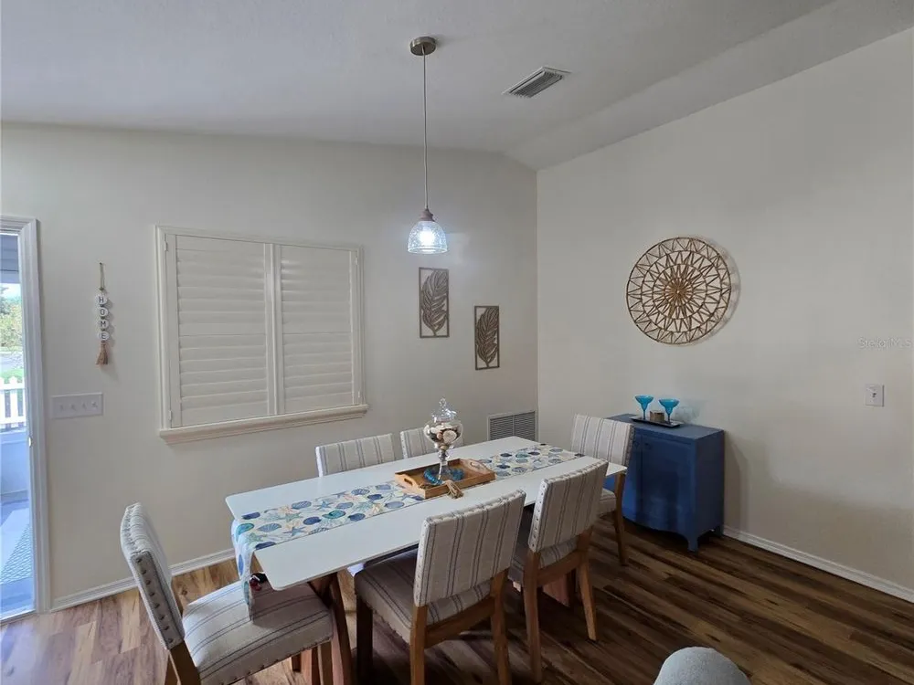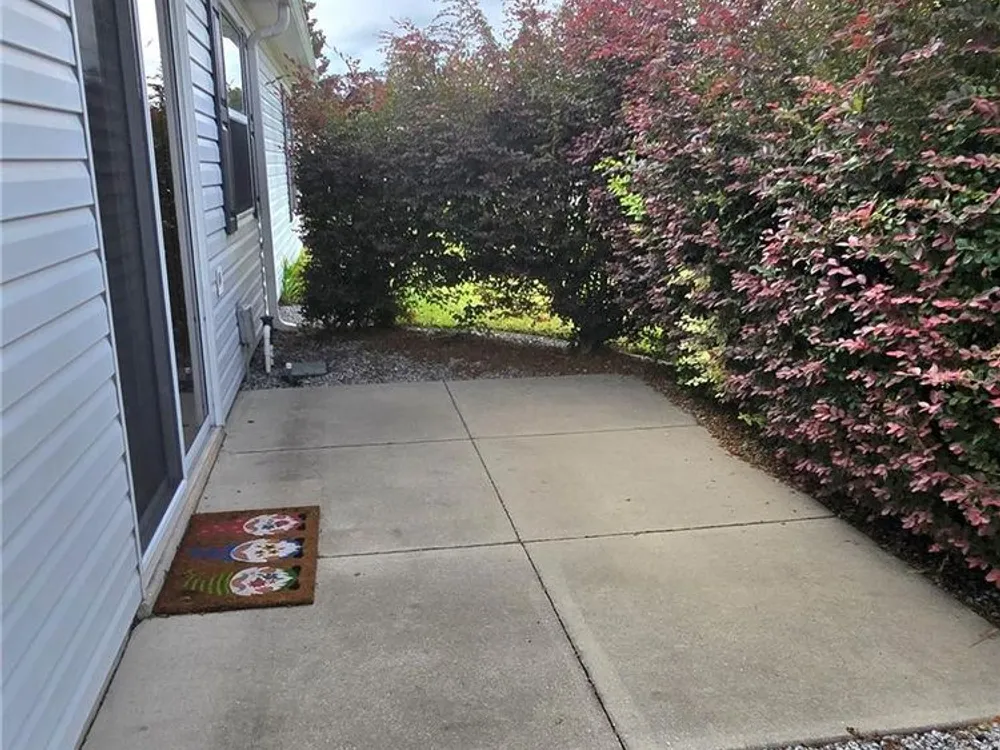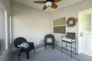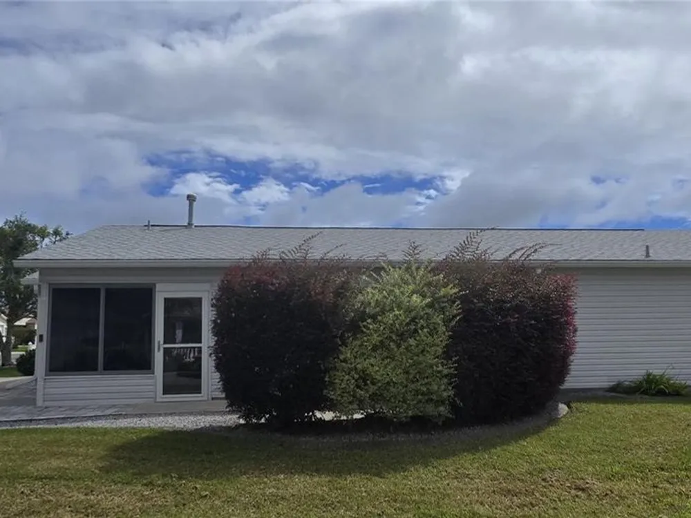 Fantastic location for this Villa in The Villages — just minutes from the Nancy Lopez Country Club! This corner unit features volume ceilings, an open floor plan, and no carpet throughout. The BOND IS PAID, and the home is in excellent condition with updated paint and Luxury Vinyl flooring plus a NEW ROOF (2023). The kitchen offers New Stainless appliances in 2023, a breakfast bar and closet pantry, opening to a bright, spacious living area filled with natural light. Plantation shutters to accent the windows. Screen enclosed lanai at front entry. Enjoy your private side patio, perfect for morning coffee or evening grilling, with a hedge for added privacy. The garage with Epoxy covered floor, provides plenty of space for your car and golf cart. Natural gas is available. Conveniently located near shopping, the VA Clinic, Dog Park, and Publix—just a quick 5-minute golf cart ride away. Immediate availability, and some furnishings may be purchased separately.
