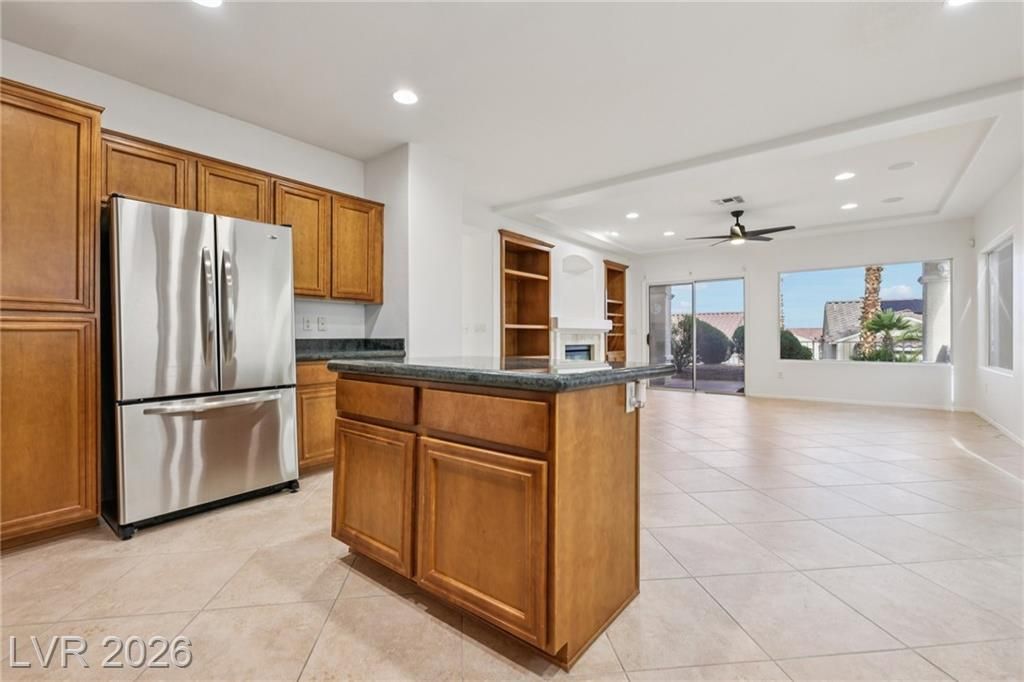 Welcome to resort-style living in the highly sought-after 55+ Sun City Anthem community! This beautiful Liberty floor plan offers a total of 2460 SF -- 2 bedrooms + den + office in the main house, plus a detached casita—perfect for guests, featuring bedroom #3 with ensuite bathroom. Enter through a gated front courtyard into a spacious, light-filled home with diagonally set tile flooring throughout the main living areas. The kitchen boasts granite counters, SS appliances, and a large center island. A cozy gas fireplace warms the inviting family room, while the formal dining room includes a built-in cabinet for elegant entertaining. Main house has new HVAC Dec 2023 and new water heater 2021. Enjoy serene mountain & city views from your elevated lot, complete with covered patio & tranquil waterfall. Newer AC! Sun City Anthem offers an unparalleled lifestyle with 3 clubhouses, 2 golf courses, 2 restaurants, fitness centers, pools/spas, tennis and pickleball, and a vibrant social calendar!