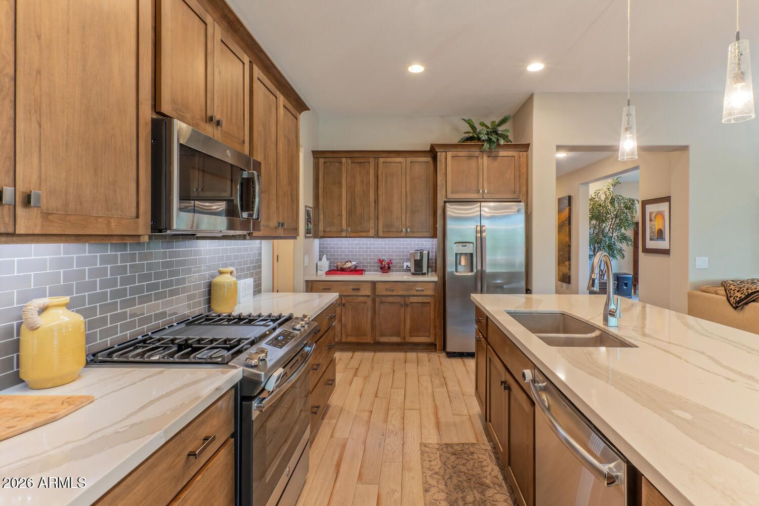 This beautiful & impeccably maintained villa is full of upgrades and easy to enjoy full-time or part-time. The home has stylish wood flooring with carpet in all the right places. The kitchen shines with quartz counters, subway-tile backsplash, soft-close drawers & cabinets, upgraded appliances, including a gas range. The features continue in every room. Bathrooms have quartz counters. The primary suite offers a large, tiled walk-in shower & closet with custom built-ins. The spacious den is a perfect flex space. The laundry room has cabinets: washer & dryer stay. You will also love the whole house water filtration system. Relax in the private courtyard with a nice common area view. The corner lot location is ideal. Ready for you to move-in and enjoy the PebbleCreek resort lifestyle!