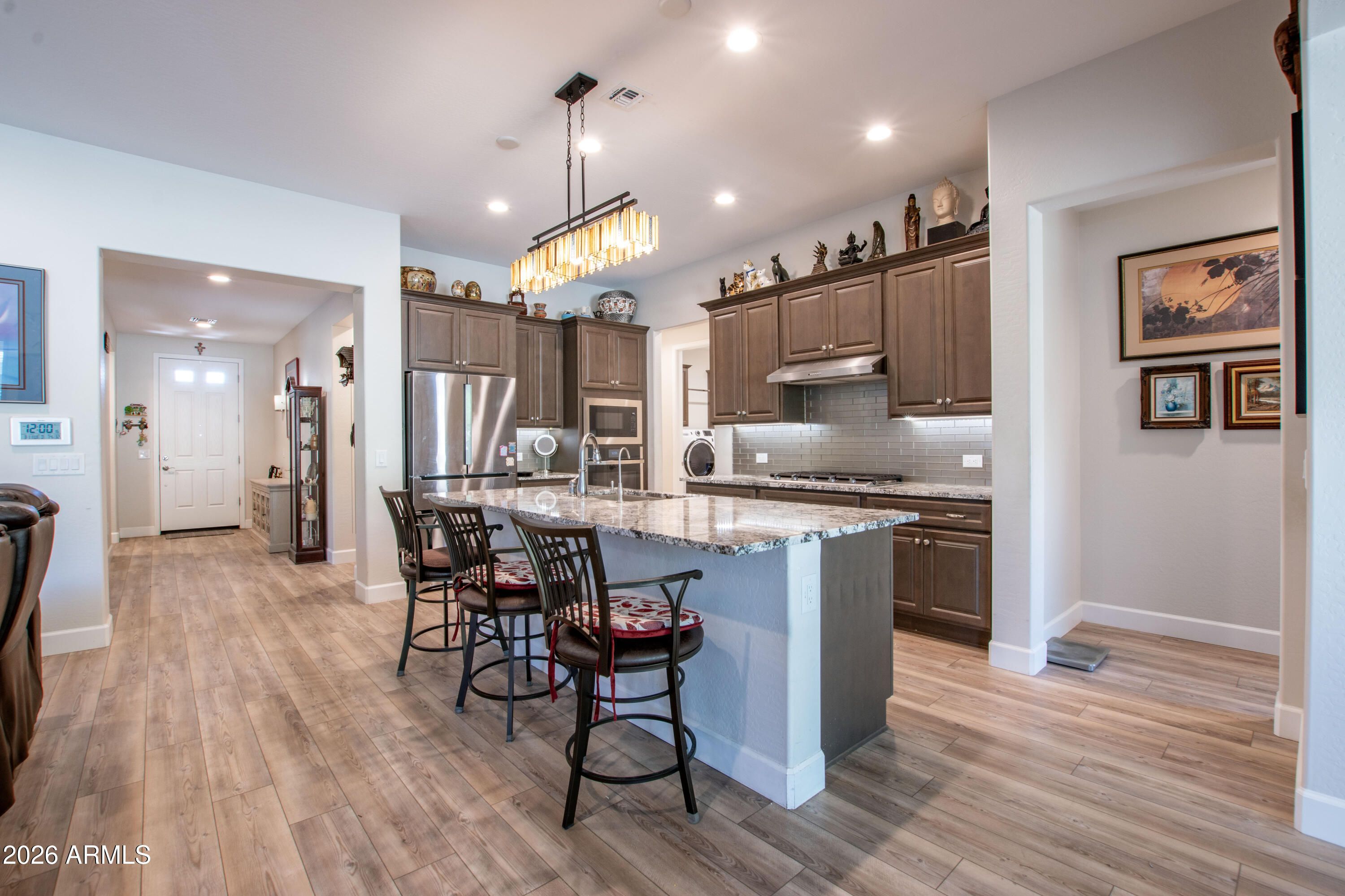 Upgraded Prado model offers 2 bedrooms and 2.5 baths with both bedrooms featuring private ensuite bathrooms. The open kitchen showcases granite countertops, kitchen island with bar seating, stainless steel appliances, gas stove, convection oven, backsplash, under-cabinet lighting, and soft-close cabinets with pull-out drawers. Hardwood flooring runs throughout the home along with taller baseboards, ceiling fans in every room, dimmer switches, and automatic window shades. The primary suite features a walk-in shower and custom closet. Additional highlights include a den/office, spacious pantry, generous laundry room, epoxy garage floor, and elevated elongated toilets. The patio offers epoxy flooring, remote privacy shades, and a gas stub for a grill. Roof has pigeon wire protection. Light Fixture in Dining Room & over Kitchen Island do not convey