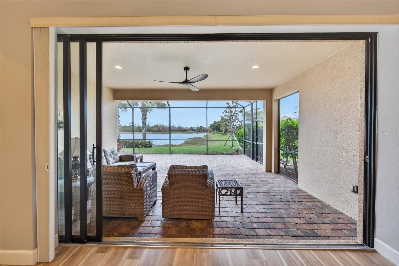 This Perfect Pinnacle home delivers an exceptional blend of luxury, location, and lifestyle. Ideally positioned on a quiet cul-de-sac water lot with desirable north/south exposure, this Smart home offers 2,488 sq ft of thoughtfully designed, open-concept living in the highly sought-after Del Webb 55+ community, located within the nation’s premier multi-generational destination---Lakewood Ranch. From the moment you arrive, the home’s inviting curb appeal sets the tone for the elegance found within. The split floor plan features 3 bedrooms, 3 bathrooms, and a versatile den providing privacy and flexibility for both everyday living and hosting guests. Upgraded luxury vinyl plank flooring flows throughout, complemented by crown molding and 5-inch baseboards that add timeless sophistication. At the heart of the home, the chef’s kitchen shines with a large center island, granite countertops, and KitchenAid stainless steel appliances, including a 5-burner gas cooktop and built-in oven and microwave. The kitchen opens seamlessly to the spacious living and dining areas---perfect for entertaining. Pocket sliding doors extend the living space to an extended lanai, creating a spectacular indoor-outdoor experience with serene water views. The expansive owner’s suite is a true retreat, highlighted by a tray ceiling and accent wall, and a spa-inspired ensuite featuring dual vanities, a large walk-in shower, a generous walk-in closet, and refined finishes throughout. Two additional bedrooms---one with its own ensuite---provide comfortable accommodations for family or guests. The laundry room is thoughtfully designed with wood cabinetry, a utility sink, and abundant counter and storage space. Additional highlights include a home generator, 3-car garage with a 4-foot extension, and epoxy-coated garage floors. This exceptional residence seamlessly combines elegance, comfort, and high-end upgrades making it the perfect place to enjoy the Del Webb lifestyle at its finest.
