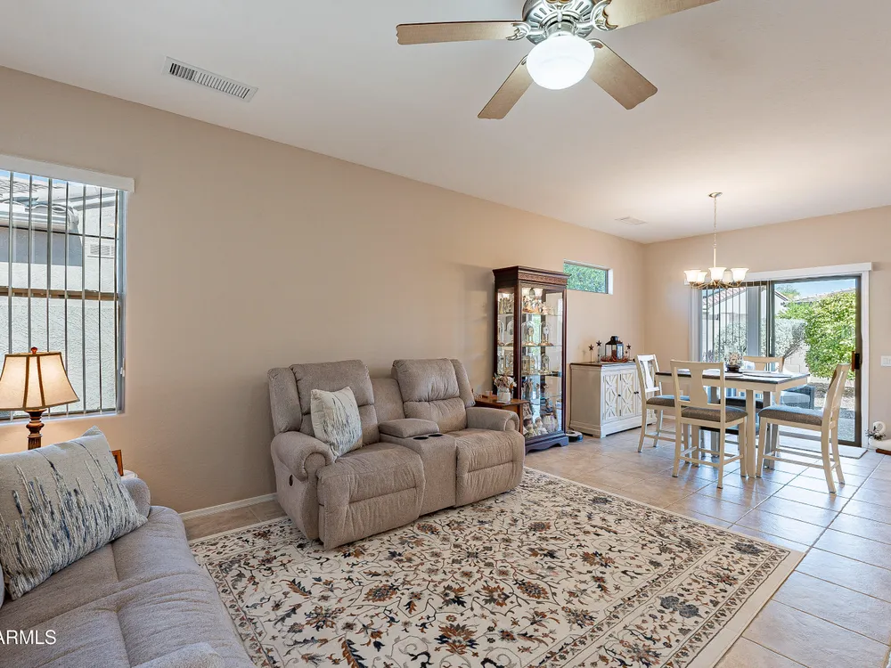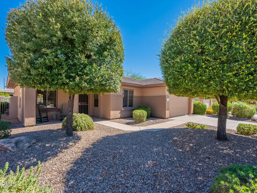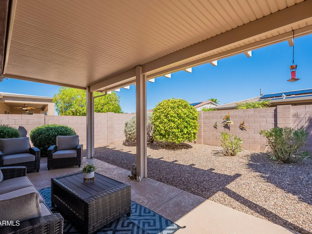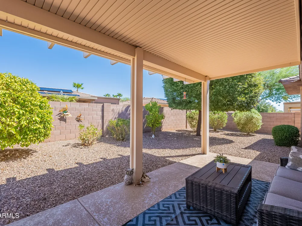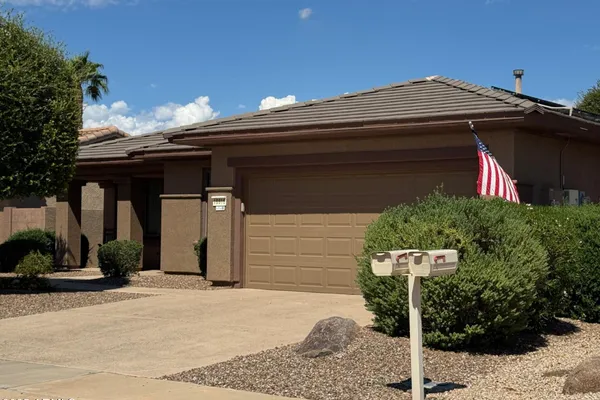 This Sun City Grand home offers approximately 1,184 square feet of living space with two bedrooms and two bathrooms. Previously one of Del Webb's model homes; featuring a fully fenced back yard and mature front & back landscaping with beautiful shade trees. Enjoy updated tile throughout with new bedroom carpets recently installed. This home also includes the benefit of owned solar, providing energy cost savings and plantation shutters for additional comfort. The extended garage offers additional storage or workspace options. This home was previously a model home, indicating updated finishes inside and out. The Cimmaron Rec Center is just a short walk around the corner with a host of outdoor activities to enjoy including the outdoor pool, golf, pickleball and fitness center. Sun City Grand offers residents a wide range of amenities, including 4 golf courses, two fitness centers, multiple pools, 22 pickleball courts, tennis courts, and bocce ball courts. This Sun City Grand home offers approximately 1,184 square feet of living space with two bedrooms and two bathrooms. Previously one of Del Webb's model homes; featuring a fully fenced back yard and mature front & back landscaping with beautiful shade trees. Enjoy updated tile throughout with new bedroom carpets recently installed. This home also includes the benefit of owned solar, providing energy cost savings and plantation shutters to for additional comfort. The extended garage offers additional storage or workspace options. This home was previously a model home, indicating updated finishes inside and out. The Cimmaron Rec Center is just a short walk around the corner with a host of outdoor activities to enjoy including the outdoor pool, golf, pickleball, a fitness center and much, much more!