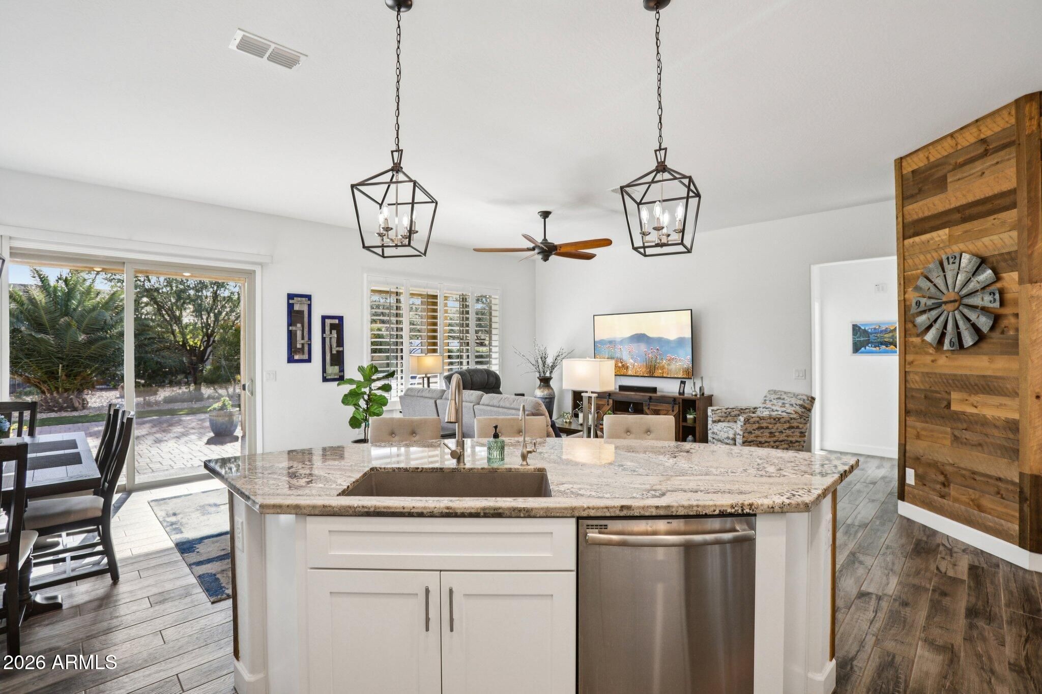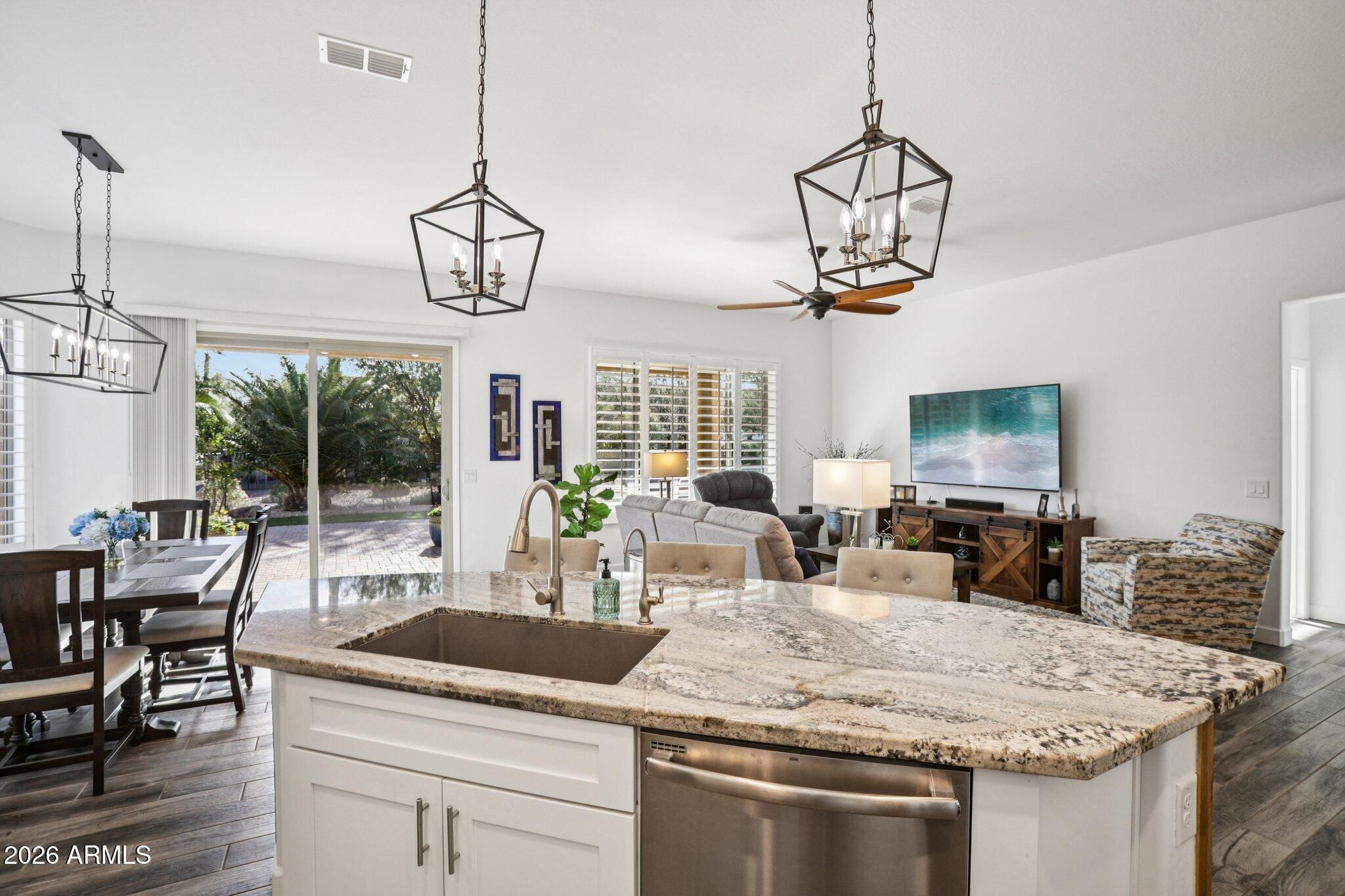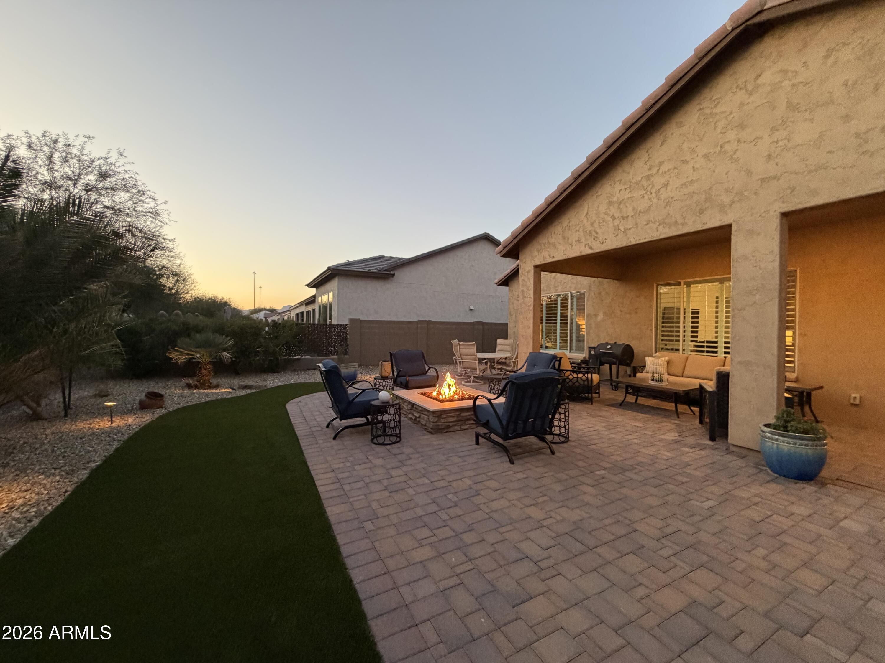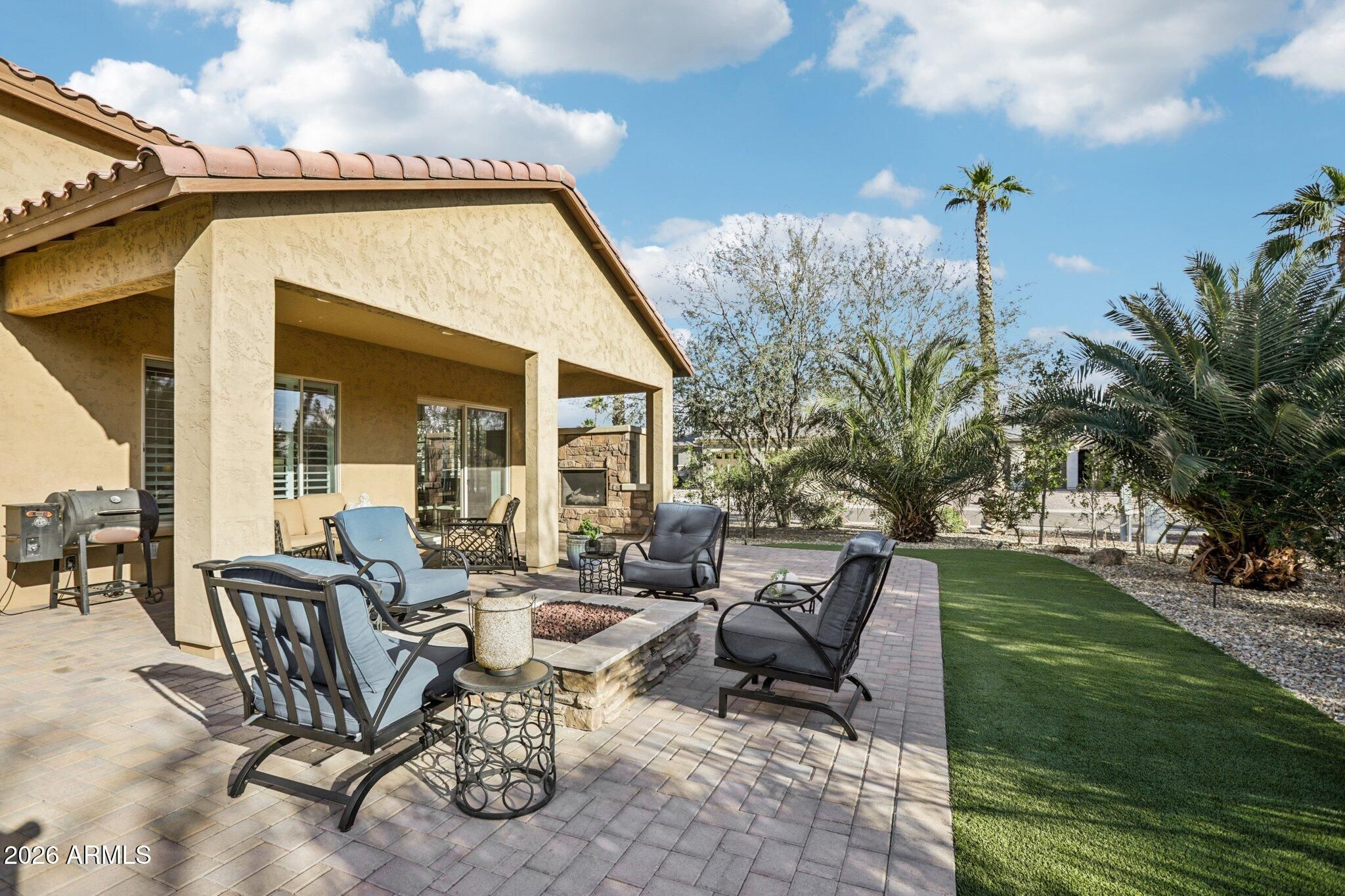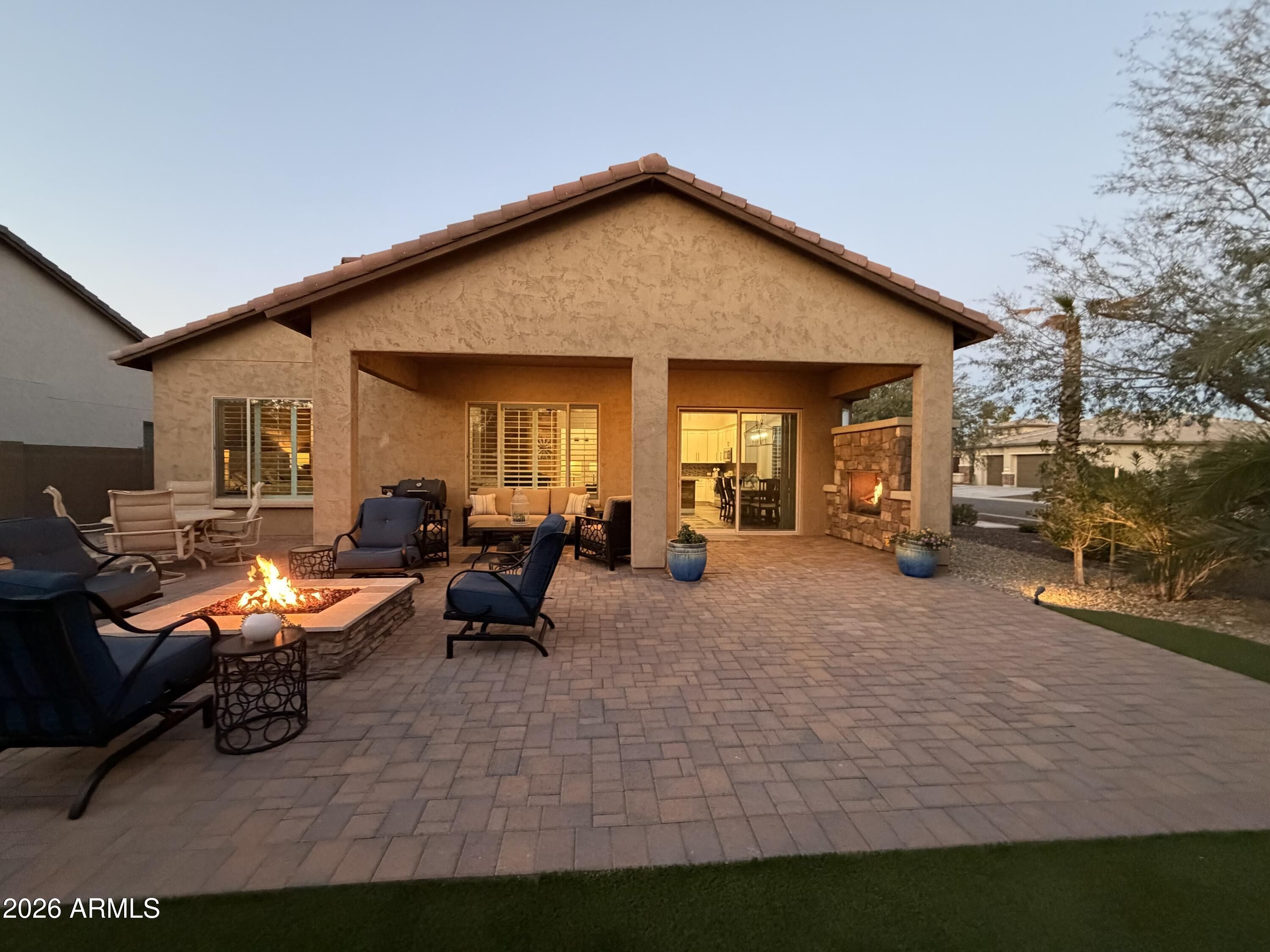 Welcome to 16929 W Cambridge Ave, a beautifully maintained Montecito model located in the highly desirable PebbleCreek 55+ active adult community. This thoughtfully designed home offers 2 bedrooms, 2 bathrooms, plus a den, providing the perfect balance of comfort and flexibility. The upgraded kitchen is a standout feature, showcasing quartz countertops, modern finishes, and ample cabinetry—ideal for both everyday living and entertaining. The open layout flows seamlessly into the living and dining areas, creating a bright and inviting space. Step outside to a beautifully landscaped backyard designed for relaxation and entertaining, complete with a cozy fireplace and firepit—perfect for enjoying Arizona evenings year-round. Residents of PebbleCreek enjoy resort-style amenities, golf, dining, fitness centers, and an active social lifestyle. This home offers the ideal combination of low-maintenance living, upscale upgrades, and an exceptional community. pebblecreek features over 220 clubs and organizations, 3 championship golf courses, 36 pickleball courts, 3 resort style swimming pools, fittness centers and more! Don't miss the opportunity to own this move-in-ready home in one of the West Valley's most sought-after 55+ communities. Note furniture available on separate bill of sale