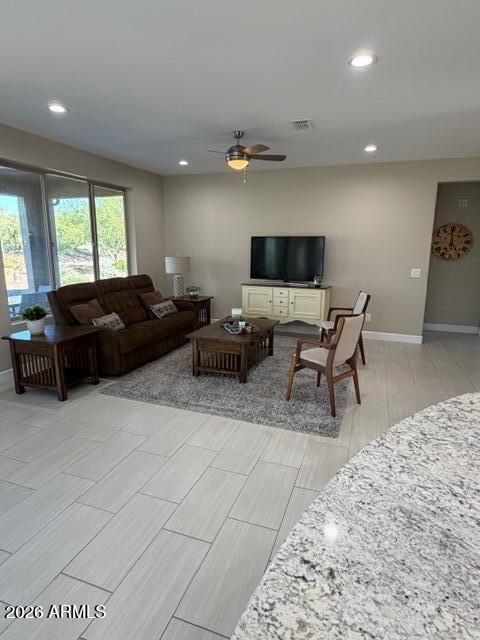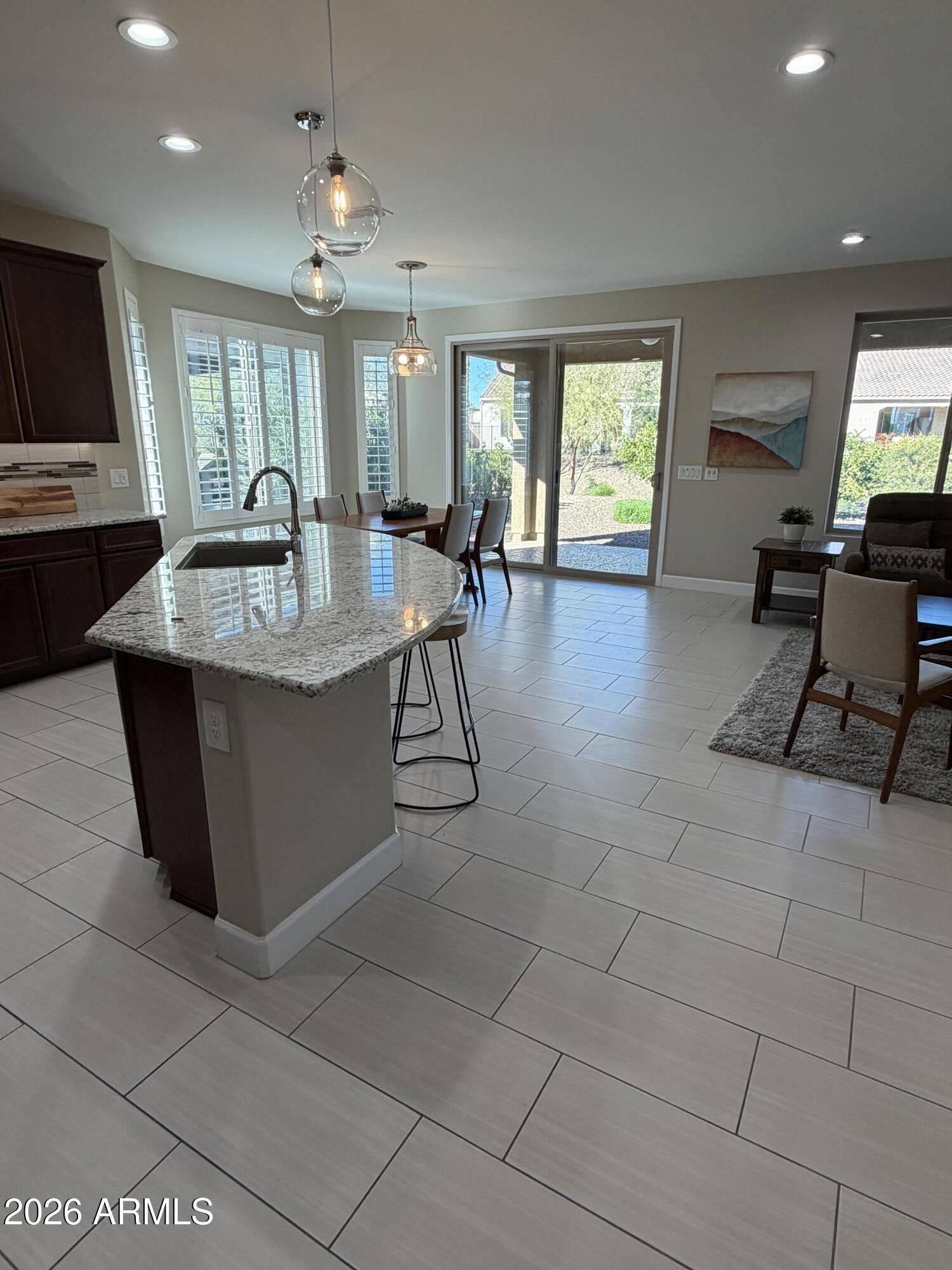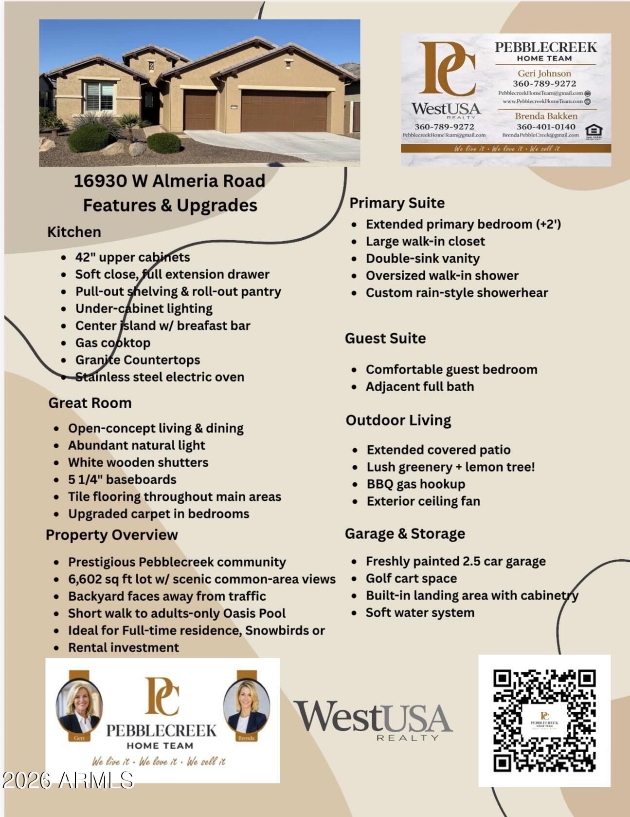 Professional pictures coming soon. This impeccably maintained home in the prestigious PebbleCreek community offers a carefree, luxurious lifestyle. Featuring 2 bedrooms, 2 bathrooms, and a private den, the home sits on a light and bright 6,602 sq ft lot with scenic views of a beautifully landscaped common area. The spacious primary suite extended 2' is decorated in neutral tones and includes a walk-in closet with ample storage. The en-suite bathroom features a large double-sink vanity and an oversized walk-in shower with a custom built rain-style showerhead. The open-concept living & dining areas are ideal for entertaining, with an optional bumped-out dining space that comfortably seats several guests. Abundant natural light fills the home, enhancing the peaceful outdoor views. The well-appointed kitchen boasts 42'upper cabinets along with soft-close full extension drawers, pullout shelving, and roll out extensions in panty cabinet, under counter lighting, center island with breakfast bar, gas cooktop, elegant granite countertops, cabinet crown molding and a sleek stainless steel electric oven. The guest bedroom and adjacent bath provide a comfortable retreat for visitors. Outdoors, the private backyard features an extended covered patio surrounded by lush greenery, perfect for relaxing or entertaining. The freshly painted 2.5-car garage includes a dedicated golf cart space and a convenient built-in landing area just inside the doorway with counter space and cabinetry above and below. Additional highlights include white wooden shutters, oversized 5 1/4" baseboards, upgraded carpet in all bedrooms, neutral rectangular tile flooring, a BBQ gas hookup, rain gutters, exterior ceiling fan, and a charming front entry. The backyard faces away from traffic, and the home is just a short block from the adults-only Oasis Pool. Ideal as a snowbird retreat, rental investment, or year-round residence, this home truly offers the best of PebbleCreek living.