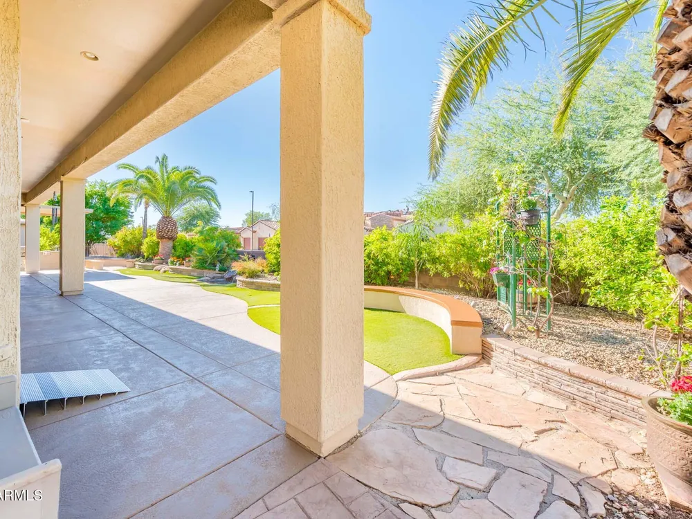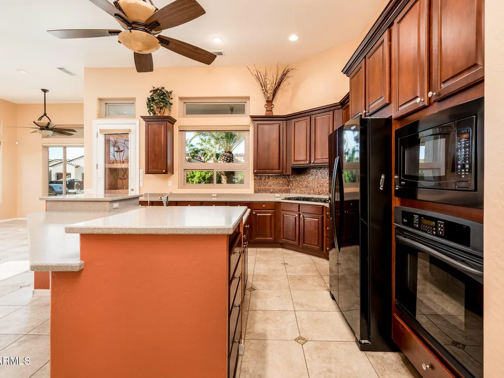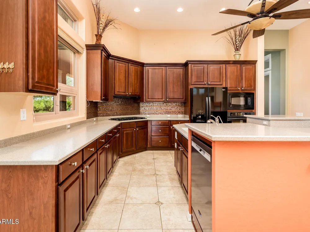 Kensington Model w/3 car extended garage, on a premium lot. Inside, you'll find 20-inch neutral tile floors and rich cherry kitchen cabinets complete with a gas cook-top and pull-out shelves, perfect for the discerning chef. Fireplace in the family room, surround sound. The thoughtful layout includes a dual suite arrangement and a half bath. Primary suite features a glass block shower and a separate garden tub. Step outside to a meticulously landscaped backyard oasis, where dramatic boulder waterfalls and a built-in, lit BBQ station set the scene for relaxation and entertainment. Plus, the extended three-car garage provides extra storage with built-in cabinetry and 2 new A/C units.