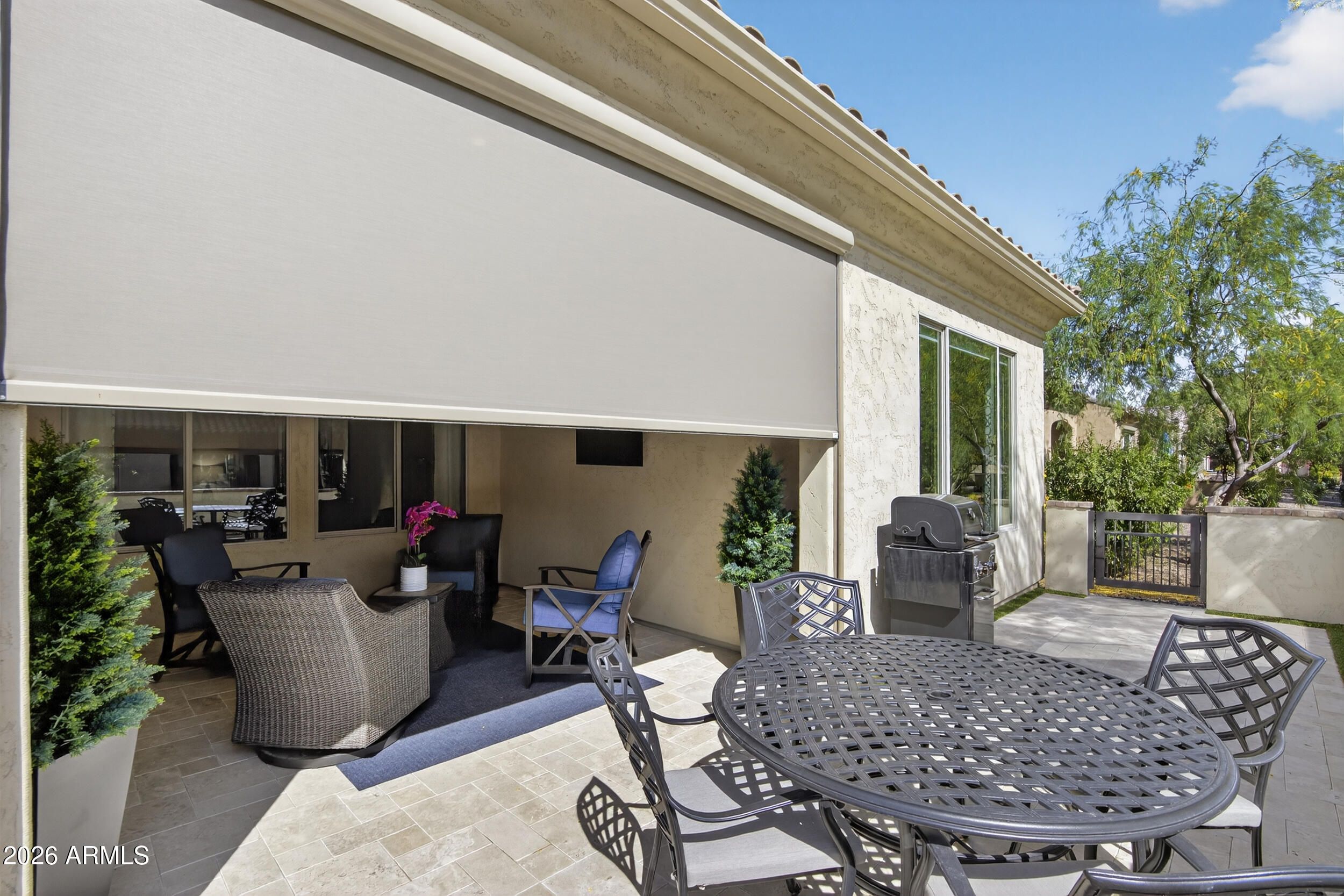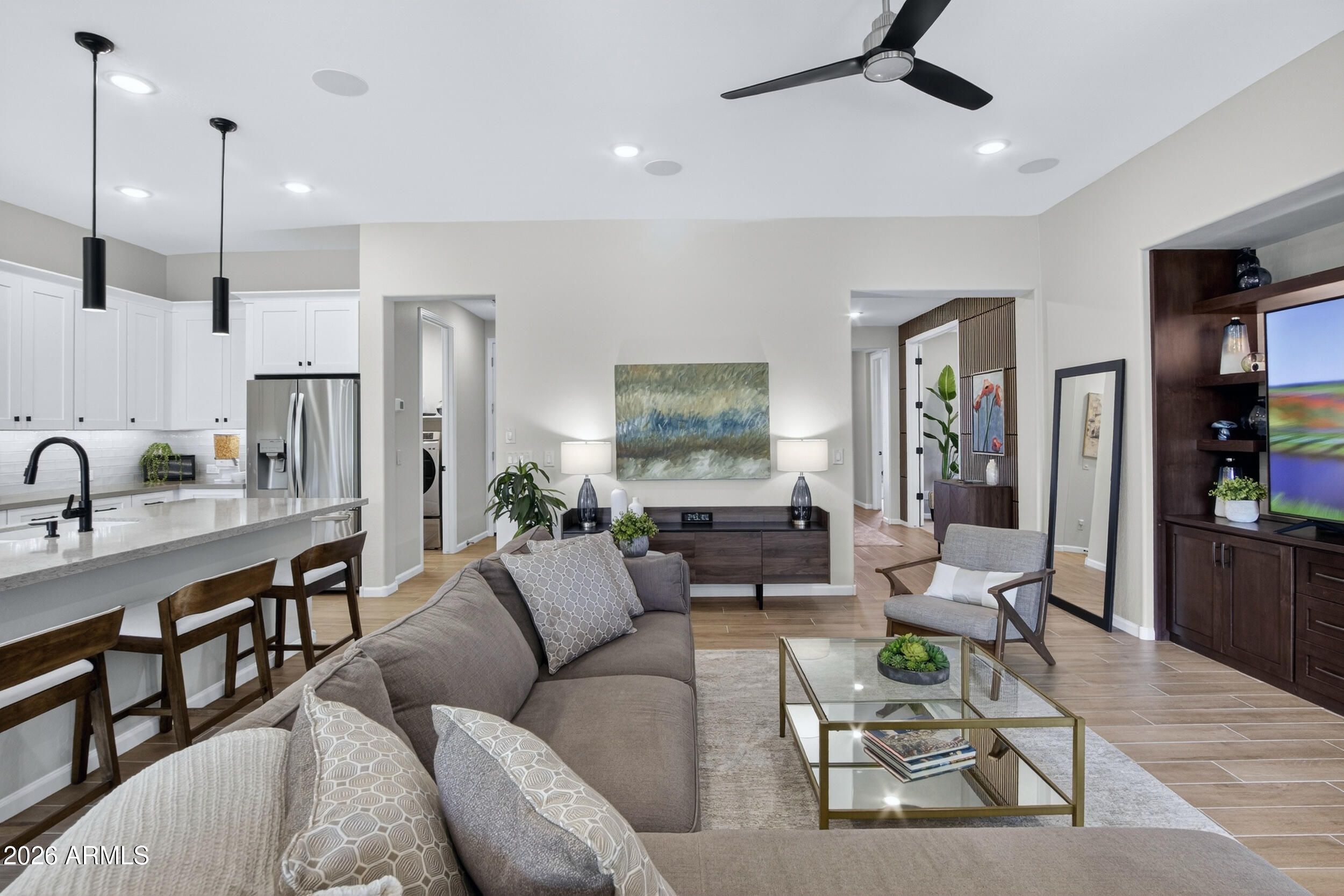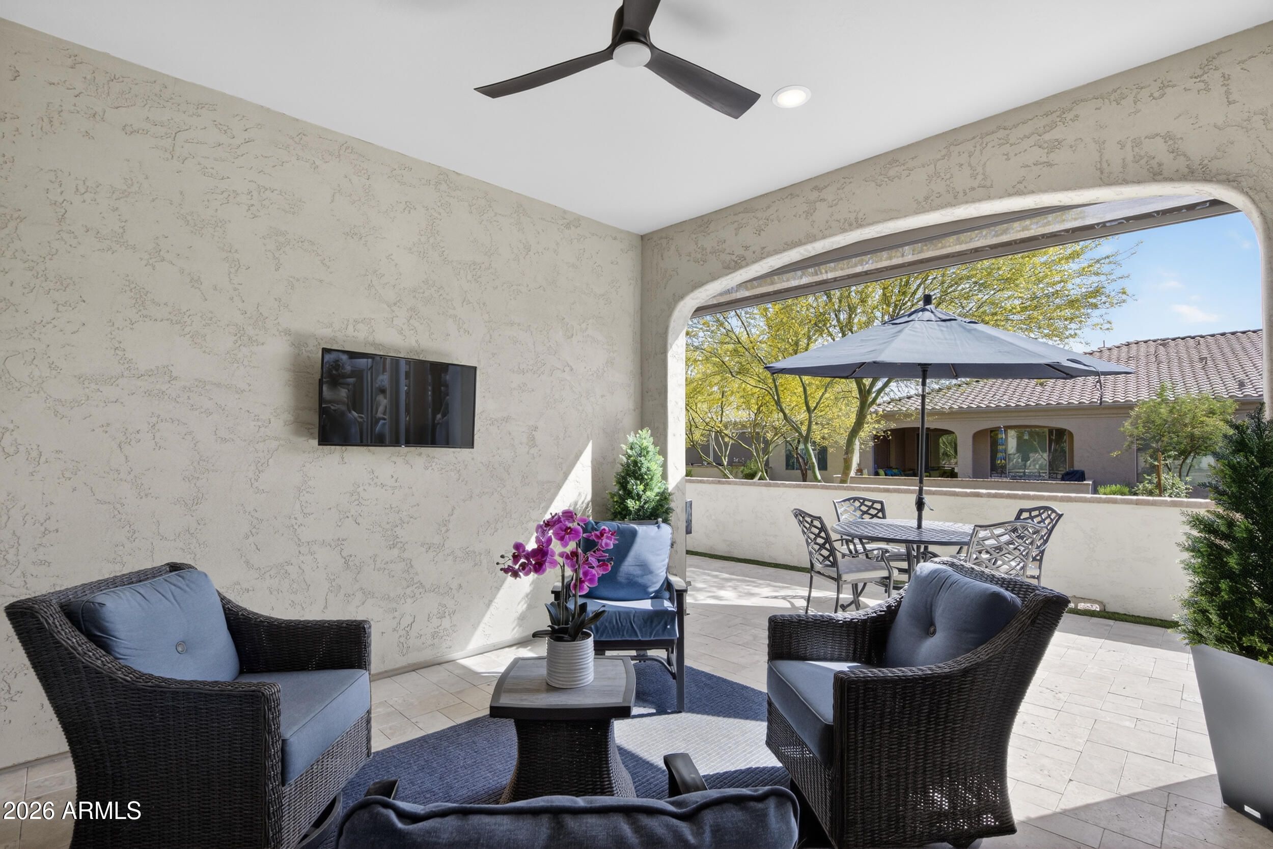 Modern luxury villa brimming with designer upgrades & smart home features. Custom glass entry leads into a stunning 10' great room featuring an acoustic accent wall, built-in media center w/ 7-speaker surround sound & stylish designer fixtures. Chef's kitchen boasts extended shaker cabinetry, quartz counters, backsplash, under-cabinet & toe-kick lighting, new range with convection/air fryer. Soft close slide outs throughout, w/ soft close doors and drawers. Convenient Butler's Pantry connects the garage to the kitchen. Home features custom up/down cellular shades, smart home automation, outlets with USB ports & large walk-in primary closet. Enjoy outdoor living in the enclosed travertine courtyard w/ electric sunshade overlooking a mature park like setting. Cool Deck on driveway & entry. Enjoy a life free from exterior maintenance worries, as the HOA expertly tends to landscaping, roof care, pest control & the overall external well-being of the residence. After indulging in the wide array of amenities that PebbleCreek has to offer, retreat to your personal sanctuary - a haven that seamlessly blends comfort and the bliss of worry-free living. This is the perfect Lock-and-Leave sanctuary you've been waiting for! This immaculate property is available furnished and/or turn key on a separate Bill of Sale. This very Active Adult community includes 3-18 hole golf courses, 40+ pickleball & tennis courts, State of the Art Fitness Centers, Creative Arts Center, Multiple resort style pools and hot tubs, Theater with live performances, Casual dining, Billiards room, Bocce courts and more. Come take a look!