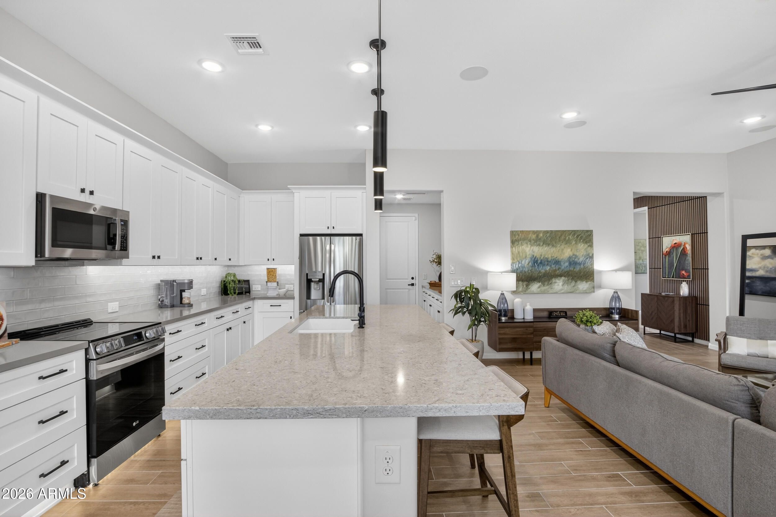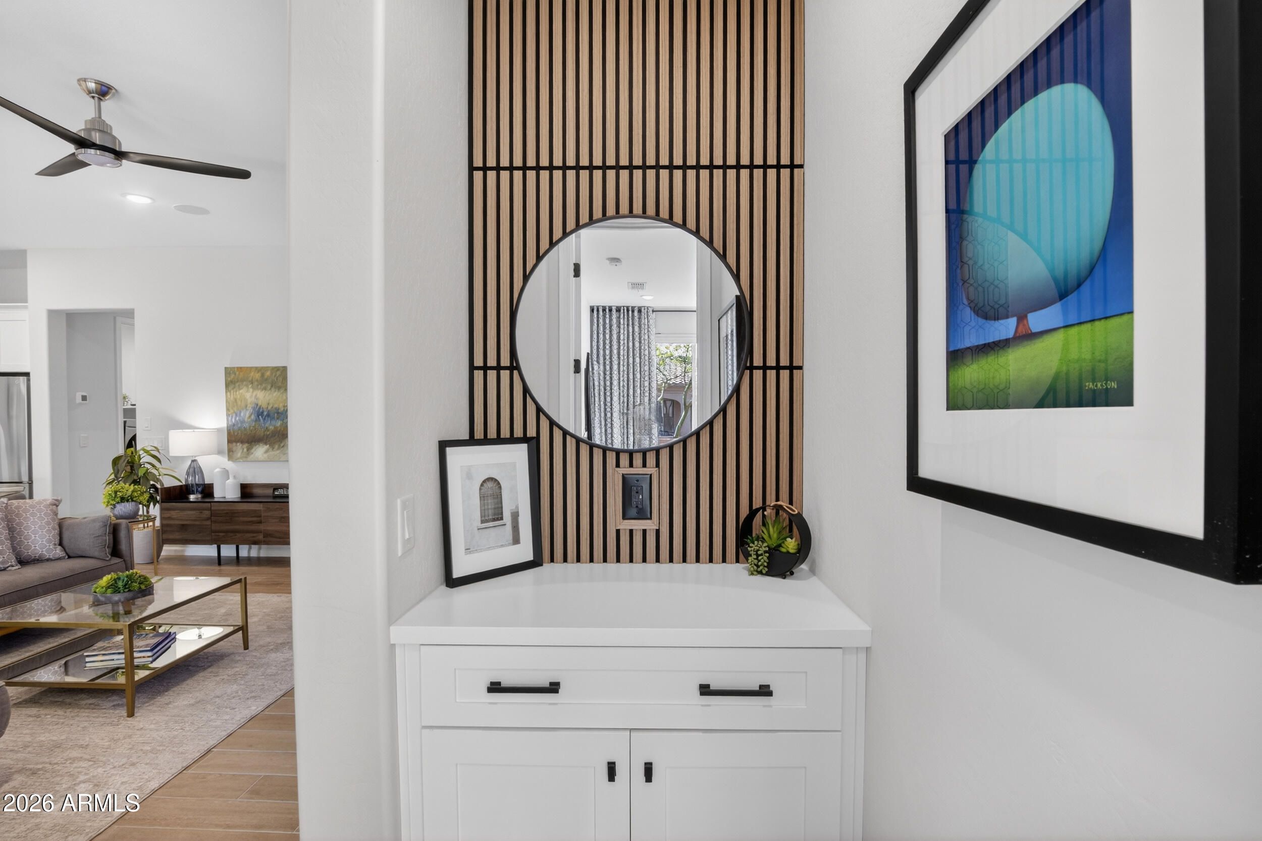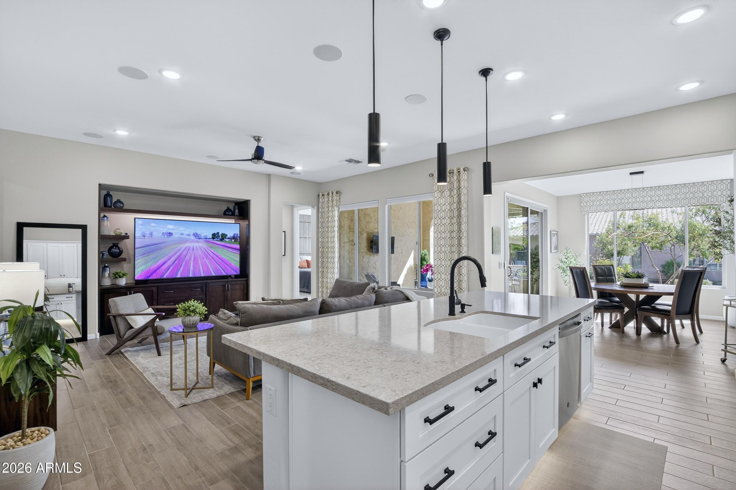 Modern luxury villa brimming with designer upgrades & smart home features. Custom glass entry leads into a stunning 10' great room featuring an acoustic accent wall, built-in media center w/ 7-speaker surround sound & stylish designer fixtures. Chef's kitchen boasts extended shaker cabinetry, quartz counters, backsplash, under-cabinet & toe-kick lighting, new range with convection/air fryer. Soft close slide outs throughout, w/ soft close doors and drawers. Convenient Butler's Pantry connects the garage to the kitchen. Home features custom up/down cellular shades, smart home automation, outlets with USB ports & large walk-in primary closet. Enjoy outdoor living in the enclosed travertine courtyard w/ electric sunshade overlooking a mature park like setting. Cool Deck on driveway & entry. Enjoy a life free from exterior maintenance worries, as the HOA expertly tends to landscaping, roof care, pest control & the overall external well-being of the residence. After indulging in the wide array of amenities that PebbleCreek has to offer, retreat to your personal sanctuary - a haven that seamlessly blends comfort and the bliss of worry-free living. This is the perfect Lock-and-Leave sanctuary you've been waiting for! This immaculate property is available furnished and/or turn key on a separate Bill of Sale. This very Active Adult community includes 3-18 hole golf courses, 40+ pickleball & tennis courts, State of the Art Fitness Centers, Creative Arts Center, Multiple resort style pools and hot tubs, Theater with live performances, Casual dining, Billiards room, Bocce courts and more. Come take a look!