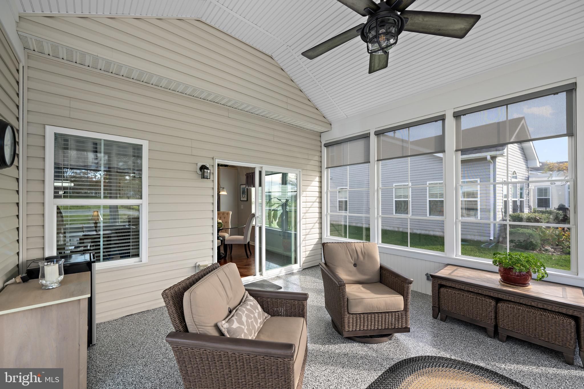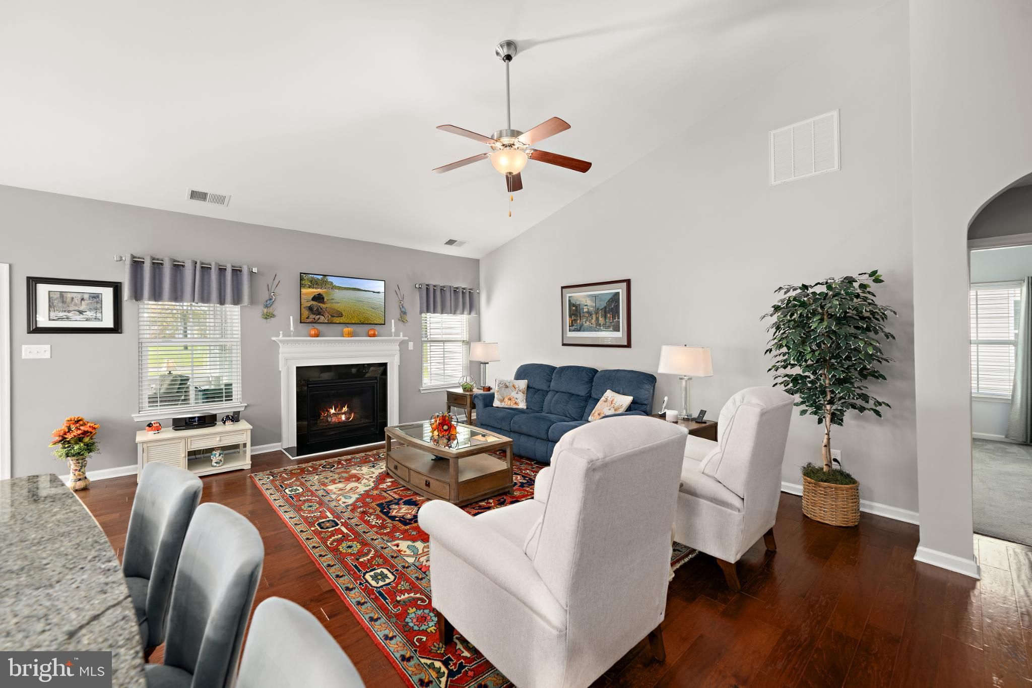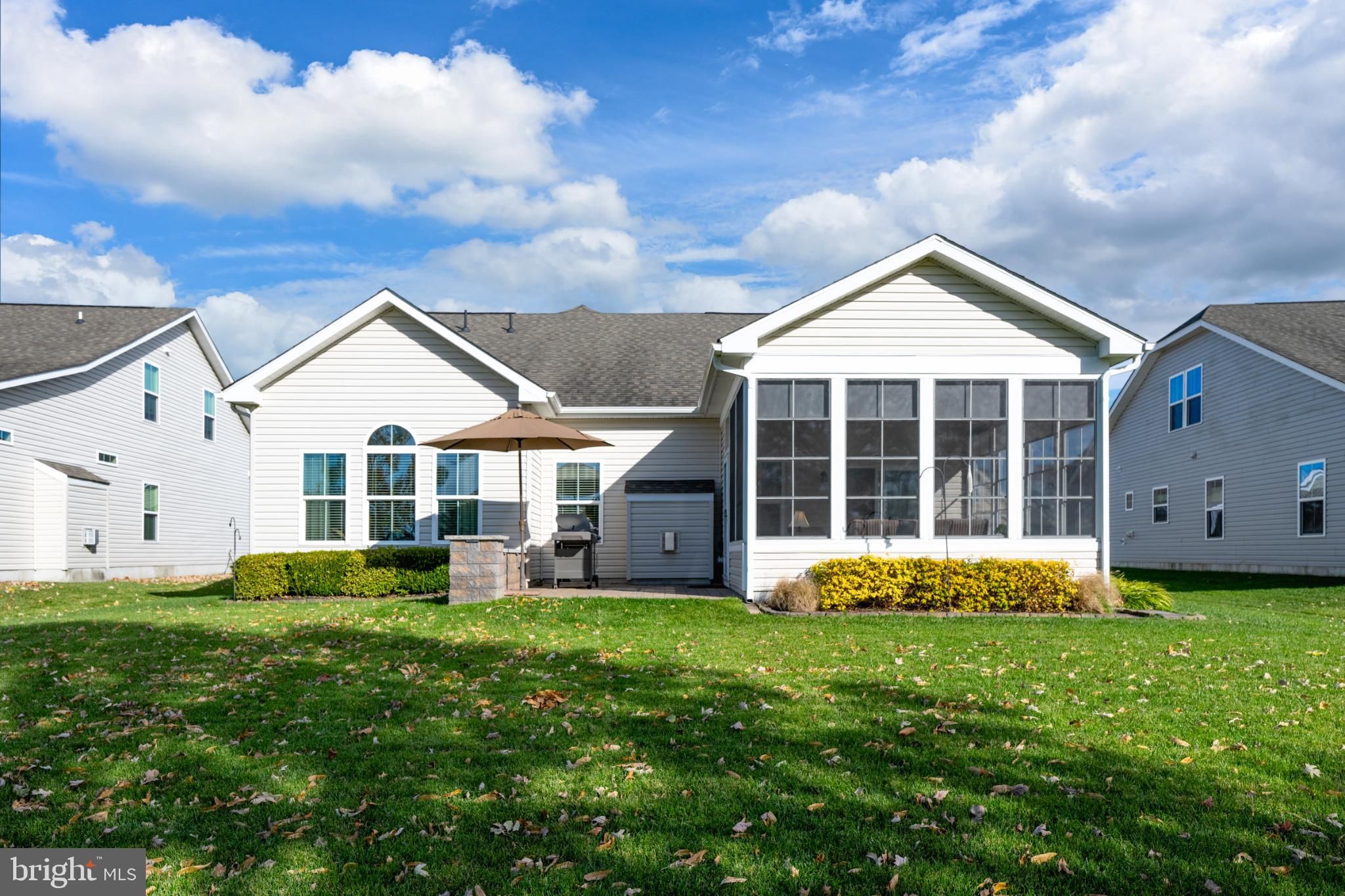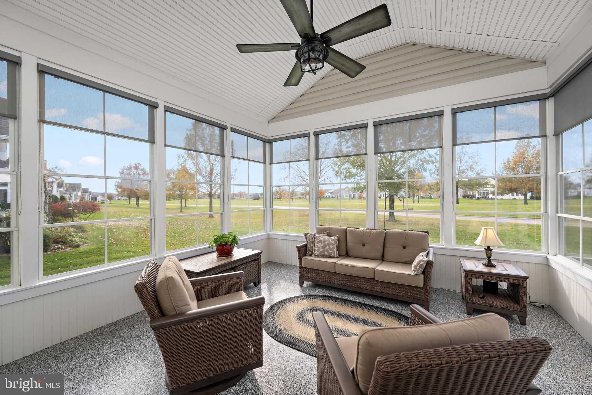 Welcome to 17 Champions Drive, a beautifully appointed 2-bedroom, with additional Flex room, 2-bath home offering effortless one-level living in the heart of the premier 55+ community of Heritage Shores. Perfectly positioned to overlook the 17th hole of the championship golf course, this home delivers a rare combination of comfort, elegance, and sweeping views that define resort-style living. From the moment you arrive, the home’s inviting curb appeal and manicured landscaping reflect the pride of ownership found throughout. Inside, warm hardwood floors, tray ceiling, and a soft neutral palette create an open, airy atmosphere that feels both welcoming and refined. The main living area is anchored by a cozy gas fireplace, making it the perfect place to unwind or gather with friends and family. The kitchen is thoughtfully designed for both everyday living and entertaining, featuring granite countertops, stainless steel appliances, a gas cooktop, double wall ovens, abundant cabinetry, and a generous center island with seating. The open flow into the dining and living areas allows you to host with ease while maintaining a relaxed, comfortable feel. One of the home’s most captivating features is the three-season room, surrounded by windows and filled with natural light and epoxy floor for easy care. This space offers peaceful, year-round enjoyment and showcases beautiful golf course views — an ideal setting for morning coffee, afternoon reading, or evening sunsets. Just outside, the paver patio provides a seamless transition to outdoor living, perfect for grilling or simply enjoying the open green space beyond. The primary suite is a private retreat, offering generous proportions, a vaulted ceiling, and a spa-inspired en suite bath with dual vanities, a walk-in shower, and excellent storage. Two additional bedrooms provide flexibility for guests, hobbies, or a home office, all served by a well-appointed full bath. Additional highlights include a dedicated laundry room with utility sink, exceptional closet and storage space throughout, and a spotless finished garage with epoxy flooring and overhead storage, underscoring the meticulous care given to this home. Beyond the home itself, Heritage Shores offers a lifestyle that few communities can match. Residents enjoy a championship Arthur Hills–designed golf course, an expansive clubhouse with dining, ballroom, game rooms, and library, a fully equipped fitness center, indoor and outdoor saltwater pools, pickleball, tennis, bocce, miles of walking trails, and a full calendar of clubs, events, and social activities. Whether you’re seeking an active schedule or a more relaxed pace, the community supports both — all just minutes from shopping, dining, and Delaware’s beautiful beaches. 17 Champions Drive is more than a home — it��s an opportunity to enjoy refined living, scenic surroundings, and a vibrant community, all at your own pace.