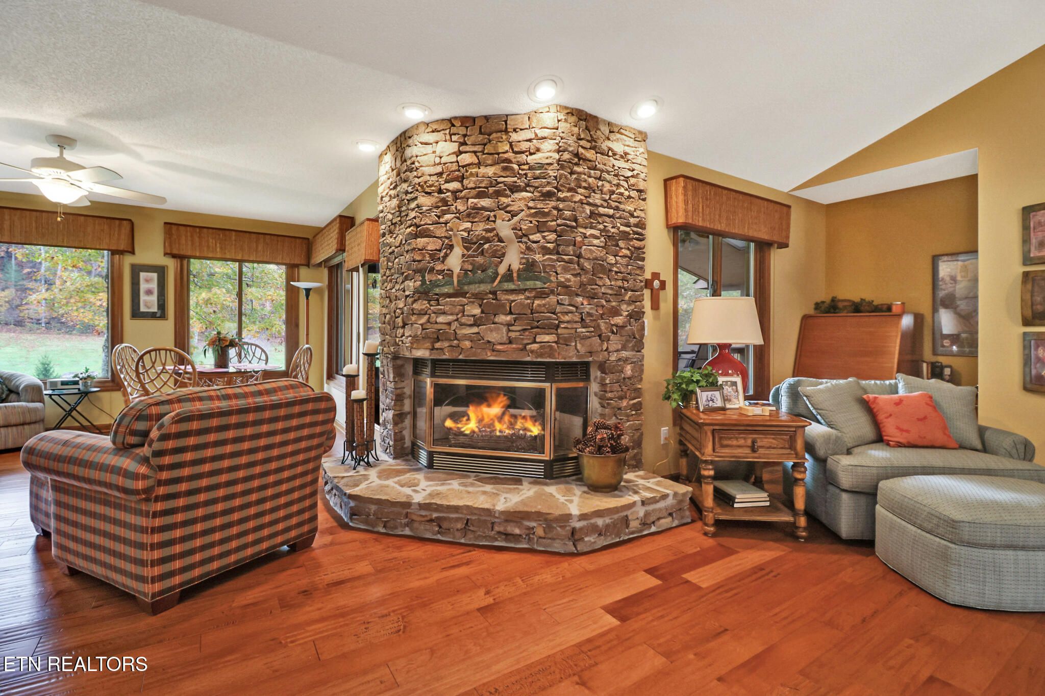 FABULOUS FAIRFIELD GLADE GOLF FRONT HOME (CRAIG #4) YOU WILL NOT WANT TO MISS THIS! THREE BEDROOM, THREE BATH, THREE CAR GARAGE, THREE THOUSAND EIGHT HUNDRED AND TWENTY EIGHT SQUARE FEET, ON OVER ONE-HALF ACRE IN A PRIVATE SETTING. Quartz countertops in kitchen, with hardwood cabinets, breakfast bar, new stovetop, new double ovens, new microwave. Living/ dining room combination with three sided gas log fireplace. Separate laundry with new washer and dryer. Hardwood flooring, with carpeted bedrooms, tile in bathrooms and laundry, heated tile in master bath. Large master suite with walk-in closet, walk-in shower, double sinks, and jetted tub. Covered back porch with gas line to grill and unobstructed beautiful views of golf courses. Covered large front porch and entry with peaceful water feature. New Anderson windows to watch golfers from almost every room in the house installed 2020. Roof new in 2017 with gutter guards. AND THEN THERE IS WHAT EVERYONE WANTS - A FOREVER FUN LOWER LEVEL RECREATION ROOM! With beautiful wood board and batten wainscoting, pool table and stand up shuffle board, complete wet bar with bar stool seating, large TV for viewing those games, a gas log fireplace! AND an office, cedar closet, and a very large workshop/storage area! Plus a patio outside for watching that golf course! Split heating and cooling - HVAC main level new 2014, lower level original to home. New tankless water heater. outside painted in 2023. This home has so much more - you must come and see - it is in a place we call ''The Front Porch of Heaven!''