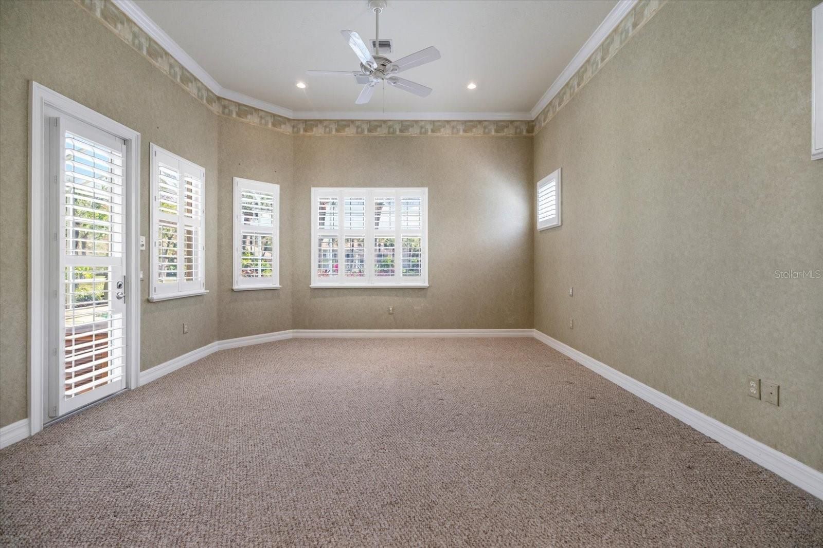 - Ceiling Fan(s), Crown Molding, Eat-in Kitchen, High Ceilings, Living/Dining Room, Open Floorplan, Main Level Primary, Split Bedrooms, Stone Counters, Thermostat, Walk-In Closet(s)