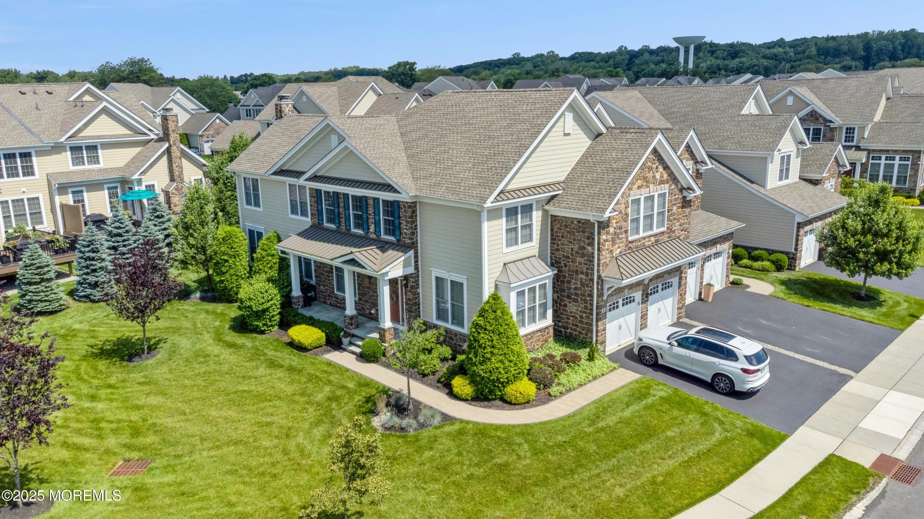 The Regency at Holmdel by Toll Brothers - Premier 55+ Community in Monmouth County. Introducing the spacious Gladstone end-unit model, ideally situated on a premium lot in the prestigious Regency at Holmdel. This beautifully appointed home features 3 bedrooms, 3.5 baths, an oversized loft, and a fully finished basement with an additional full bath plus a full house generator—offering exceptional space and versatility. As you step into the bright and airy interior, you are welcomed by a dramatic two-story foyer. There is a formal dining room & living room, which could also serve as a home office. the first floor boasts hardwood floors w 9-foot ceilings. There is an expansive family room with a gas fireplace, and the gourmet kitchen features a large center island with pendant and recessed lighting, quartz countertops and JennAir appliances. The adjoining breakfast area opens to a private Trex-style deck, perfect for outdoor dining and relaxation, The main level also includes a laundry room, powder room, and direct access to a two-car garage. Upstairs, with hardwood floors, the open loft overlooks the dining room below and leads to the luxurious primary suite with a walk-in closet, built-in valet cabinetry, and a spa-like primary bath complete with double sinks, a glass-enclosed shower, and a dedicated dressing area. Two additional bedrooms share a full bath, with one bedroom offering its own walk-in closet.The fully finished lower level features tiled flooring, a playroom, home office space, kitchenette, ethernet/cable throughout and a full bath ideal for guests, entertaining, or extended living. Enjoy resort-style living with access to a state-of-the-art clubhouse, outdoor pool, tennis, pickleball, and bocce courts. Just steps away from the vibrant Bell Works complex, where you'll find shopping, dining, fitness centers, a public library, farmers markets, and year-round community events. Conveniently located near shopping, dining, transportation, and only 15 minutes to the Jersey Shore this is an exceptional opportunity to enjoy low-maintenance luxury living in one of Monmouth County's most desirable 55+ communities.