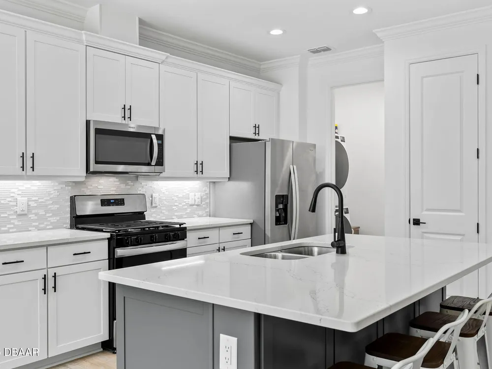 - Washer/Dryer Stacked, Tankless Water Heater, Refrigerator, Microwave, Gas Water Heater, Gas Range, Disposal, Dishwasher
