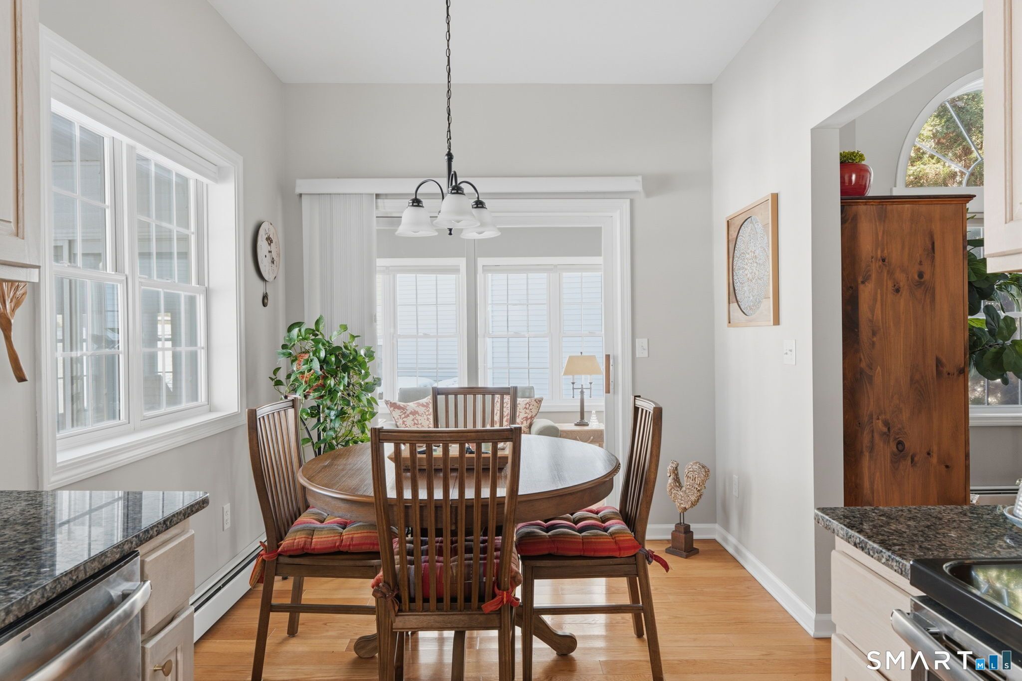 Turn-key, contemporary ranch-style condo located in desirable South Pond Village, a well-maintained 55+ community. Set on a corner location, this move-in-ready home features hardwood floors throughout, fresh interior paint, and a bright, open layout. The spacious living room offers a cathedral ceiling and flows seamlessly into the formal dining room-ideal for entertaining. The remodeled eat-in kitchen features granite countertops, stainless steel appliances, and ample cabinetry. Enjoy year-round relaxation in the four-season sunroom, which opens to a private, covered deck. The home offers two generously sized bedrooms and two full bathrooms, including a primary bedroom with an en-suite bath. Additional highlights include convenient first-floor laundry, a full basement for storage, and a one-car attached garage. A rare opportunity for easy, low-maintenance living in a peaceful community close to shopping, dining, and major routes.