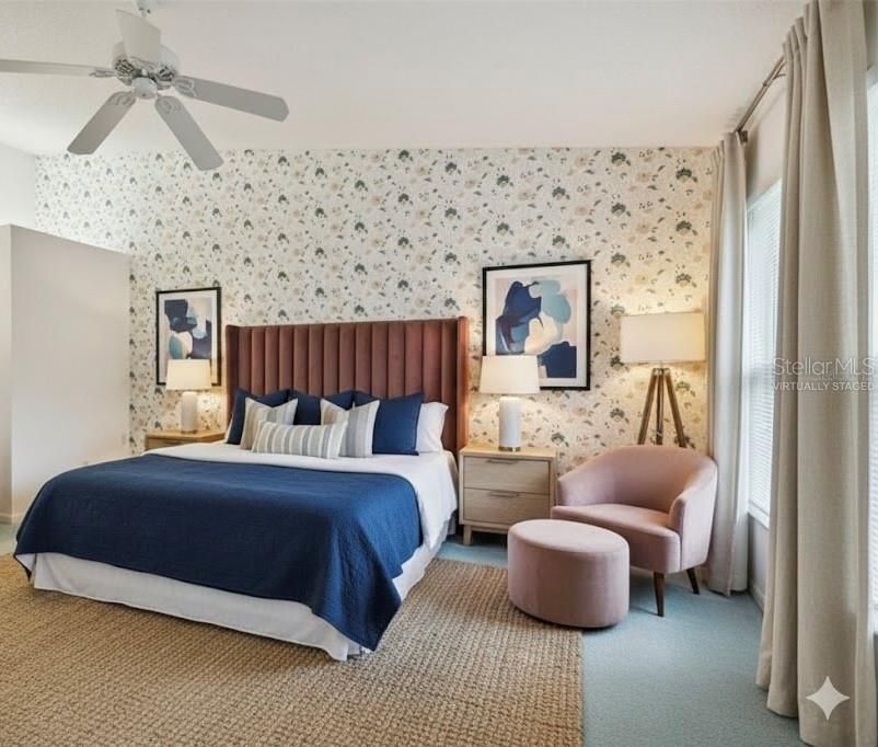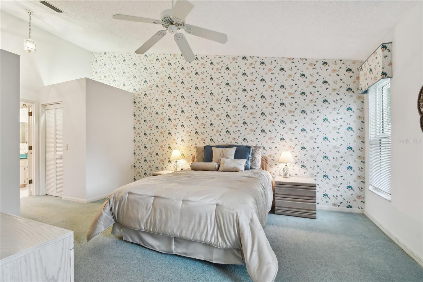 - Cathedral Ceiling(s), Ceiling Fan(s), Chair Rail, Eat-in Kitchen, High Ceilings, Main Level Primary, Solid-Wood Cabinets, Stone Counters, Thermostat, Walk-In Closet(s), Window Treatments