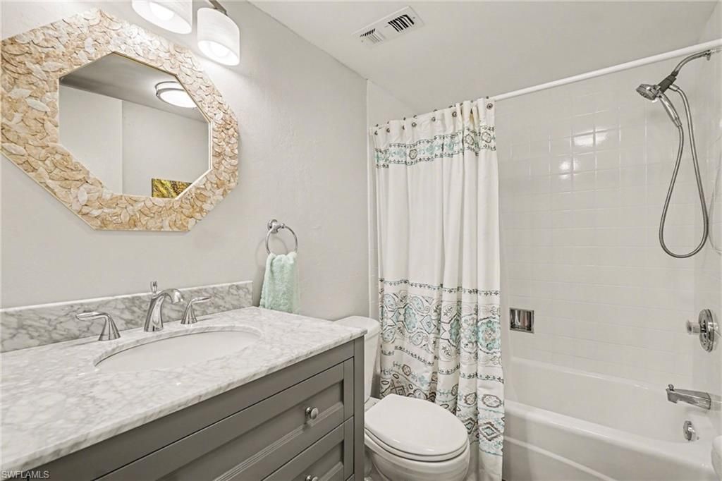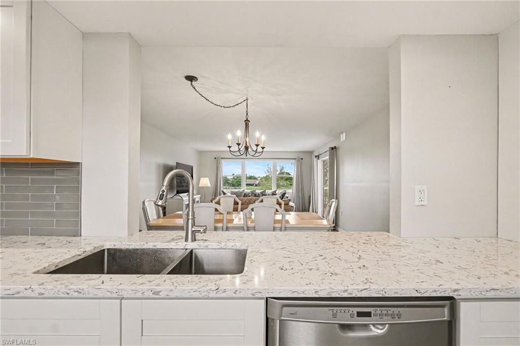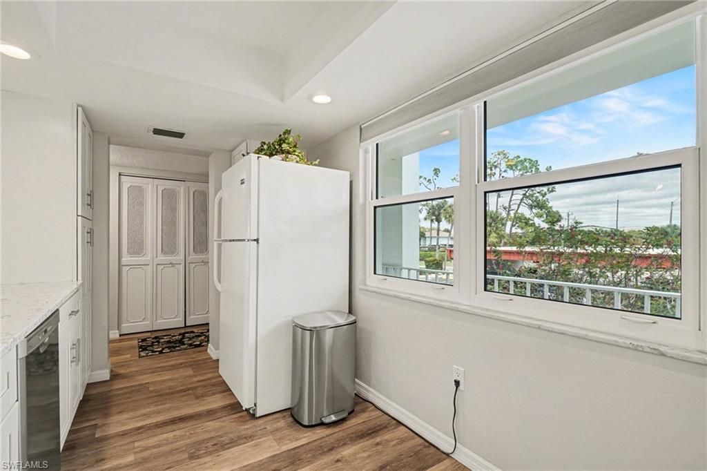 Welcome home! This condo showcases a bright, inviting layout with luxury vinyl flooring and custom blinds throughout. Wake up to serene views and embrace true indoor-outdoor Florida living, with sliding glass doors from the living room, primary suite, and guest bedroom opening to an expansive screened-in lanai—perfect for morning coffee, relaxing afternoons, and sunset evenings. The kitchen features quartz countertops, white shaker cabinetry, recessed lighting and pantry. The primary suite offers a peaceful retreat with a large walk-in closet and an en-suite bath with raised vanities. Impact windows provide comfort and added peace of mind. This residence is offered furnished and includes a dedicated carport (#38) and golf cart space (#G6) for added convenience. Located in Seven Lakes, a gated 55+ bundled golf and tennis community, residents enjoy both an active and secure environment with 24-hour guard-gated access. Unlimited golf on the 18-hole executive course is included with no green or trail fees. Amenities include a resort-style pool, tennis and pickleball courts, fitness center, clubhouse dining, billiards, card rooms, woodshop, and a full calendar of social events. Near RSW Airport, beaches, shopping, dining, and downtown Fort Myers. Monthly fees cover everything except electric.
