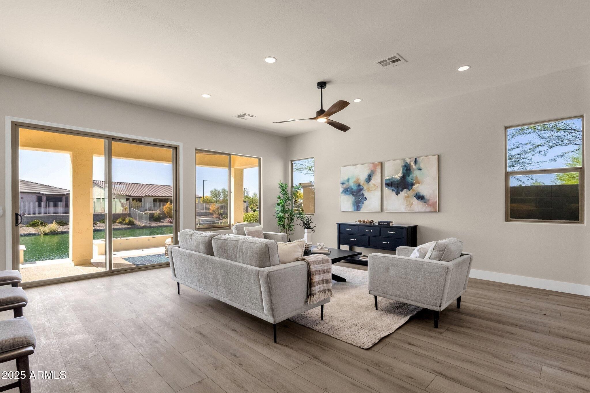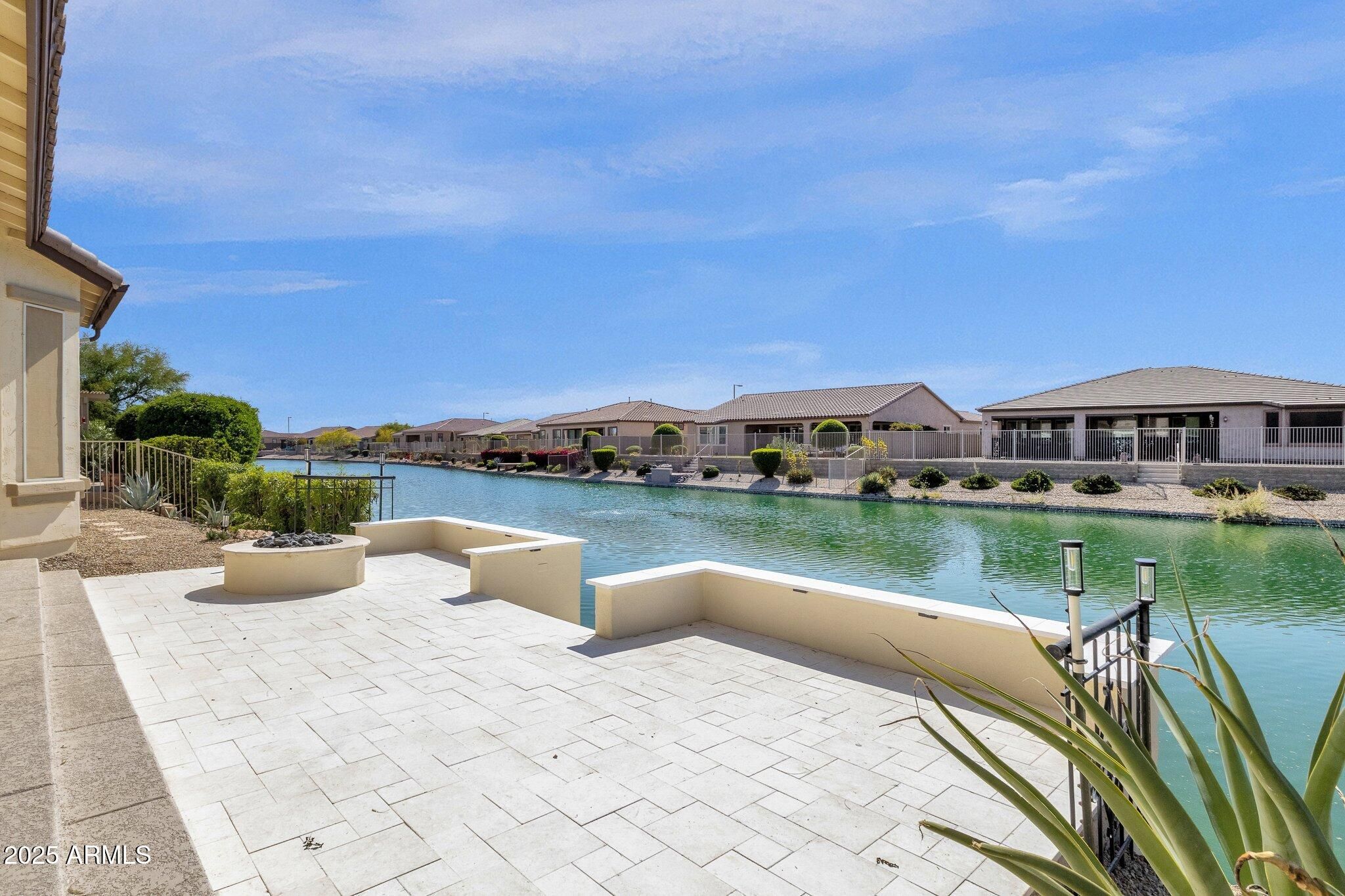 Welcome to this beautifully redesigned Ballad floorplan, located in the highly desirable, lake-inspired active adult community of CantaMia. Perfectly positioned on a premium lakeside lot with only one adjacent neighbor, this home offers rare privacy while being surrounded by panoramic mountain and lake views. Step through the private, enclosed front courtyard—an ideal spot to enjoy your morning coffee with unobstructed views of the Estrella Mountains. In the evening, unwind or entertain in your serene backyard oasis overlooking the tranquil community lake. Inside, the main residence showcases an open-concept design with 2 bedrooms, a versatile den/office, and a 2-car garage. The home has been fully renovated, featuring a stunning chef's kitchen with luxury cabinetry and granite