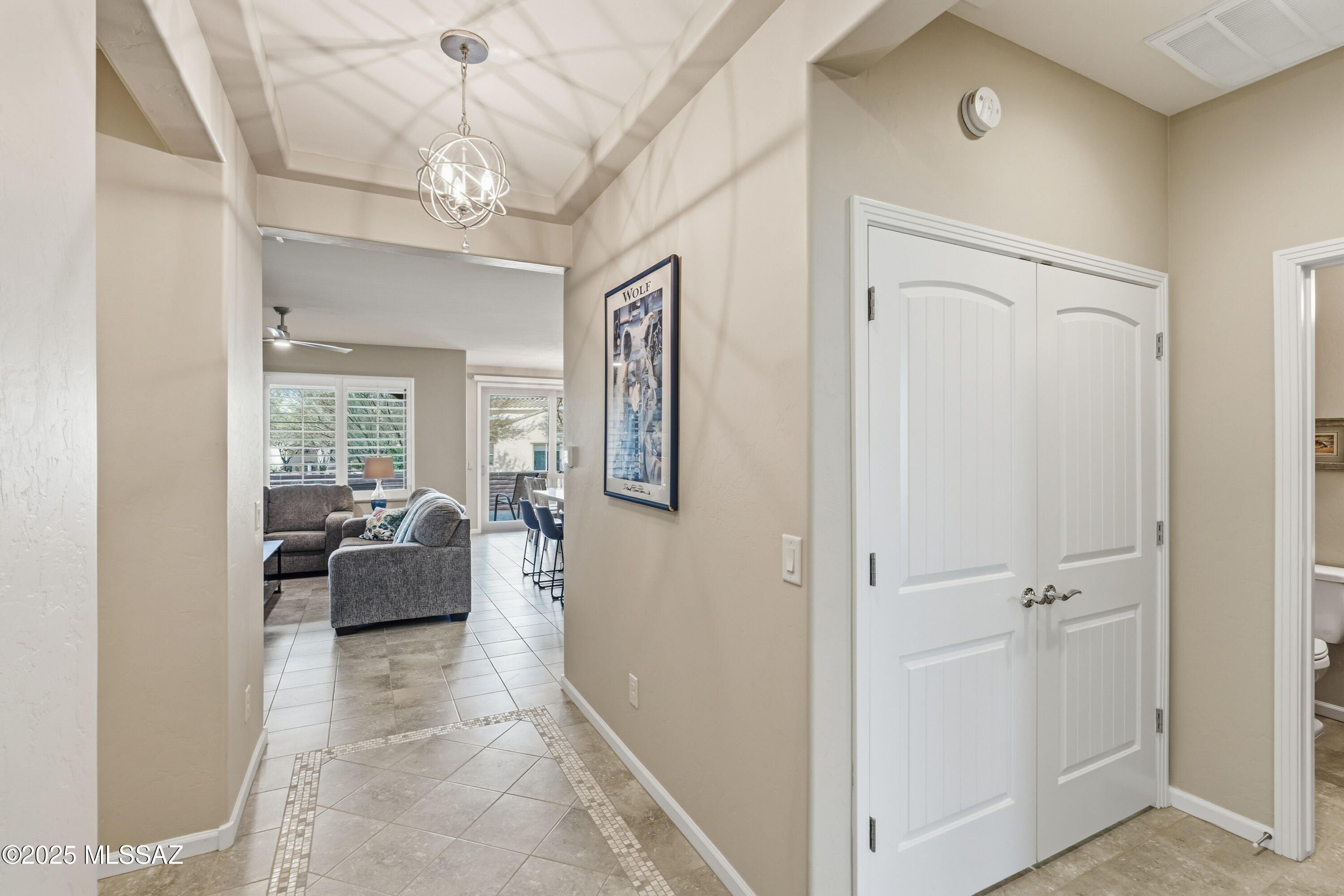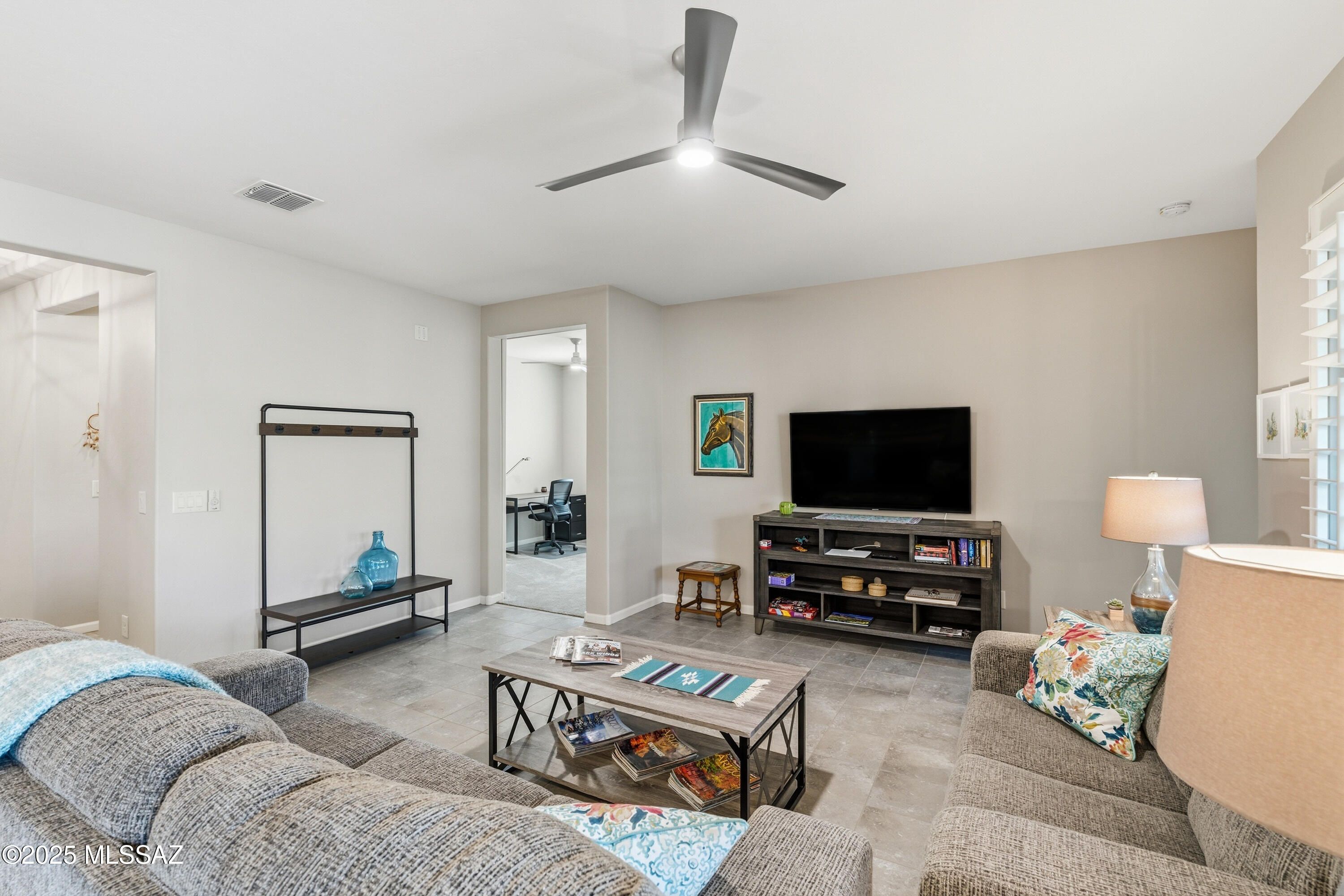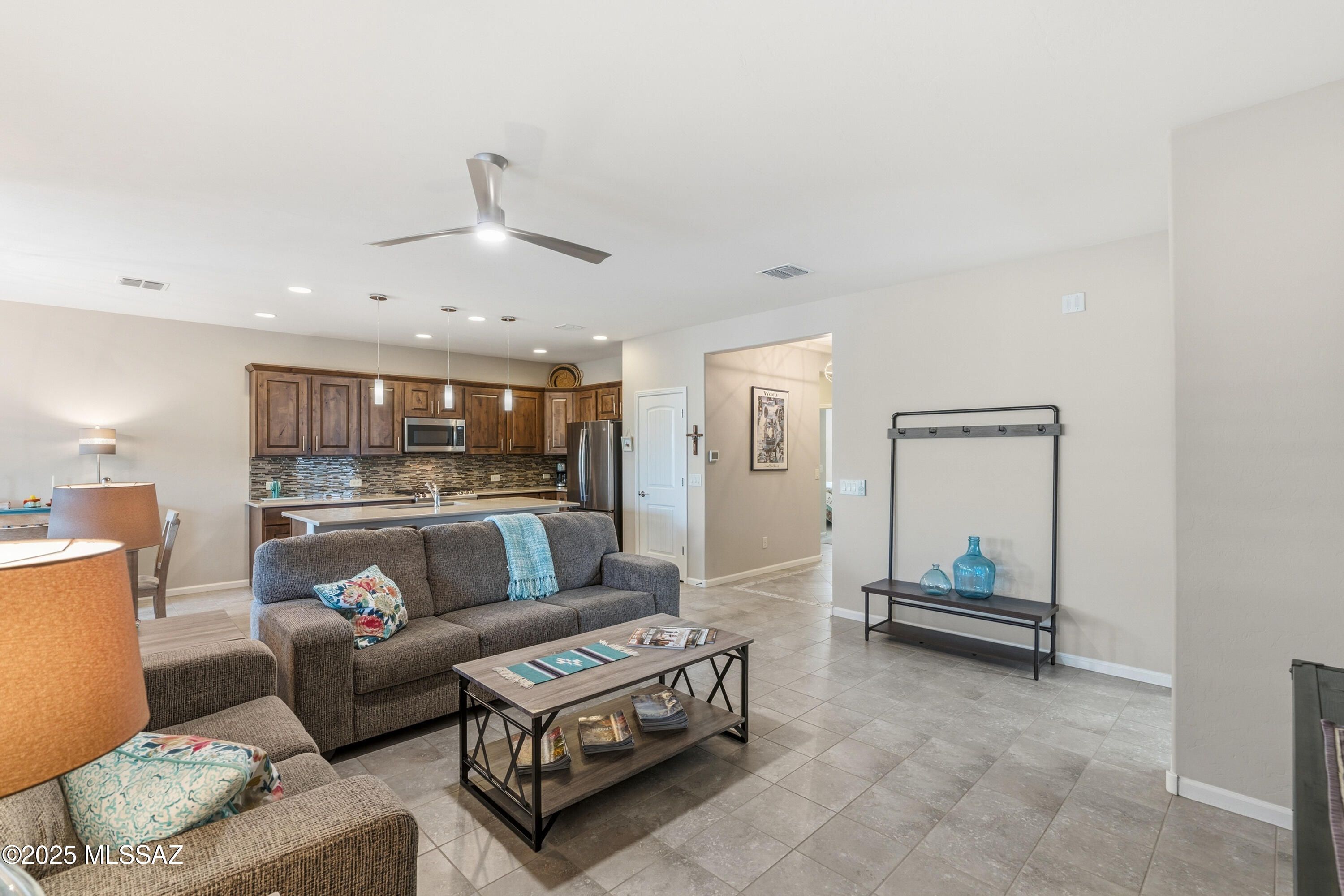 MOVE-IN READY! This charming 2019 Cholla model in Quail Creek resort community is FULLY FURNISHED, and offers 1,399 sq.ft., 2 BR, 2 BA +Den. Inside are tile floors in the common areas, upgraded fans and lighting, and plantation shutters. Well-appointed kitchen has upgraded knotty alder cabinets, quartz counters, tile backsplash, island with single bowl composite sink and pendant lighting, stainless appliances, incl. slide-in gas range, and pantry closet. Owner's suite has dual vanity bath, tile shower, walk-in closet. Located on a corner lot backing to common area and lush landscaping. Ideal for full or part-time living, or as an investment property. Villas HOA covers hazard insurance, exterior paint, roof, window and exterior maintenance, front landscaping, and common area maintenance.