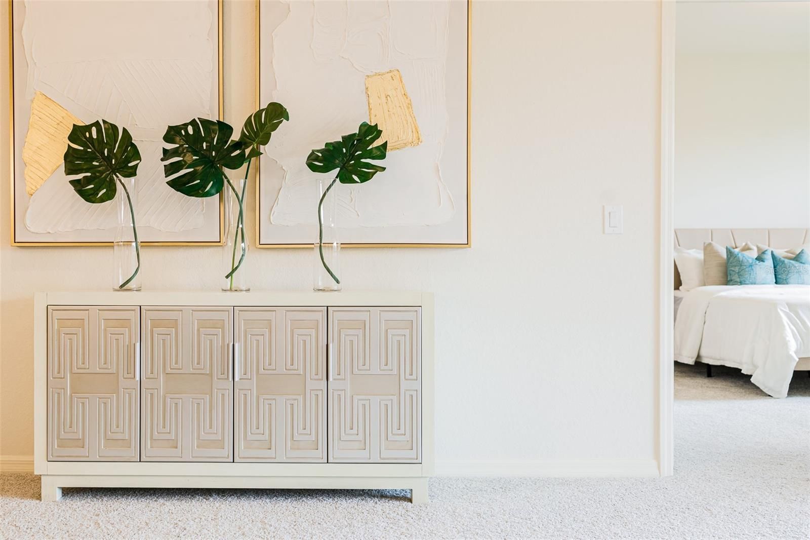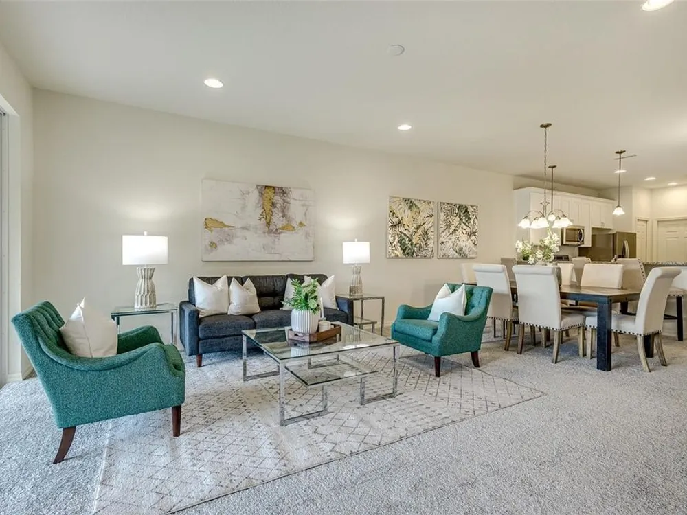 - Built-in Features, High Ceilings, Kitchen/Family Room Combo, Open Floorplan, Main Level Primary, Stone Counters, Thermostat, Walk-In Closet(s)