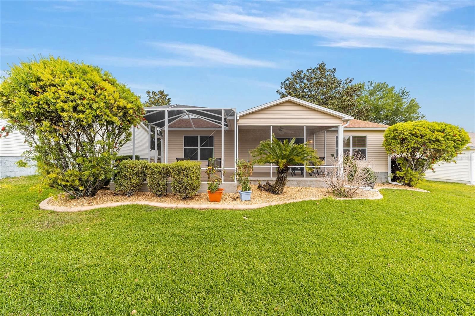 Welcome to this TURNKEY 3-bedroom, 2-bath CORPUS CHRISTI model located in the highly desirable VILLAGE OF WOODBURY, offering the rare advantage of NO BOND. This well-maintained home features ROCK LANDSCAPING for low-maintenance curb appeal and a GARAGE SCREEN, perfect for enjoying Florida’s breezes. Inside, the main living areas showcase ENGINEERED HARDWOOD FLOORING, while the bedrooms are comfortably carpeted. The kitchen includes TILE BACKSPLASH, STAINLESS STEEL APPLIANCES, BRAND NEW refrigerator, a GAS STOVE, and a SOLAR TUBE that fills the space with natural light. The spacious master suite includes a WALK-IN CLOSET, and the master bath offers a WALK-IN SHOWER for convenience and ease. The guest bathroom & 2 bedrooms are on the opposite side making it great when having guest. Outdoor living is a standout feature, with a SCREENED LANAI that opens to an EXPANDED BIRDCAGE, creating the ideal space for relaxing or entertaining. Other features include ROOF (2018), HVAC (2013), and BRAND NEW Dryer. This home is ideally located near Nancy Lopez Legacy Country Club and its Championship Golf Course, as well as Mulberry Grove Recreation Center, Springdale Fitness and Walking Trail, Mulberry Dog Park, and a nearby neighborhood pool and recreation center, offering a wide range of amenities just minutes away. This is a MOVE-IN READY opportunity in one of The Villages’ most convenient locations. Golf cart available separately!