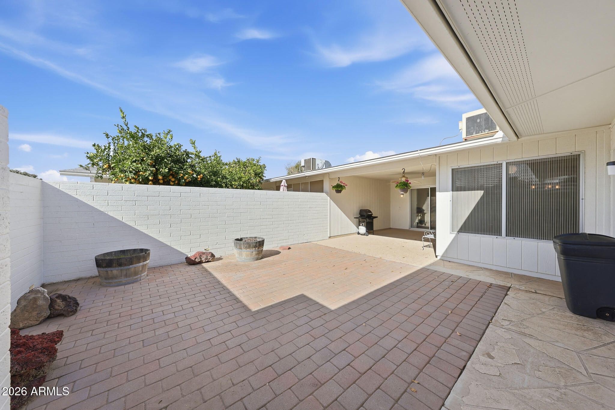 Step into your private sanctuary in the highly coveted 55+ Palm Grand community. This stunning patio home welcomes you with a gorgeous courtyard entry, leading into a bright, open-concept floor plan. The home features two spacious bedrooms and two bathrooms, complemented by an attached garage with built-in storage cabinets. Enjoy your morning coffee or sunset cocktails on the private covered patio, your own quiet outdoor retreat. With all appliances included, this home is truly move-in ready. As a Sun City resident, you aren't just buying a home; you're gaining access to an unmatched lifestyle: 8 recreation centers, 8 golf courses, sparkling pools, and endless social clubs. Plus, you're just minutes away from the premier dining and shopping at Arrowhead Mall and the vibrant P83 District.