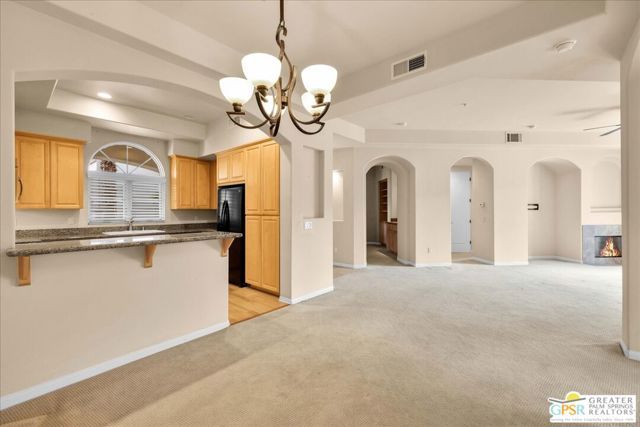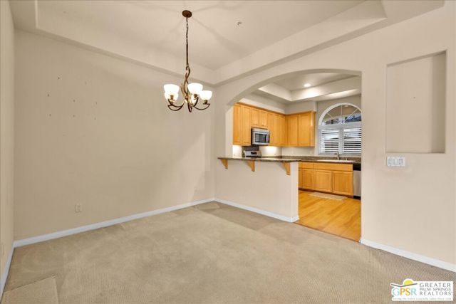 Welcome to Villa Portofino! Premier 55+ Living in Palm Desert! Step into luxury and ease with this beautifully designed 2-bedroom, 2-bathroom + den/office condominium, offering 1,559 sq. ft. of comfortable, single-level living - no stairs, no hassle! Perfectly situated on the first floor, this sought-after floor plan ensures effortless access, making it ideal for those with mobility concerns. From the moment you enter, you'll be greeted by an inviting open layout, high coffered ceilings, and abundant natural light streaming through charming glass-paneled windows. The spacious kitchen is a chef's delight, featuring maple cabinetry, slab granite countertops, and stainless steel and black appliances, a perfect blend of function and style. The primary suite is a true retreat with a sitting area, a large walk-in closet, and an en-suite bath boasting dual vanities, a separate soaking tub, and a walk-in travertine shower. The guest bedroom, located on the opposite side for privacy, also features a walk-in closet and a beautifully appointed bath. A versatile den/office with wet bar offers flexibility, ideal for a home workspace, hobby room, or additional guest accommodations. The private patio, framed by lush desert landscaping, provides a peaceful outdoor space for morning coffee or evening relaxation. Experience Resort-Style Living! Villa Portofino isn't just a place to live, it's a place to thrive! The community is designed for active adults who want the perfect balance of relaxation, social connection, and recreation. The 30,000 sq. ft. clubhouse is the heart of Villa Portofino, offering a state-of-the-art fitness center, yoga studio, resort-style pool & spa with poolside service, a game room, billiards, a cantina, a 100-seat private movie theater, and a vibrant social calendar filled with special events and activities. Whether you're looking to stay fit, make new friends, or just unwind, there's something for everyone. Looking to get involved? Join one of Villa Portofino's exclusive member clubs, where you can connect with like-minded neighbors through activities like Texas Hold 'Em, Bridge, Mahjong, Bunco, Canasta, Rummikub, knitting, book club, and more! Dine & Unwind at The Bistro! No need to go far for a delicious meal! The Bistro at Villa Portofino serves up chef-inspired seasonal favorites, from fresh salads to hearty sandwiches and signature entrees, all perfectly paired with refreshing cocktails or your favorite bottle of wine. Enjoy daily Happy Hour, a Saturday Bloody Mary Bar & Brunch, Pasta Nights, specialty holiday meals, and rotating chef specials, all just steps from your front door. Members receive a weekly newsletter with the latest dining events, ensuring you'll never miss out on a great meal or social gathering. Worry-Free, Low-Maintenance Living! Your HOA dues include: Cable TV & high-speed internet, Water & trash service, Exterior building & roof maintenance, "walls out" fire and earthquake Insurance, Window washing & landscaping, Full clubhouse access & amenities! Prime Palm Desert Location! Villa Portofino is minutes from top-rated dining, shopping, golf, entertainment, and the Eisenhower Medical Center, offering both convenience and peace of mind. This is more than a home, it's a lifestyle. Don't miss this rare opportunity! Schedule your private showing today and experience the best of Villa Portofino living!
