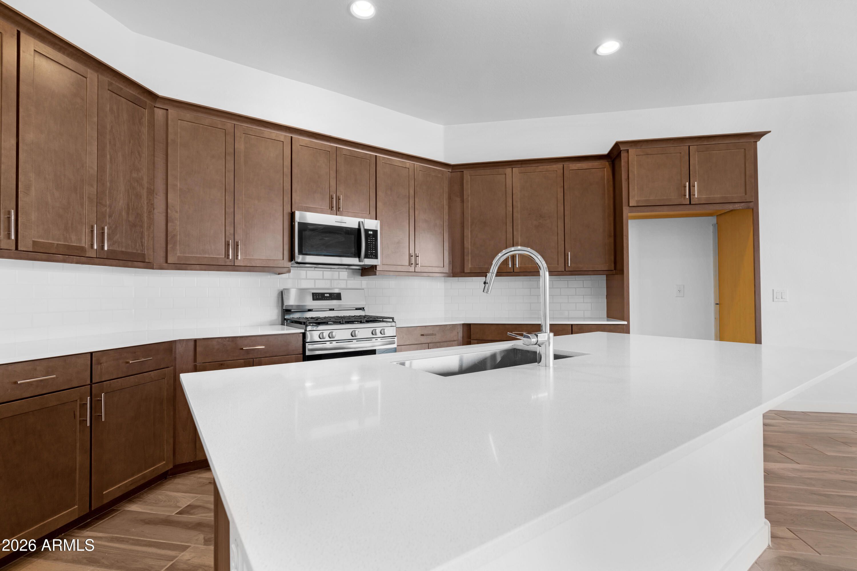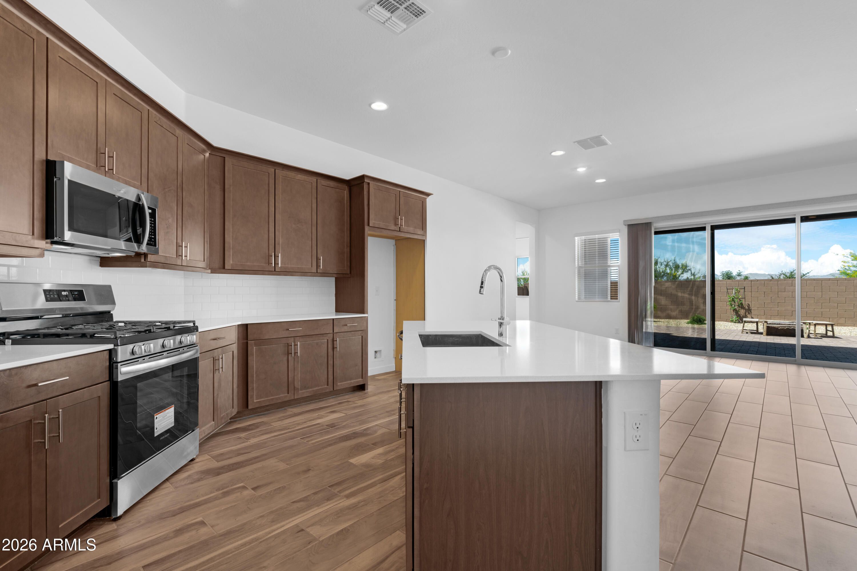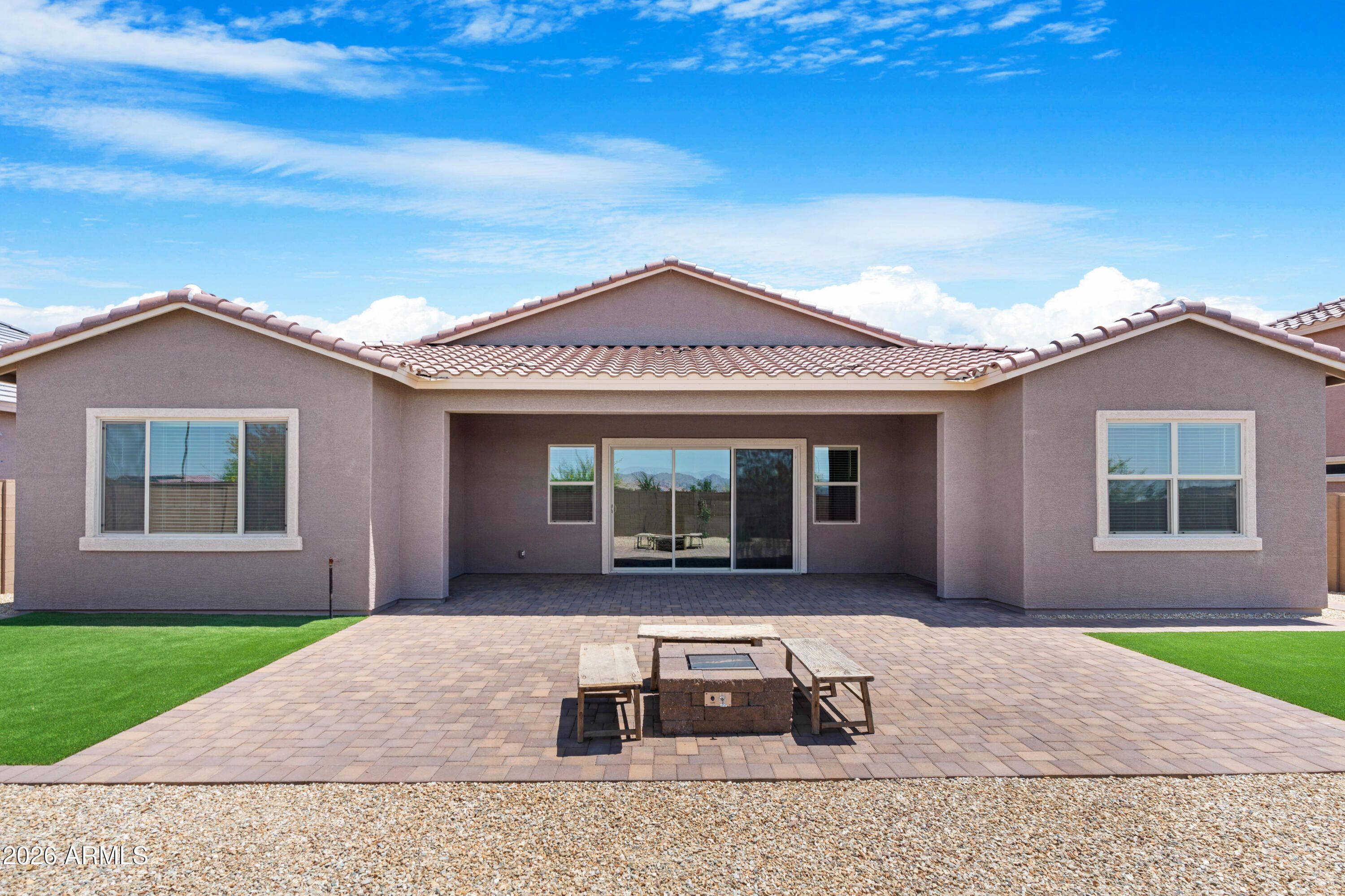 Stunning 2-Year-Old Single-Story Home with Mountain Views, Upgrades & finished Backyard! Why wait to build? This beautifully designed, nearly new single-story home offers 4 spacious bedrooms including a private mini master suite perfect for guests or multigenerational living. Plus a dedicated office, ideal for remote work and flexible living needs. Step inside to an open-concept layout with tasteful upgrades throughout, perfect for both everyday comfort and entertaining. A large three-panel sliding glass door seamlessly connects the indoor living space to the outdoors, leading to an extended covered patio with pavers and a built-in gas fire pit. It's the perfect setting to relax and take in the breathtaking mountain views, all surrounded by a finished landscaped backyard. Complete with a 3-zone air conditioner, upgraded 42" cabinets and quartz counters. From its thoughtful layout to its modern finishes and scenic outdoor living space, this home offers the best of Arizona living, move-in ready and full of charm!