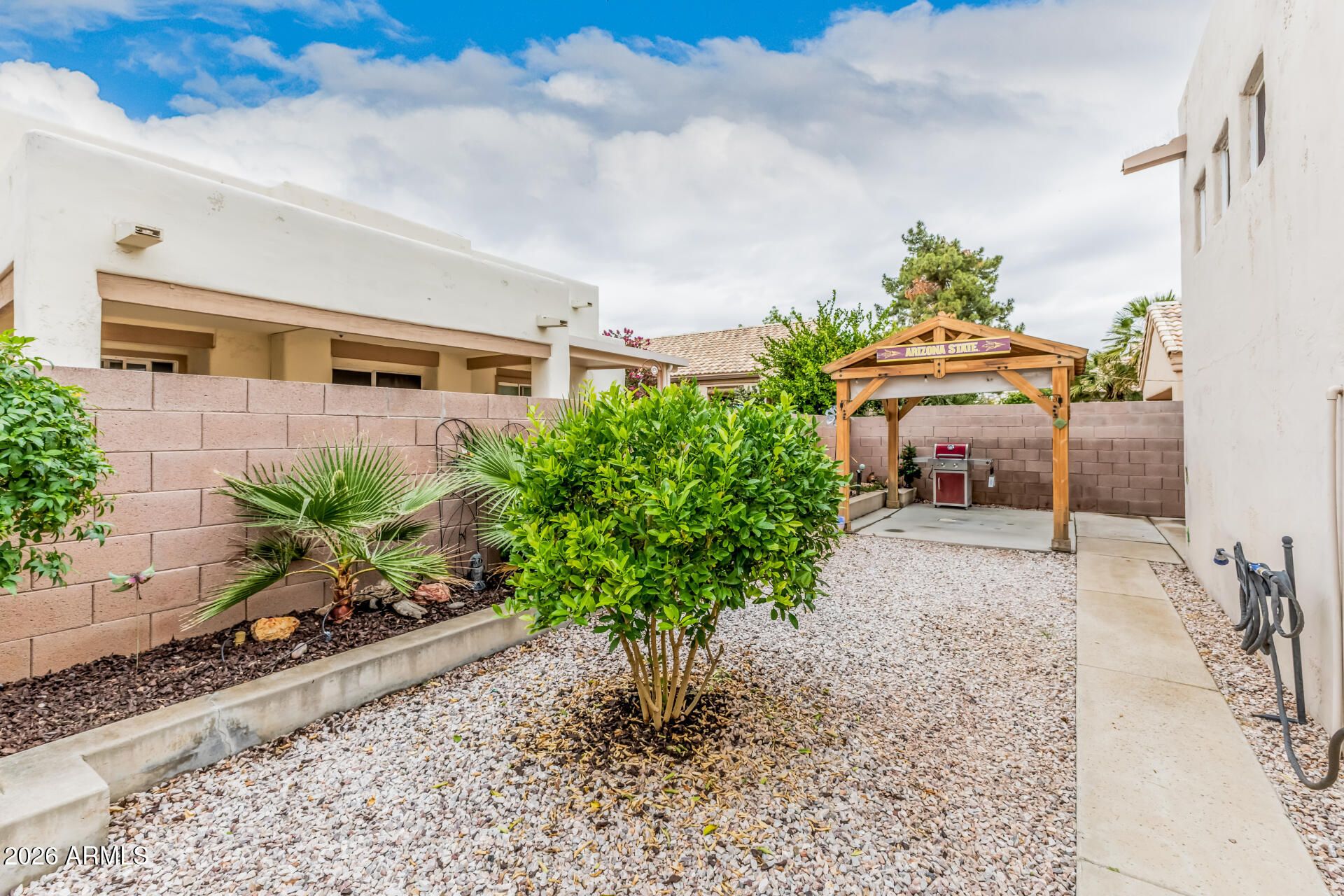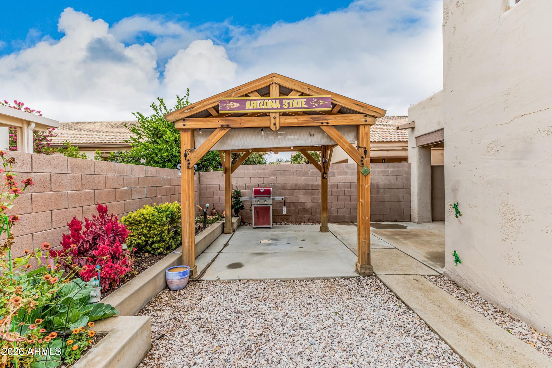 Located in a desirable guard-gated adult community, this 2-bedroom, 2-bath home offers a split primary layout with a walk-in closet for added privacy and comfort. The eat-in kitchen and skylights create a bright, inviting interior ideal for everyday living. Enjoy community amenities including a heated pool, tennis courts, and a clubhouse. Out back, relax or entertain on the patio with a charming gazebo, perfect for enjoying Arizona's outdoor lifestyle.