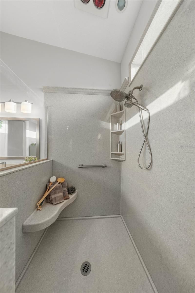 - Built-in Features, Ceiling Fan(s), Eat-in Kitchen, High Ceilings, Main Level Primary, Solid Surface Counters, Split Bedrooms, Walk-In Closet(s)