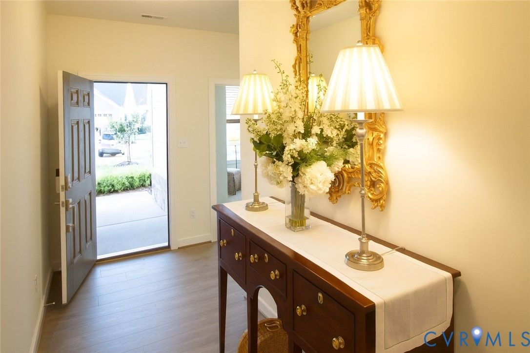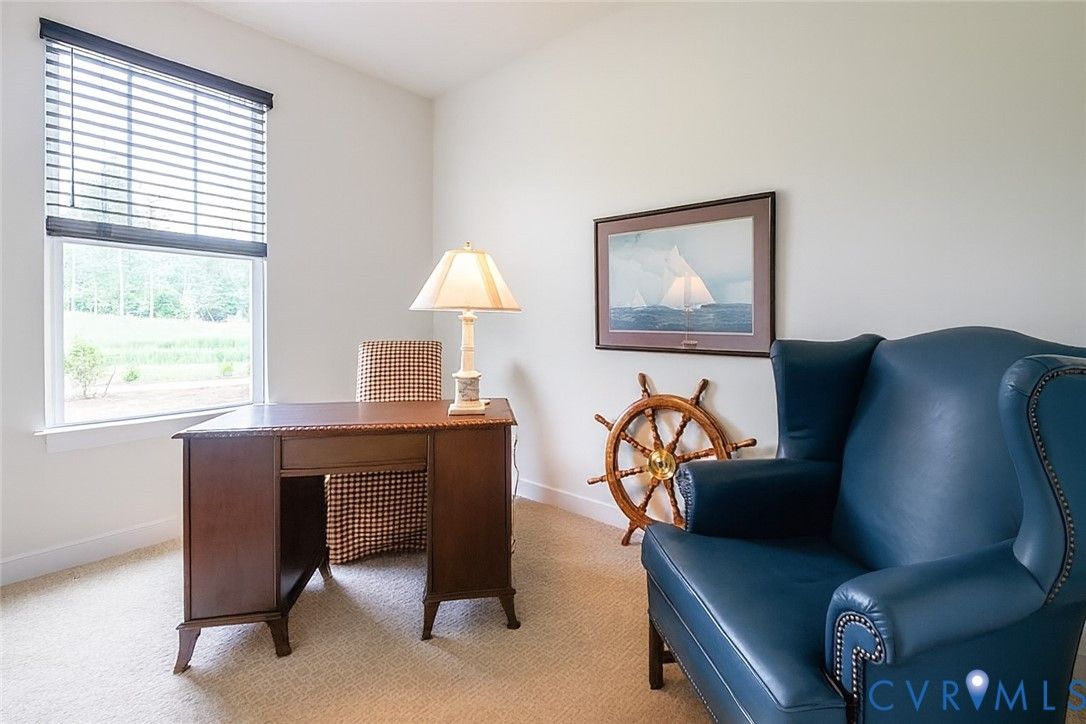 Located in Twin Rivers, the newest neighborhood in Meadowville Landing, this beautiful riverfront community offers resort-style amenities including a water park and pool, scenic ponds for fishing, a river walk, and a community dock along the James River. With easy access to I-295, I-95, and Route 10, you’re just minutes from everything Richmond has to offer! The kitchen features a custom range hood, large island with granite countertops, gas cooking, and plenty of pantry space. It flows into the dining area and family room, creating an open layout perfect for gatherings. Elegant chandeliers add a stylish touch.The owner’s suite offers a tray ceiling, walk-in closet, and private bath with a frameless glass shower, double vanity, and ceramic tile finishes. The second bath includes a soaking tub with a tile surround. All bedrooms have soft low-pile carpet and custom blinds for comfort. A patio off the dining area provides a great space for relaxing or entertaining outdoors.