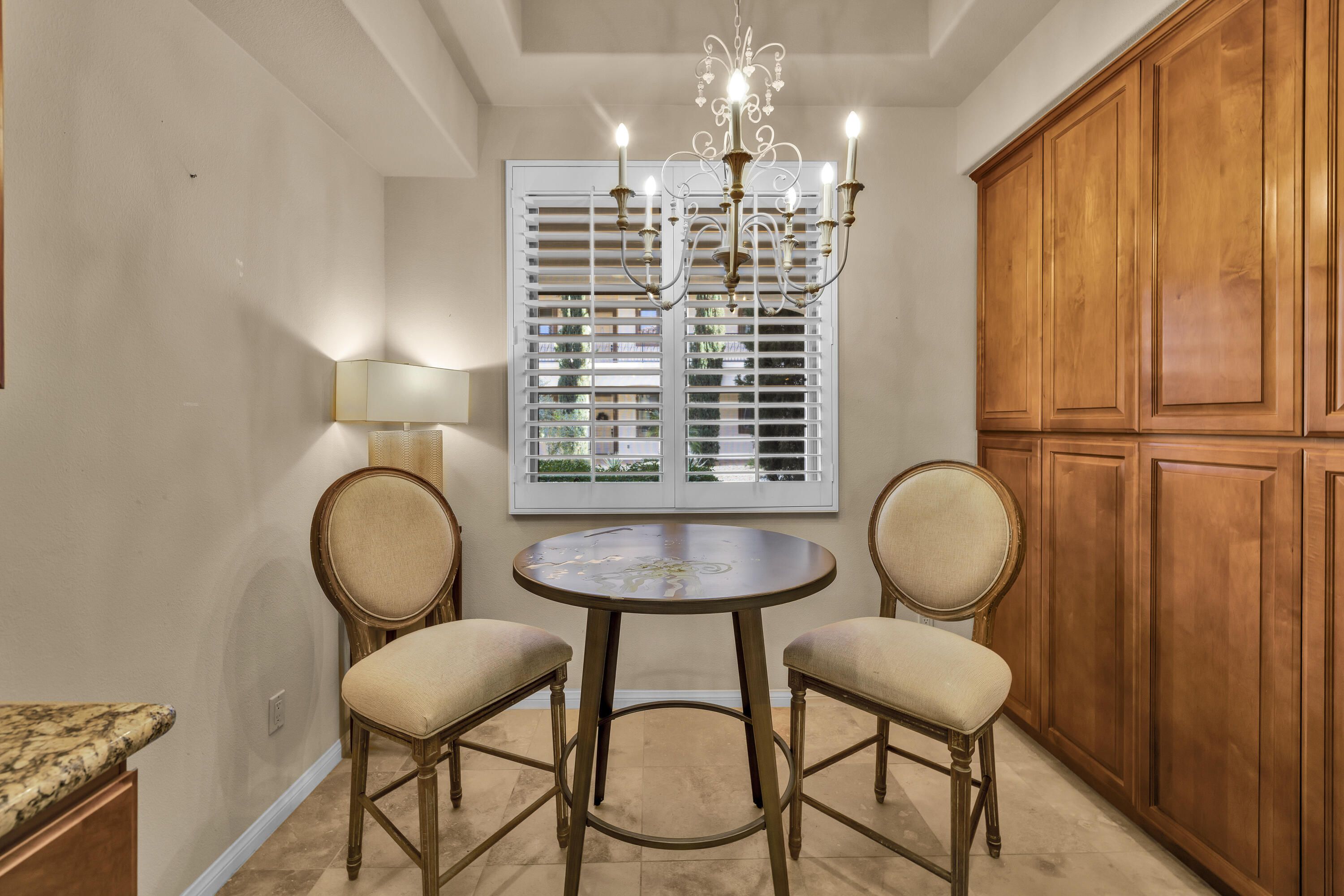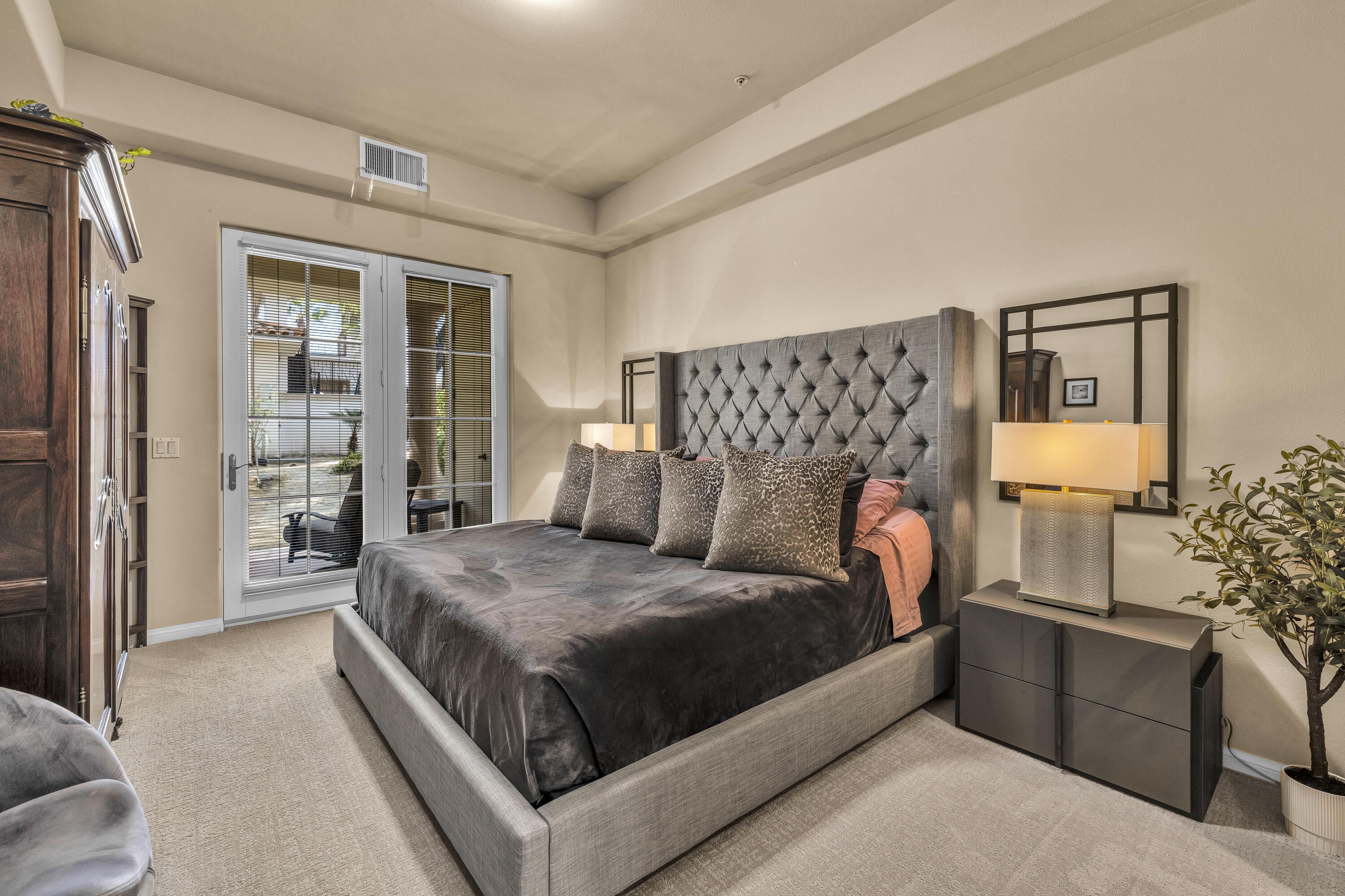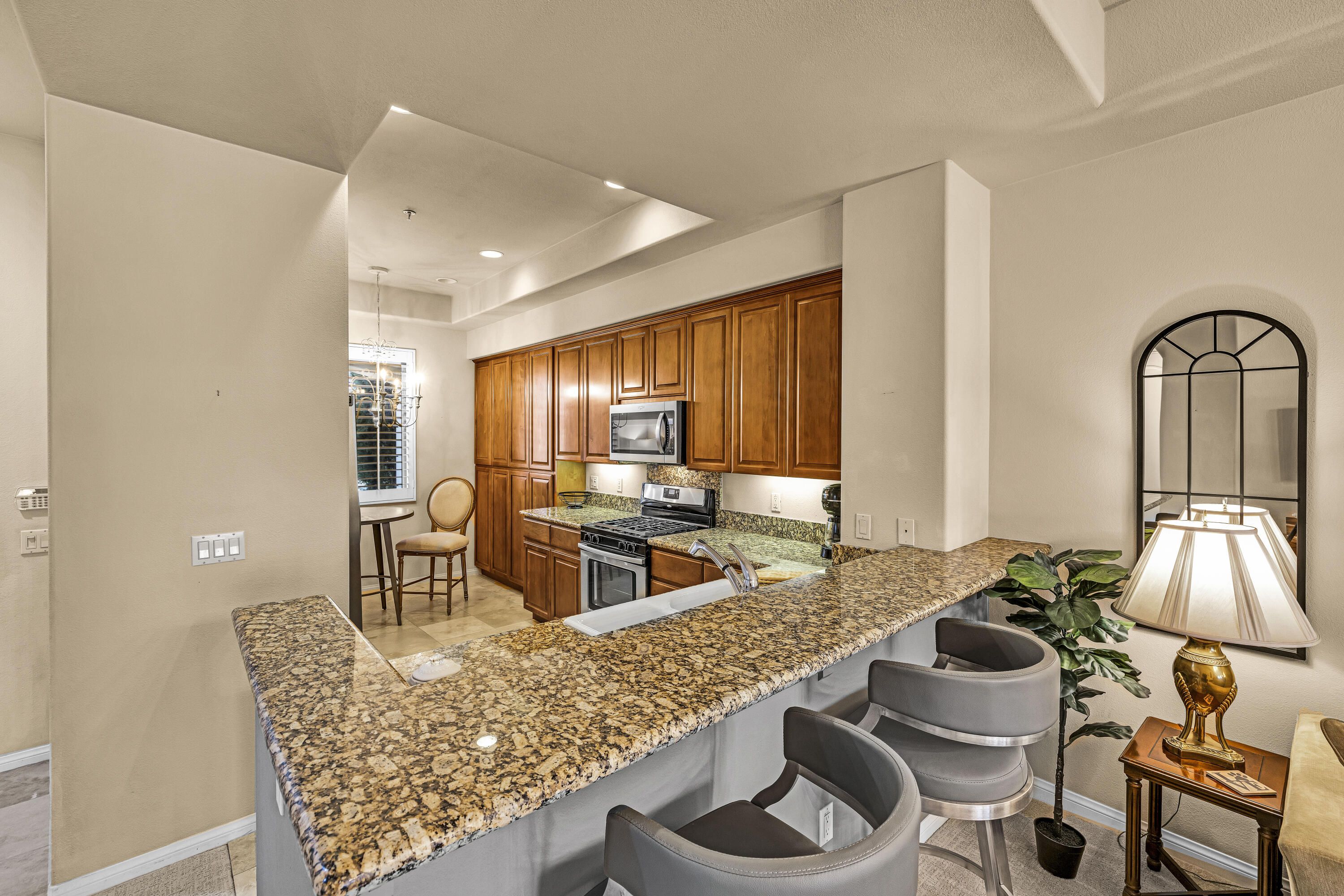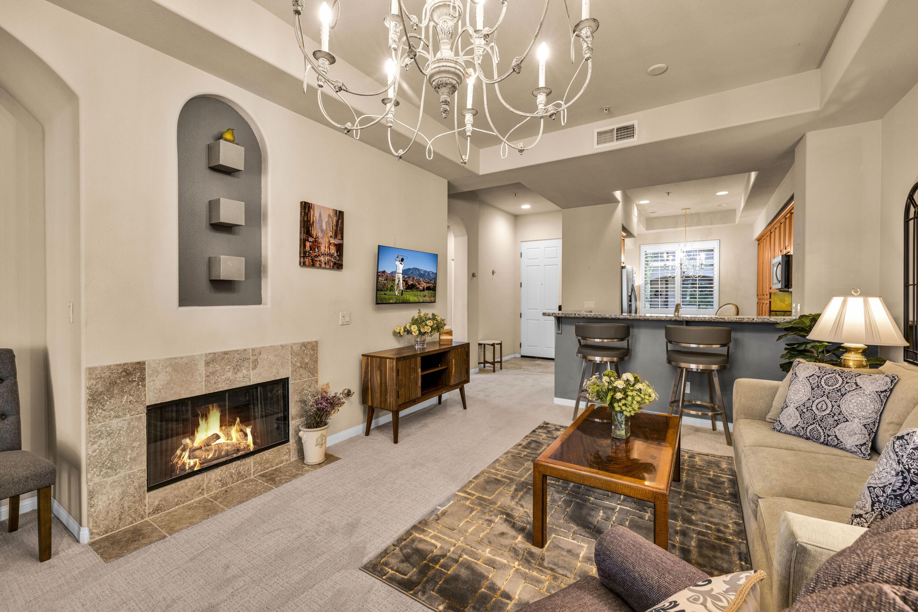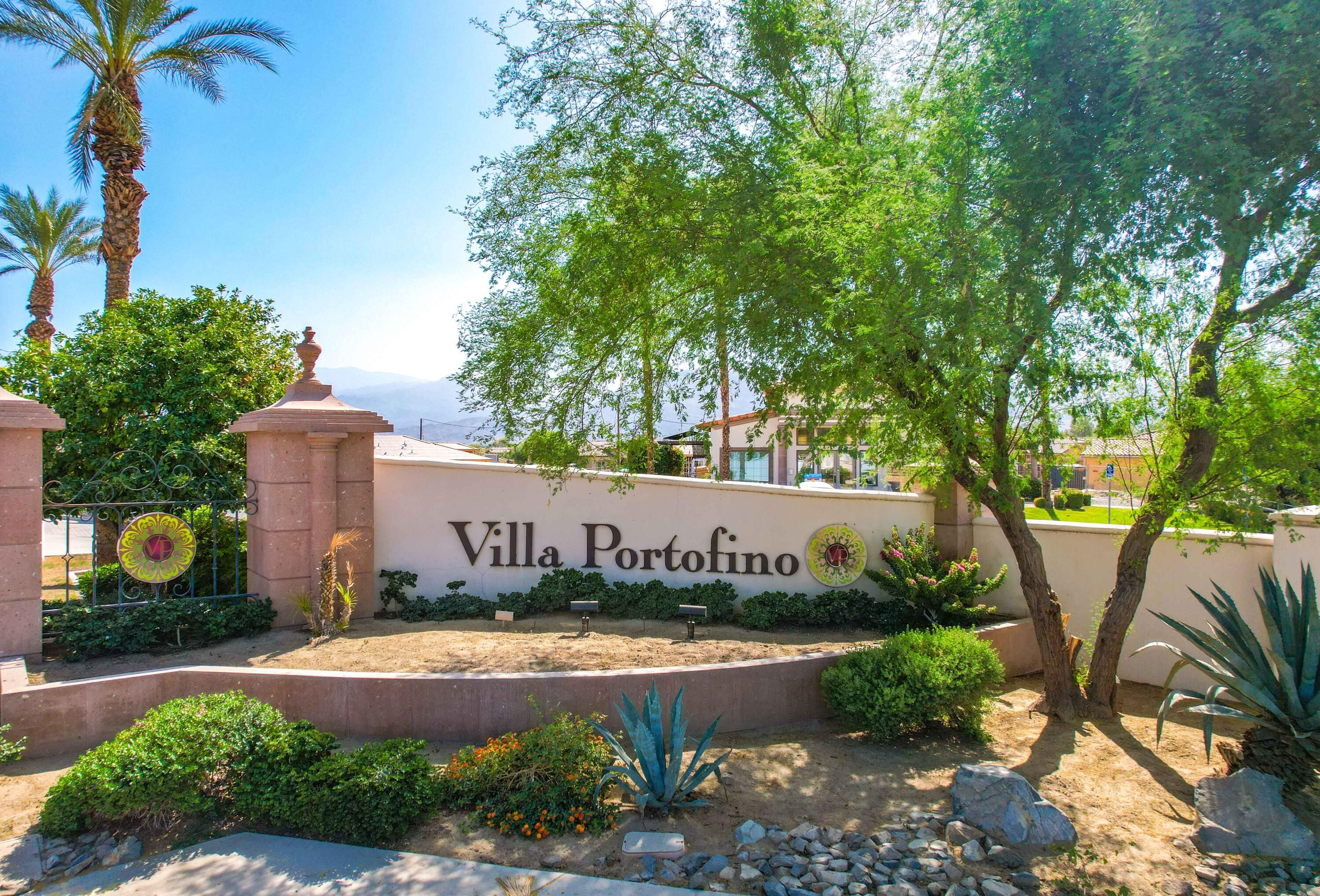 Embrace desert living in this upgraded and inviting 1 bedroom, 1-bathroom great room condo in the prestigious Villa Portofino, an active senior community. Excellent Palm Desert location near shopping, dining and more. Enter the tastefully appointed ground level unit and immediately feel the comforts of home with tray ceilings, New carpet, tile rimmed gas fireplace, wet bar and French doors leading to west facing back patio with peek-a-boo mountain views. Spacious kitchen has granite slab counters, stainless steel appliances. Nice tile floors, plantation shutters, pantry, breakfast nook with morning sunshine plus breakfast bar. Master bedroom with southern mountain view and walk-in closet. Bathroom with stylish step in shower, soaking tub, two vanities with granite counters. Stacked washer and dryer. Newer Trane air conditioner. 1 assigned covered carport space. Furnished per inventory list. Villa Portofino has a wonderful community area. A barbecue area, with panoramic mountain views, Start enjoying the good life. Villa Portofino offers an unmatched lifestyle with a 30,000 sq. ft. clubhouse boasting two restaurants, a private theater, fitness center, game room, pool & spa, bocce ball, shuffleboard, and a vibrant social calendar. HOA dues cover cable, water, trash, landscaping and clubhouse access. Located minutes from El Paseo's luxury shopping and dining, Eisenhower Medical Center, and Bristol Farms. Easy to show. 55 and over.