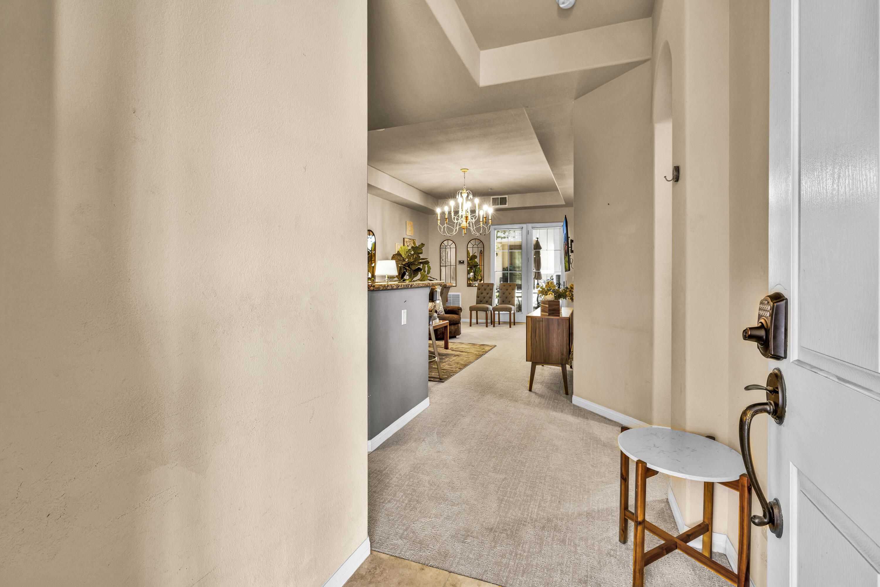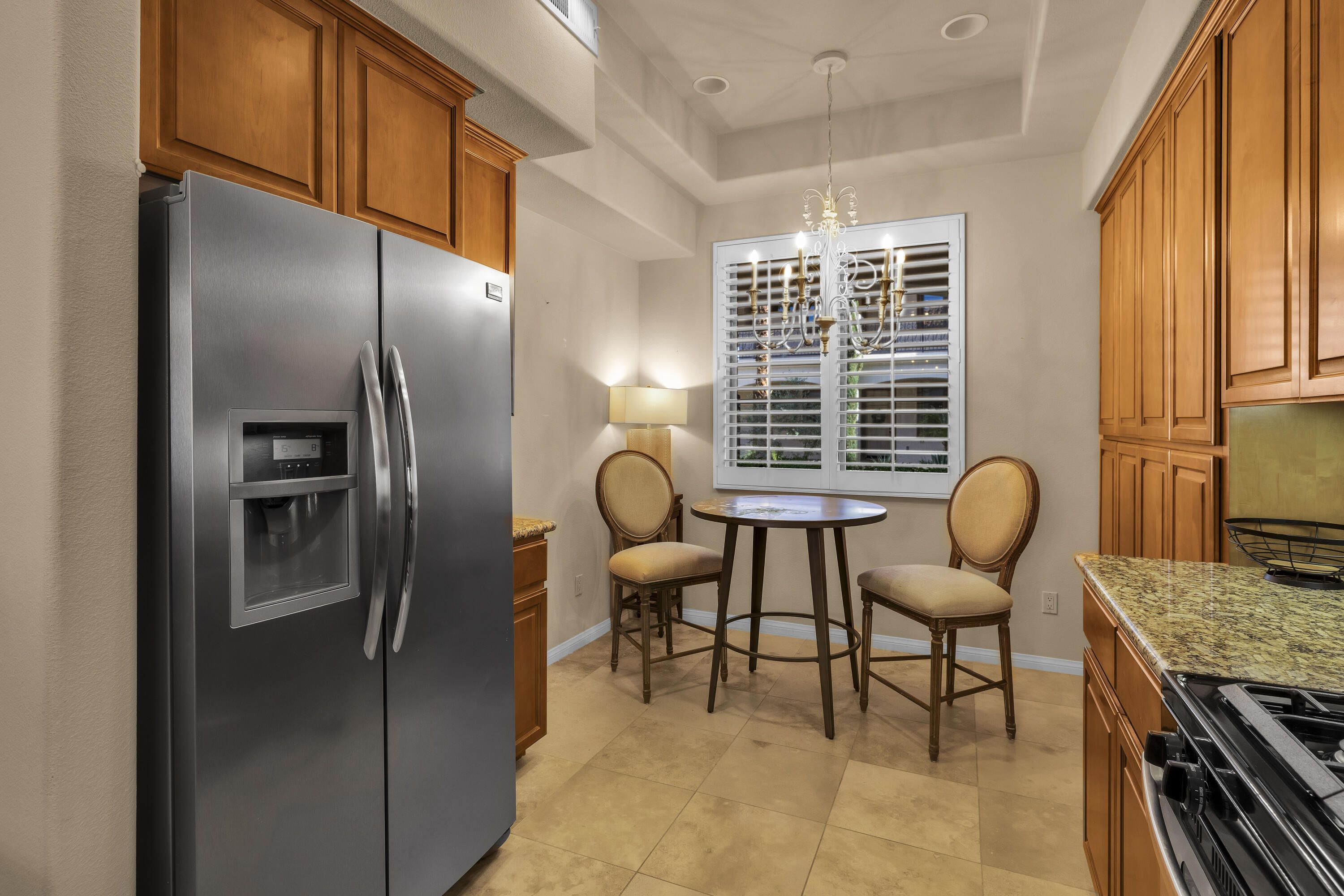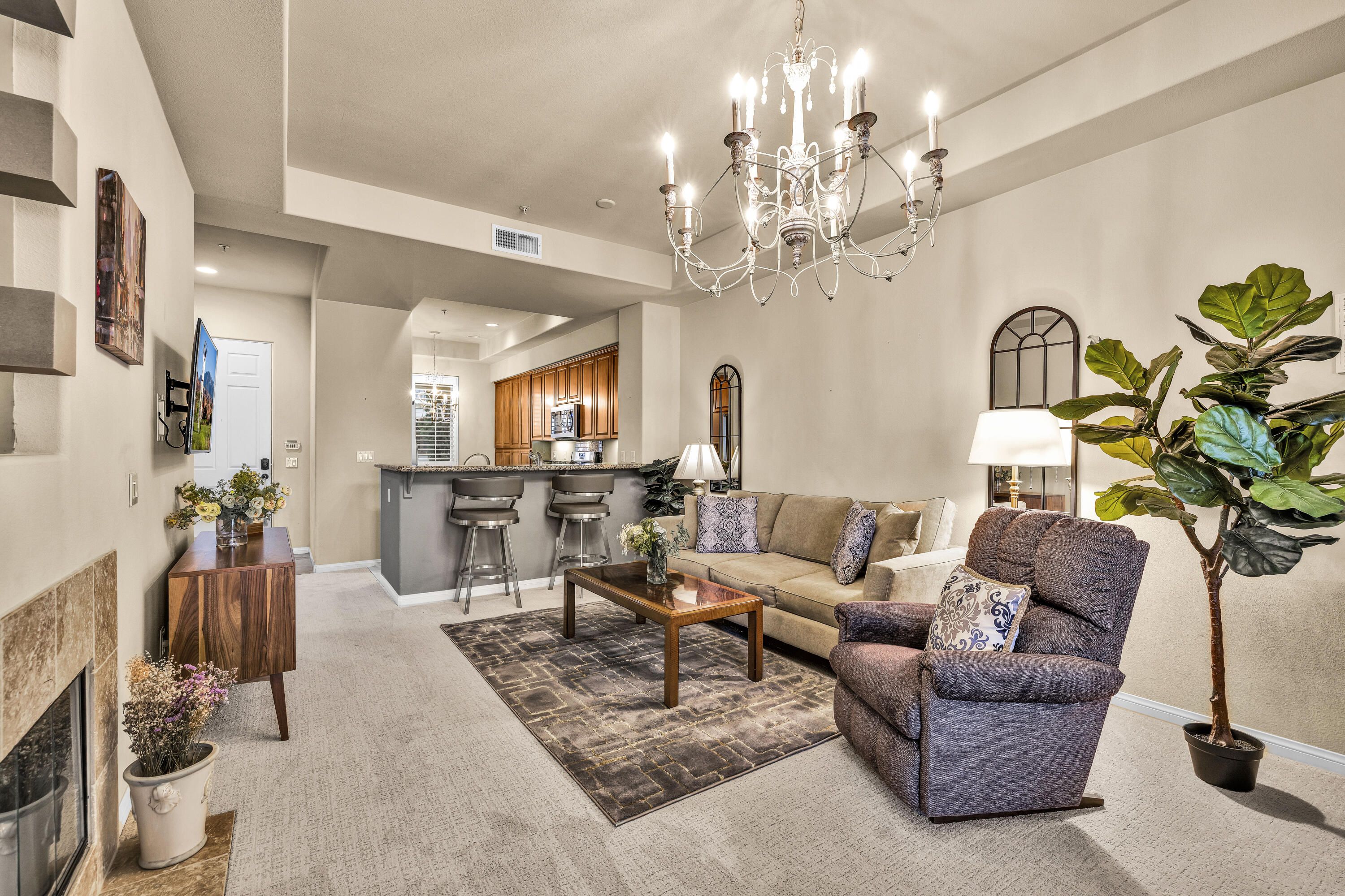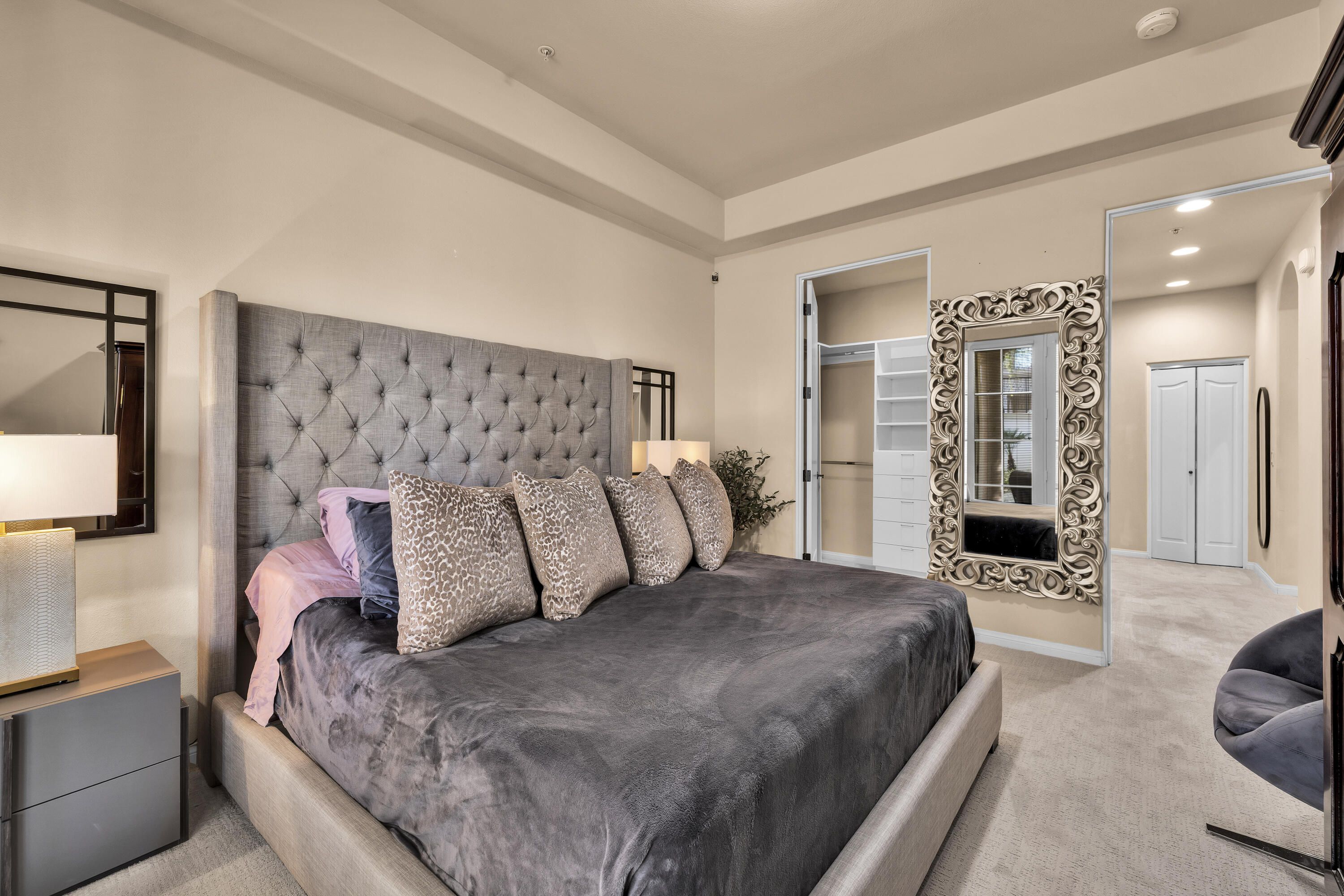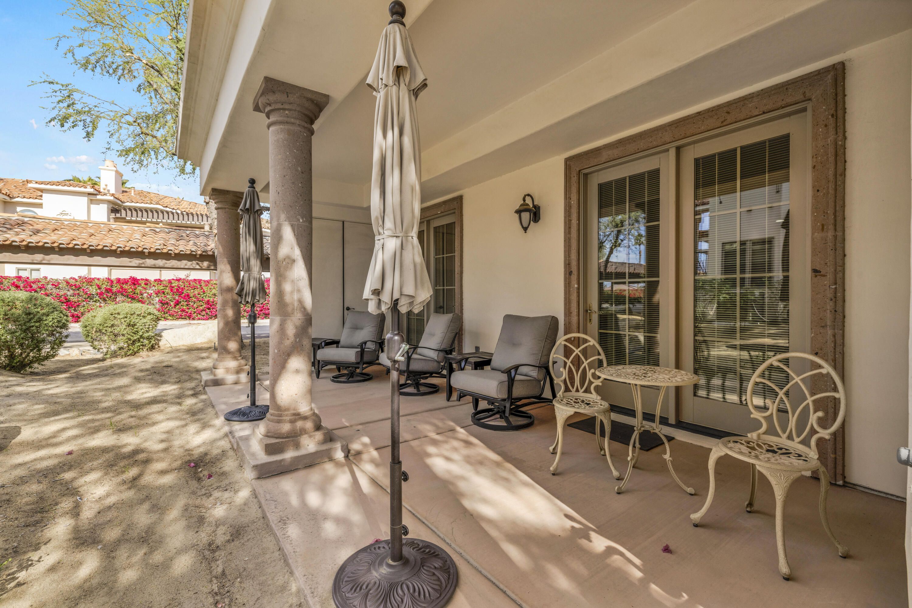 Embrace desert living in this upgraded and inviting 1 bedroom, 1-bathroom great room condo in the prestigious Villa Portofino, an active senior community. Excellent Palm Desert location near shopping, dining and more. Enter the tastefully appointed ground level unit and immediately feel the comforts of home with tray ceilings, New carpet, tile rimmed gas fireplace, wet bar and French doors leading to west facing back patio with peek-a-boo mountain views. Spacious kitchen has granite slab counters, stainless steel appliances. Nice tile floors, plantation shutters, pantry, breakfast nook with morning sunshine plus breakfast bar. Master bedroom with southern mountain view and walk-in closet. Bathroom with stylish step in shower, soaking tub, two vanities with granite counters. Stacked washer and dryer. Newer Trane air conditioner. 1 assigned covered carport space. Furnished per inventory list. Villa Portofino has a wonderful community area. A barbecue area, with panoramic mountain views, Start enjoying the good life. Villa Portofino offers an unmatched lifestyle with a 30,000 sq. ft. clubhouse boasting two restaurants, a private theater, fitness center, game room, pool & spa, bocce ball, shuffleboard, and a vibrant social calendar. HOA dues cover cable, water, trash, landscaping and clubhouse access. Located minutes from El Paseo's luxury shopping and dining, Eisenhower Medical Center, and Bristol Farms. Easy to show. 55 and over.