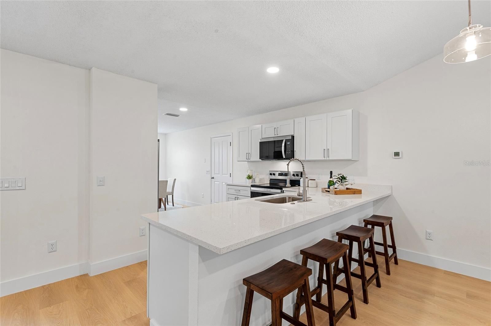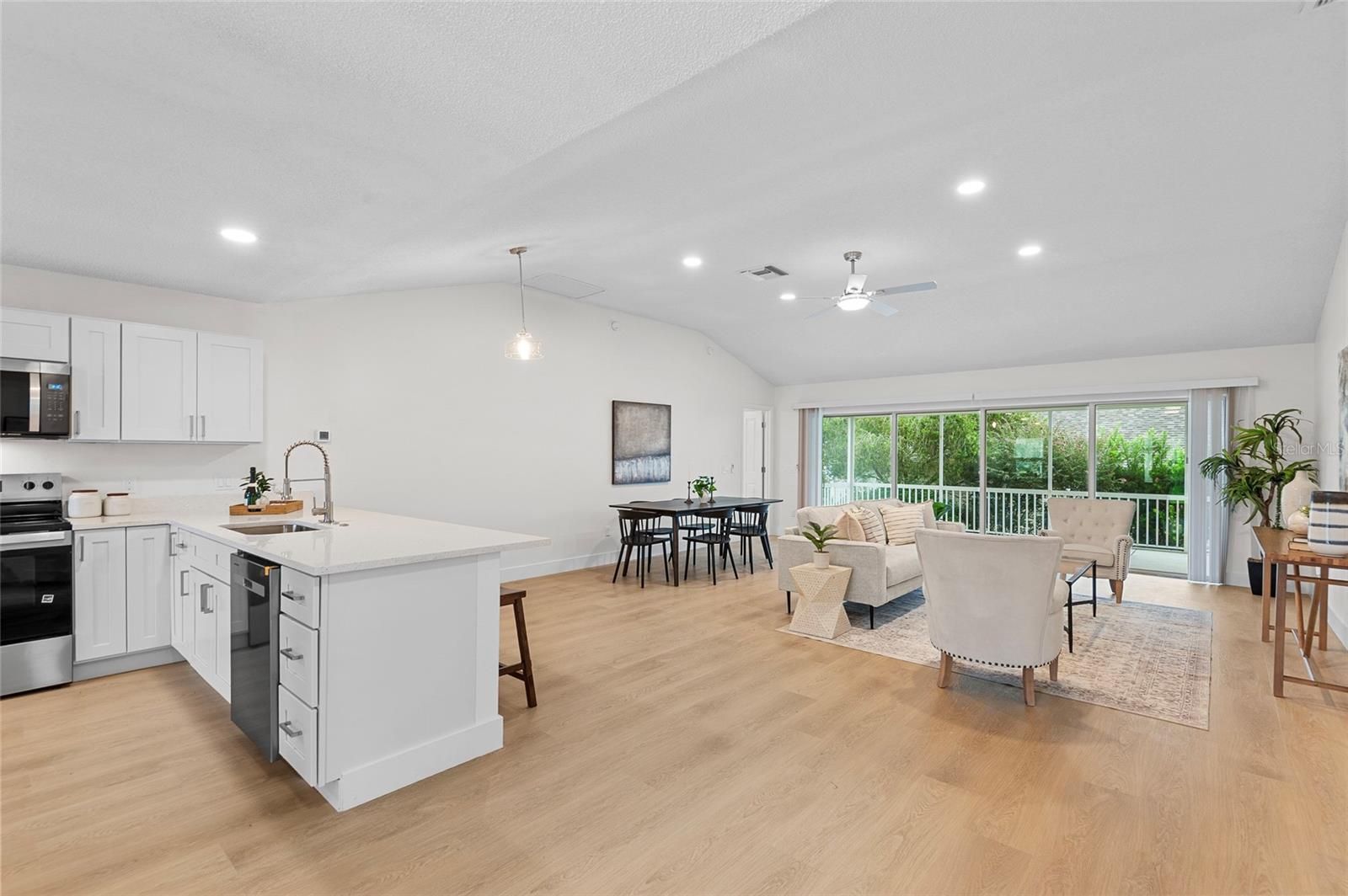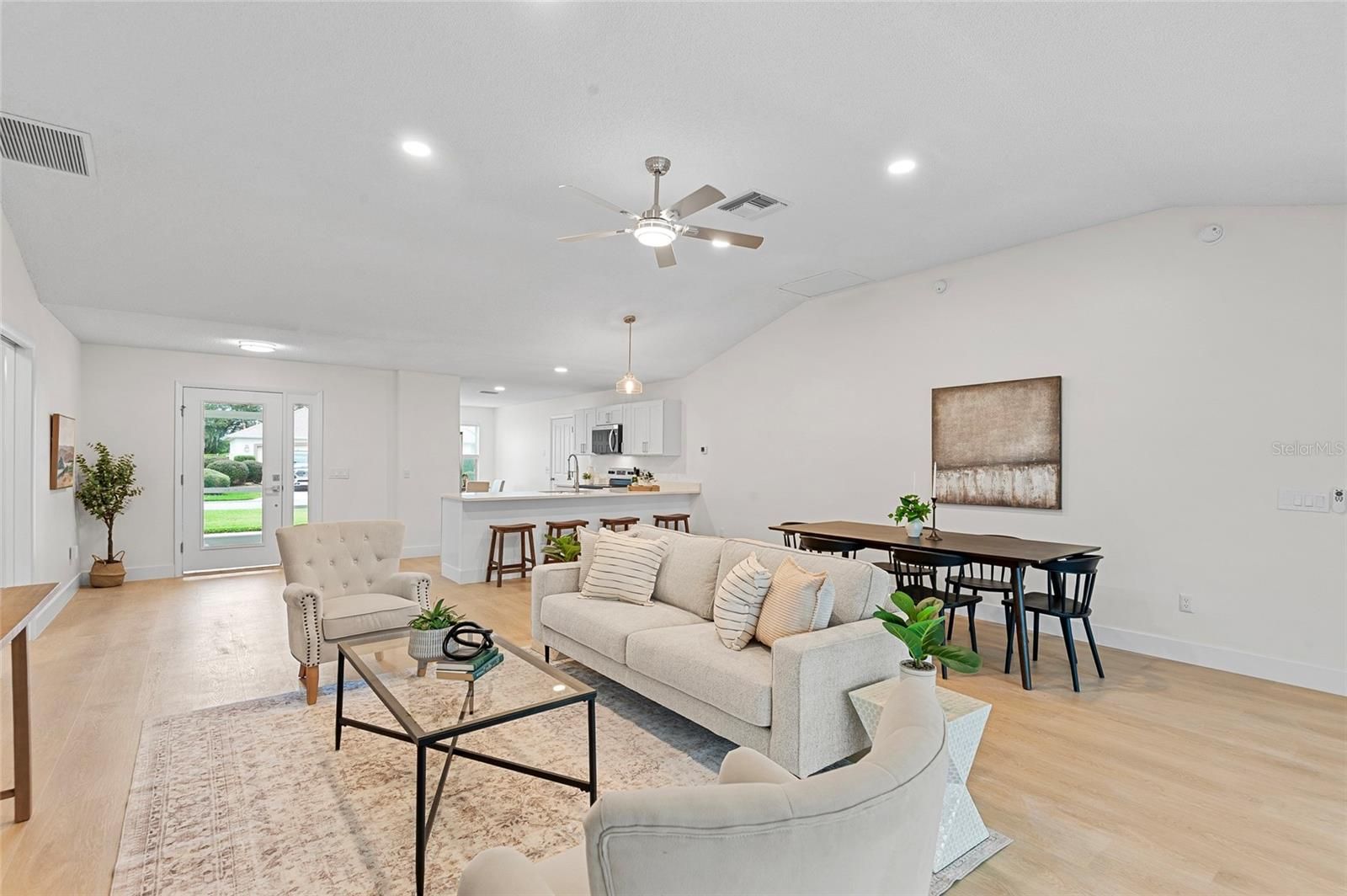 Experience modern comfort and peace of mind in this fully renovated 3-bedroom, 2-bath single-family home, thoughtfully designed for effortless living. The home has been completely updated, featuring brand-new waterproof luxury vinyl plank flooring and fresh, modern light fixtures inside and out. The bright, open kitchen boasts new cabinetry, quartz countertops, and updated fixtures, creating a welcoming space for both cooking and entertaining. Both bathrooms have been fully remodeled with walk-in showers, new tile, and stylish vanities, offering comfort, accessibility, and a clean contemporary look. Additional highlights include a large screened-in back porch—perfect for relaxing—as well as a spacious 2-car garage with ample storage. Situated in a quiet 55+ community, this move-in-ready home combines modern upgrades with low-maintenance living, making it an ideal choice for a safe, comfortable, and worry-free lifestyle.