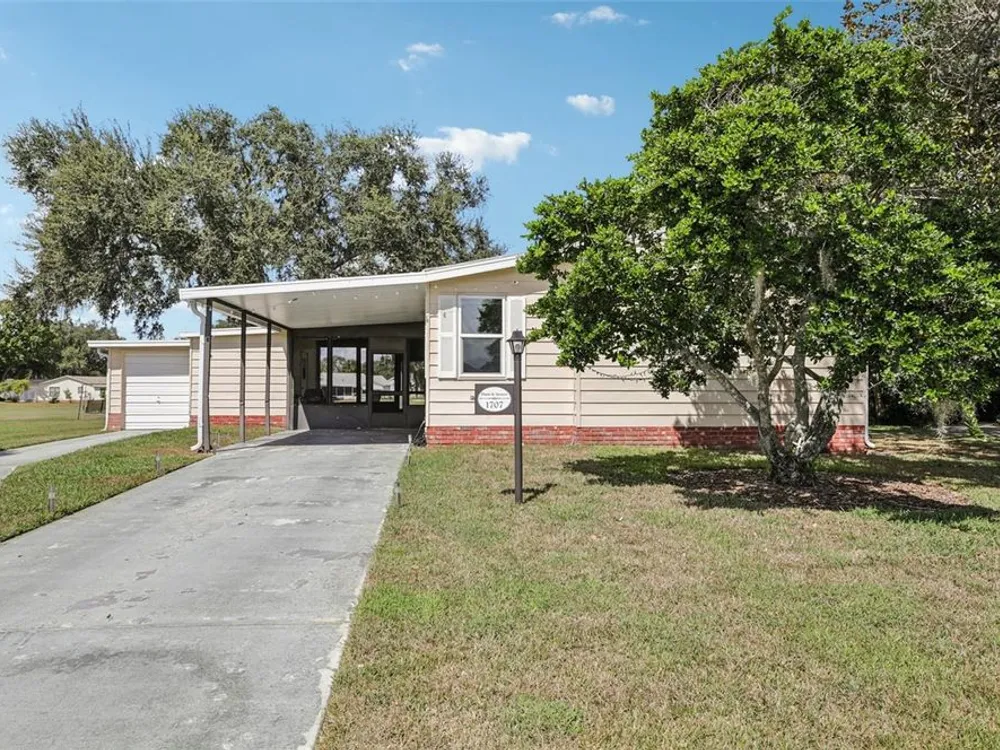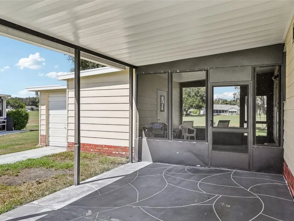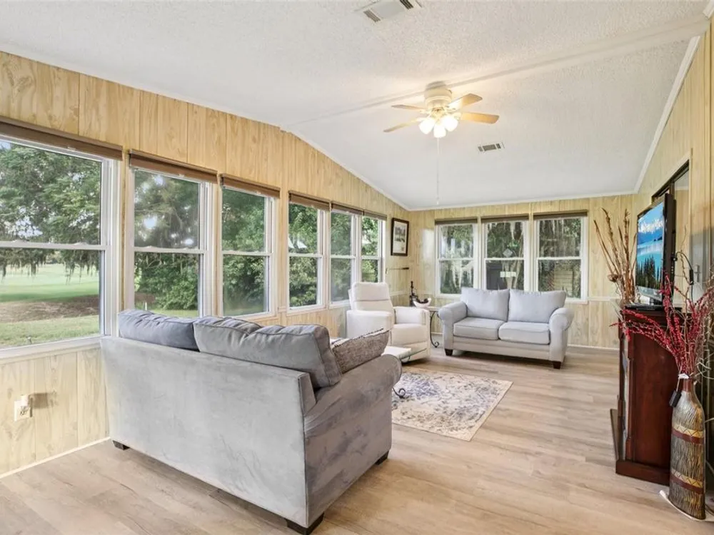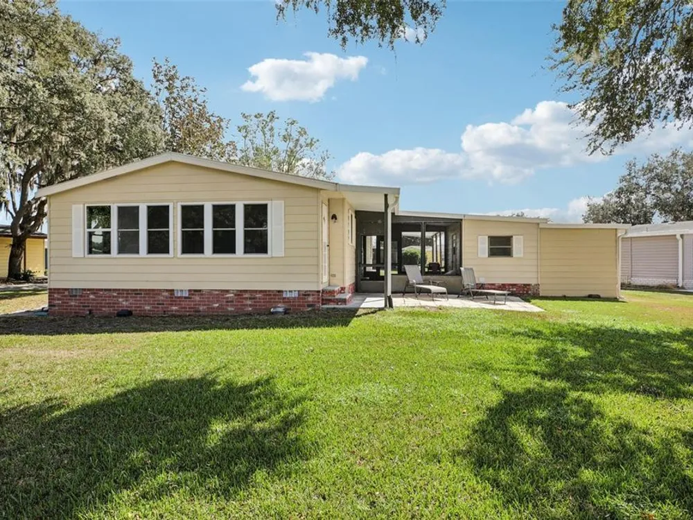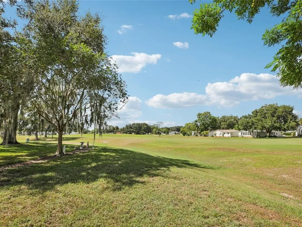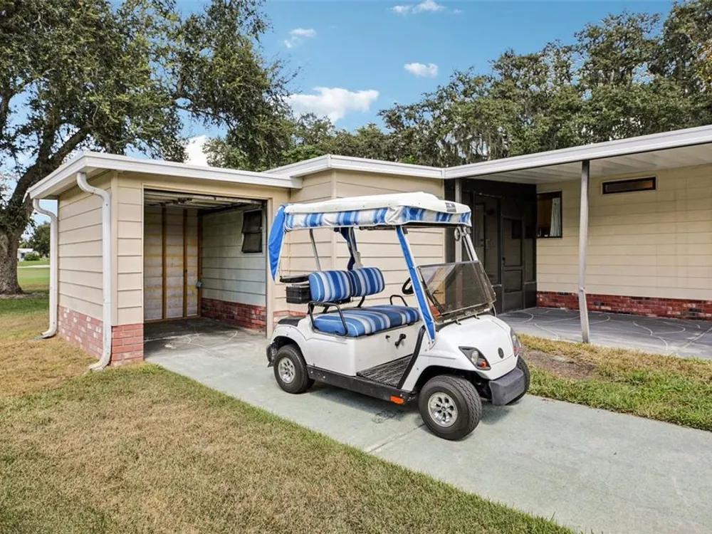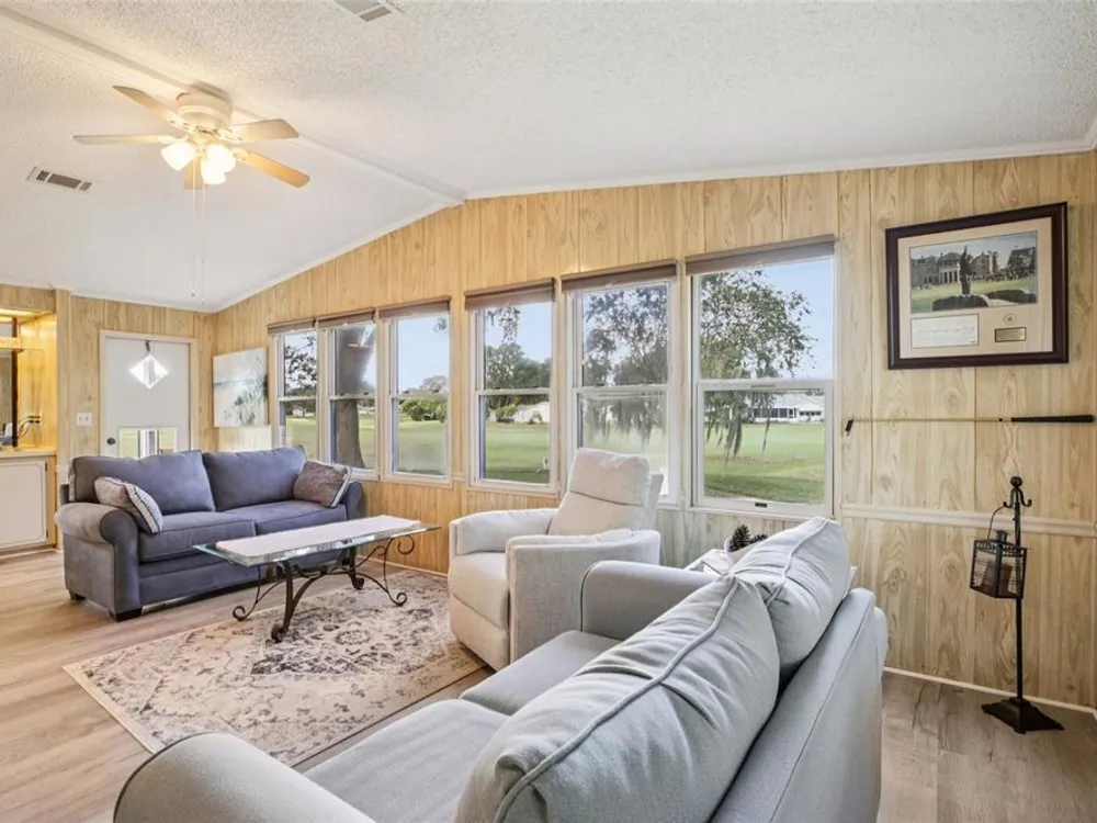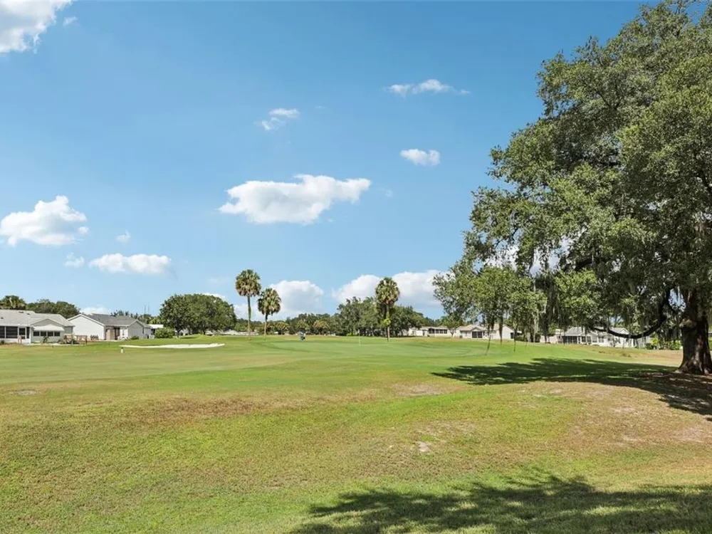 ATTENTION GOLF LOVERS!!! Partially Furnished 2/2 GOLF FRONT HOME on a PIE-SHAPED LOT with a GOLF CART GARAGE on the Orange Blossom Championship Golf Course in The Villages!!! Surrounded by MATURE LANDSCAPING, this lovely, well-maintained home is located on a PEACEFUL CUL-DE-SAC on the Historic Side of The Villages. Enjoy BREATHTAKING PANORAMIC VIEWS of one of THE most picturesque golf courses from your back patio or from the Florida Room which has a built-in wet bar and an electric fireplace. New, light gray laminate flooring throughout the home brightens up the entire living space. NO CARPET. There are also newer windows, a newer AC (2022) and water heater (2023). 2009 Yamaha Gas Golf Cart and some furniture are negotiable. Enjoy this piece of paradise and all the WORLD-CLASS AMENITIES that The Villages is famous for: golf, pickleball, tennis, pools, classes and activities at the recreation centers and nightly live entertainment to name just a few! Schedule your private showing today!