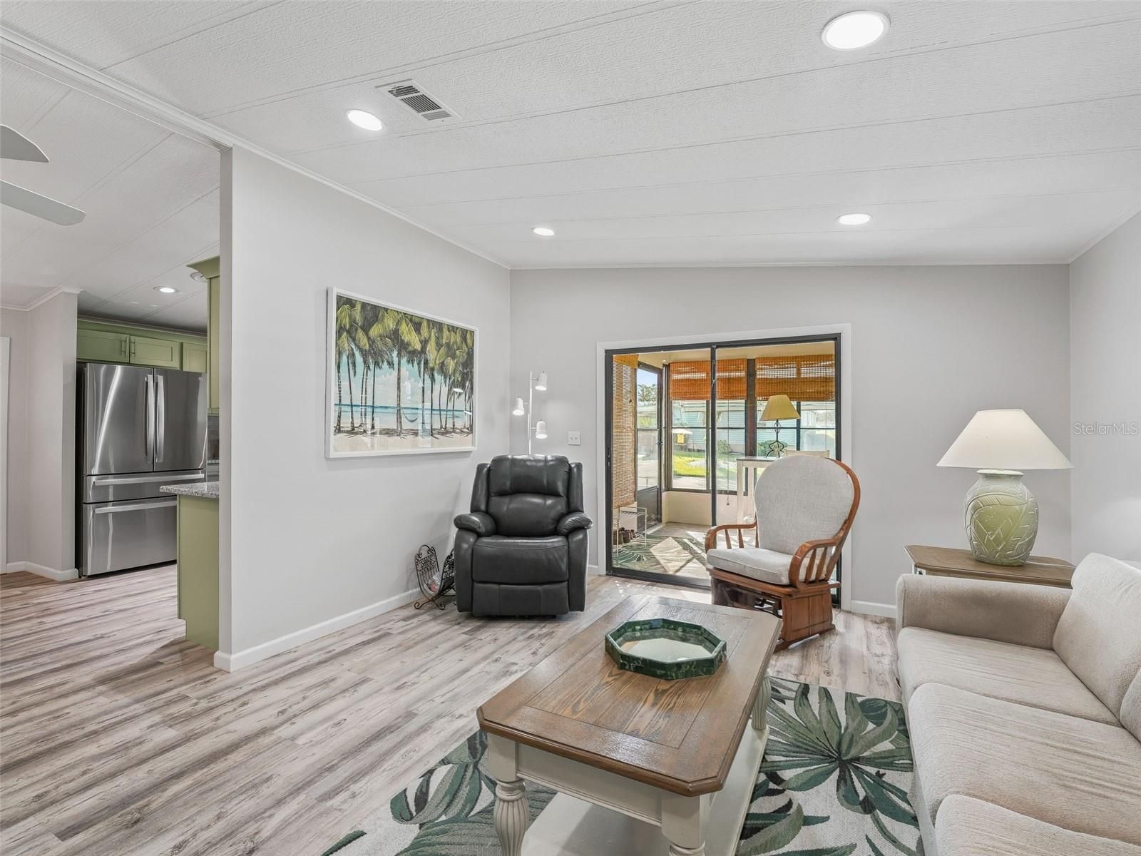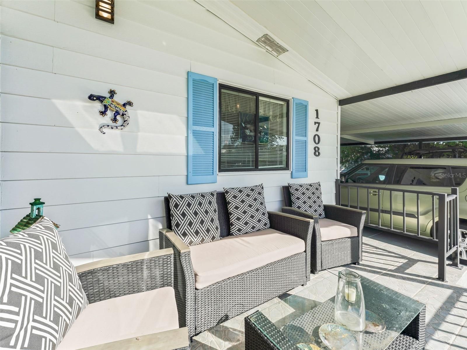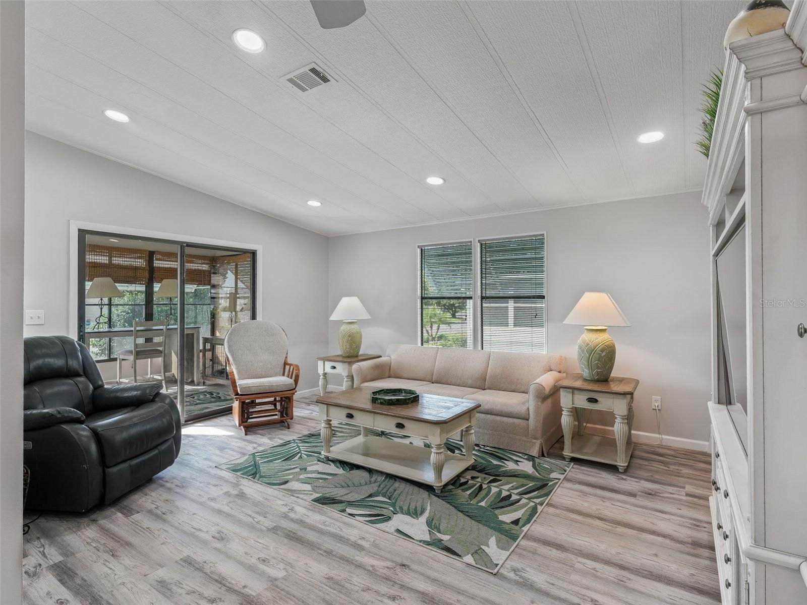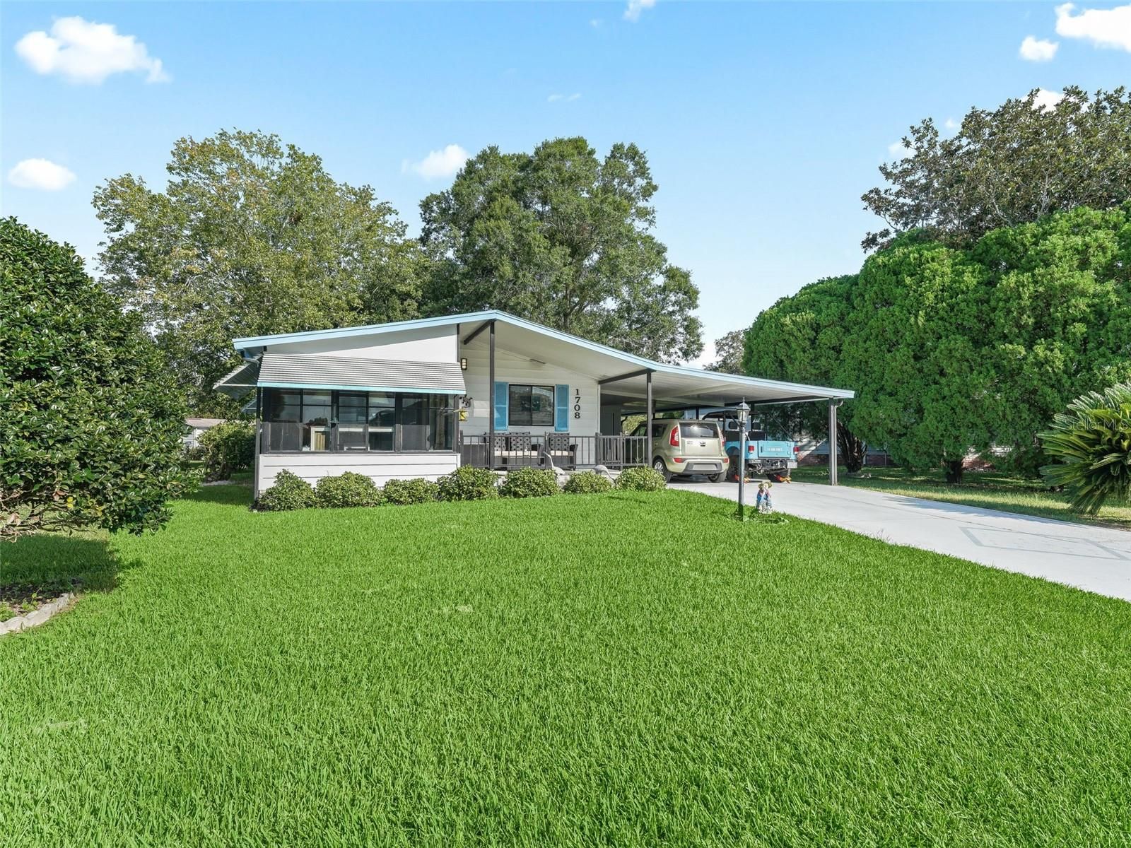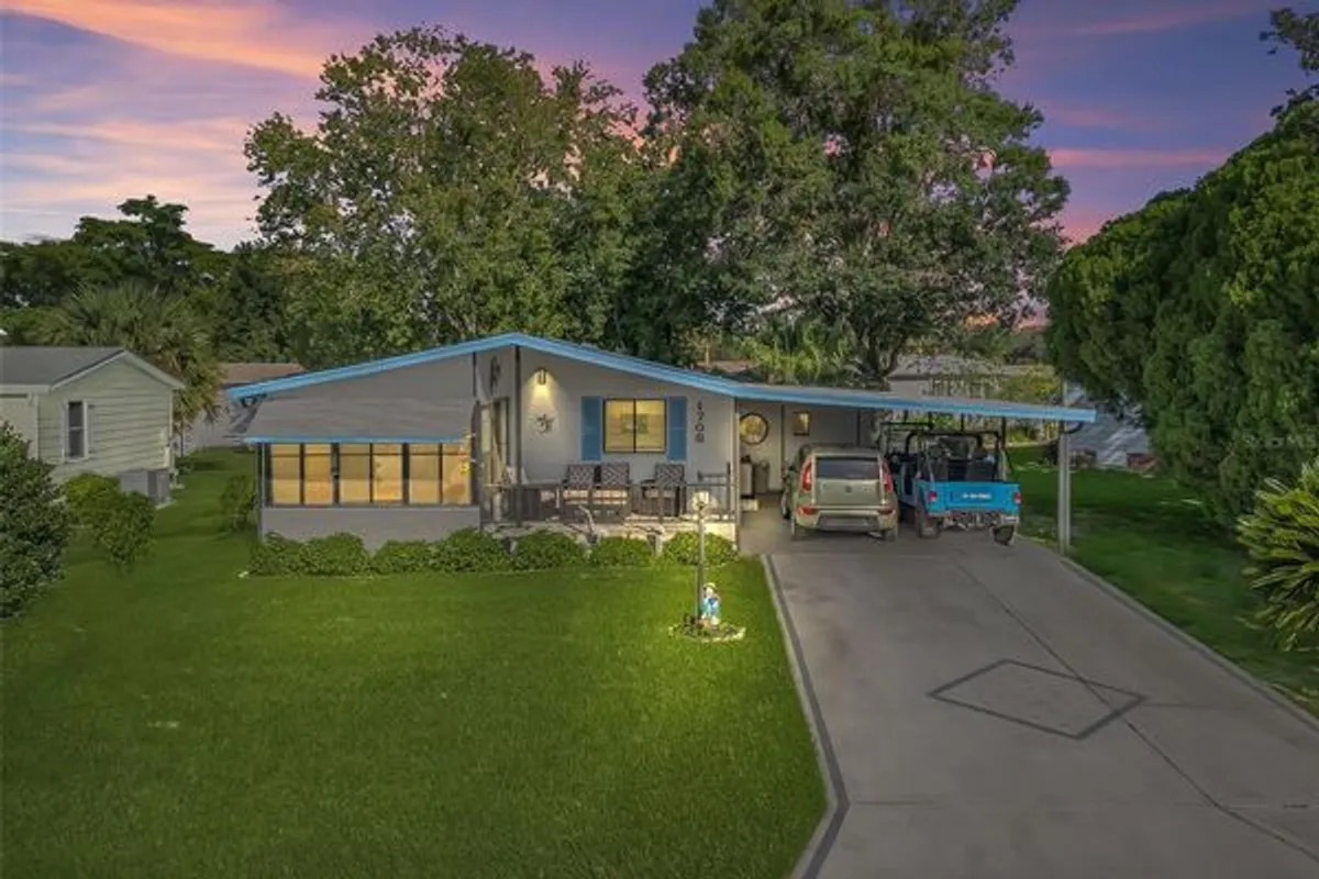 Welcome to this super cute, NICELY UPDATED!!!!and fully furnished home located in the Historic Side of The Villages. From the moment you step inside, you’ll appreciate the freshly painted interior, luxury vinyl plank flooring throughout, and thoughtful upgrades that make this home truly move-in ready. The kitchen has new wooden cabinets with dovetail drawers, a convenient lazy Susan, granite countertops, a stylish tile backsplash, stainless steel appliances, and a modern stainless steel sink complete with drying racks and a cutting board. Both bathrooms have been tastefully updated with new vanities and sinks, and the home includes a spacious Florida room, ideal for relaxing or entertaining guests. The primary bedroom has a built-in feature wall with an electric fireplace and wall-mounted TV, creating a cozy retreat. Outside, the large carport provides plenty of space for multiple vehicles and includes an inside golf cart garage for added convenience. The laundry area is located in the attached utility room off the carport. This home is the perfect blend of comfort, style, and functionality—schedule your private showing today and see for yourself!! You won't be dissapointed! Roof 2013, HVAC 2016