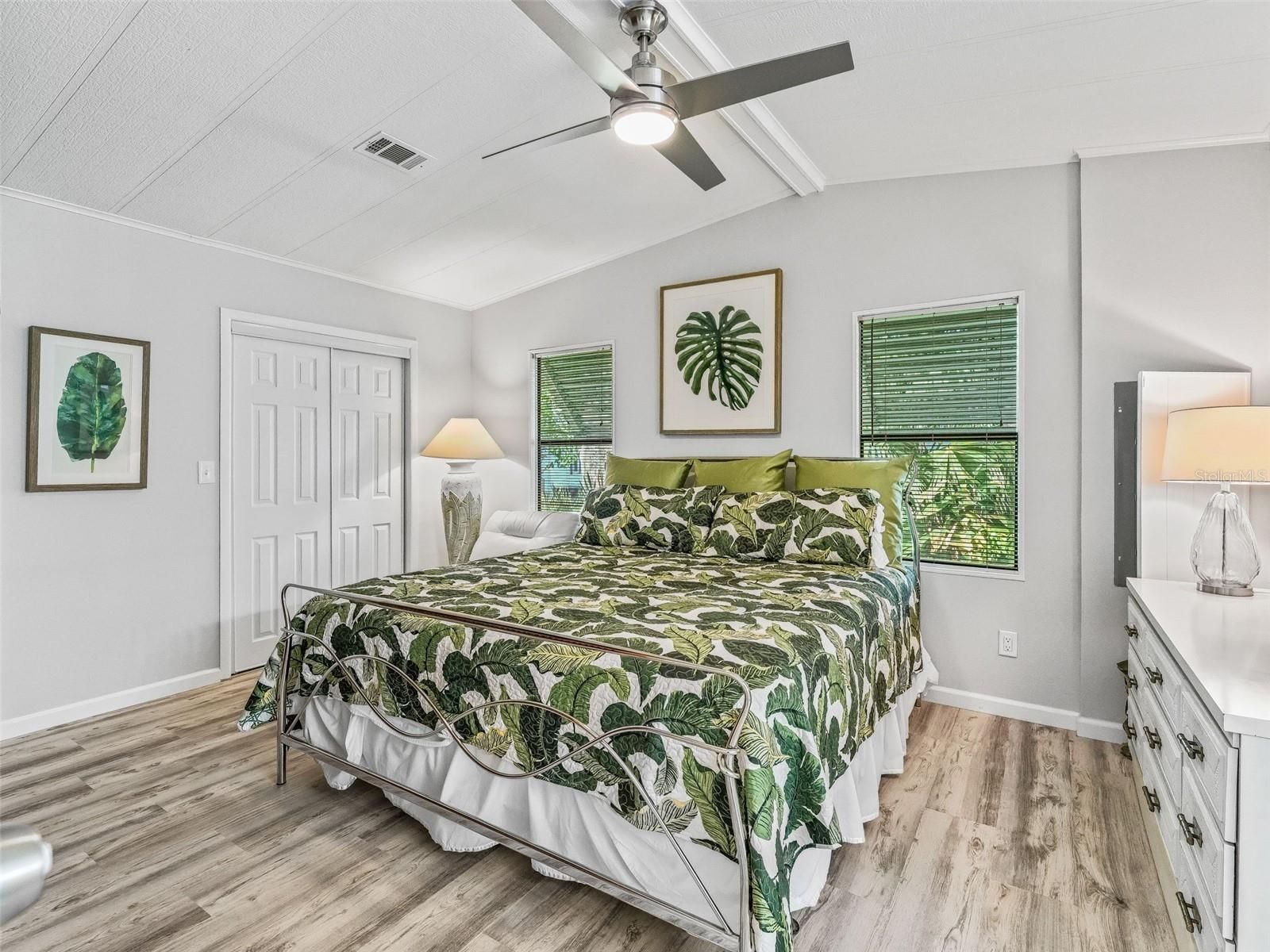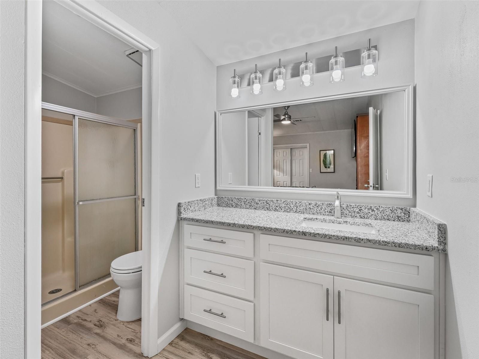 - Ceiling Fan(s), Living/Dining Room, Main Level Primary, Solid-Wood Cabinets, Stone Counters, Thermostat